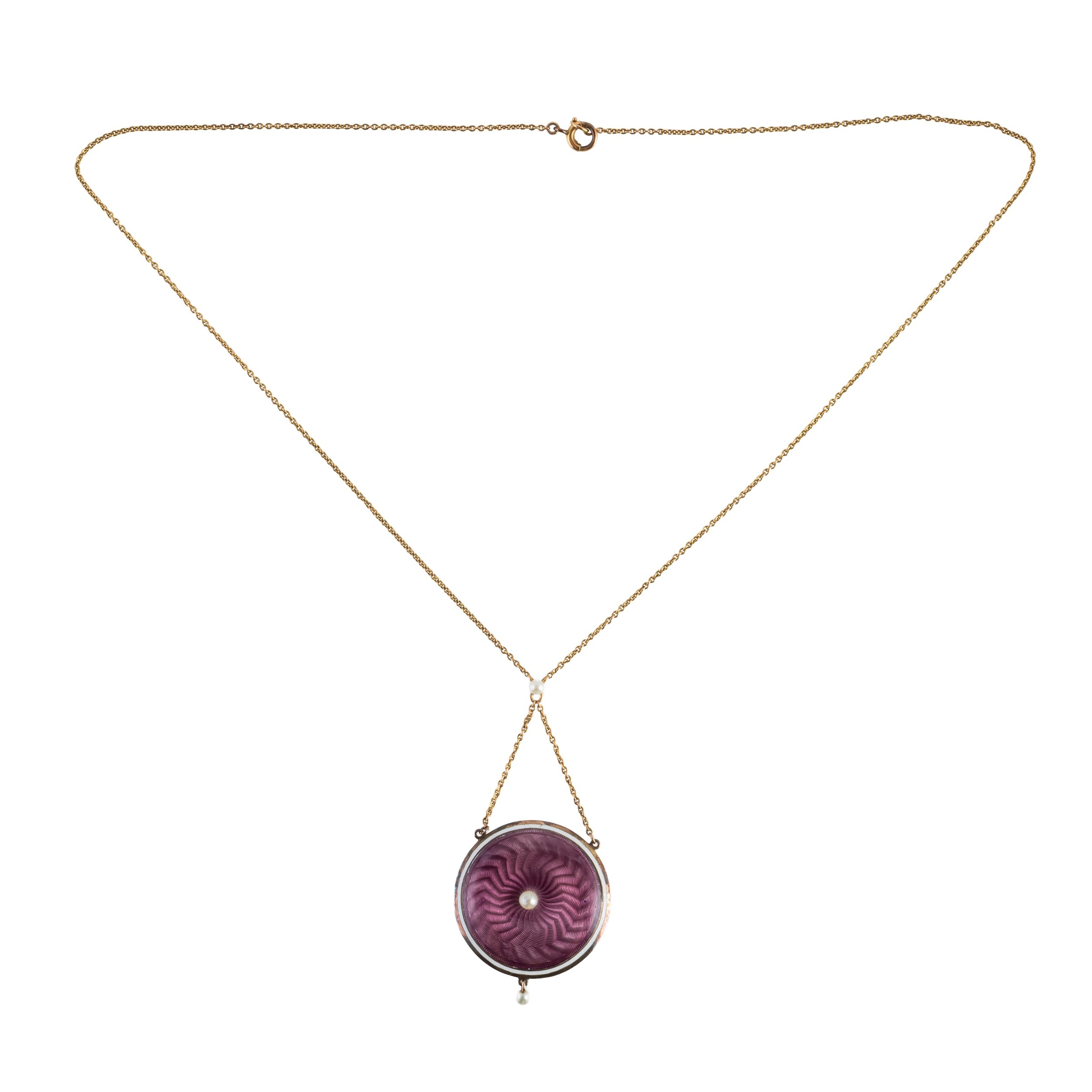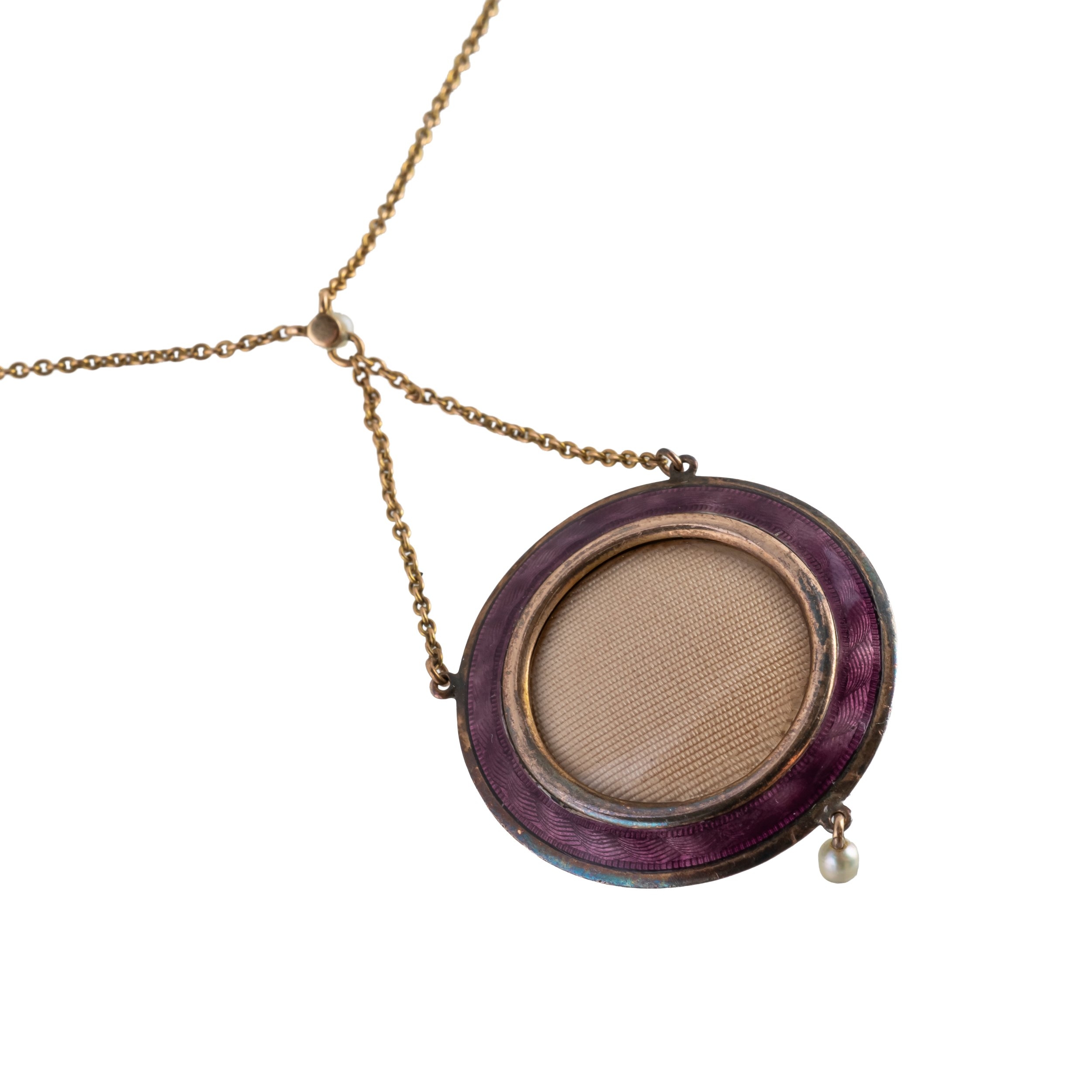 The purple enamel ground with pearl centre, white surround and a pearl drop, the back with glazed locket panel, integrated onto an unmarked chain with further pearl, with a bolt ring clasp, the chain above the drop measures 40cm, the drop itself 5cm, gross weight 8.2 grams
