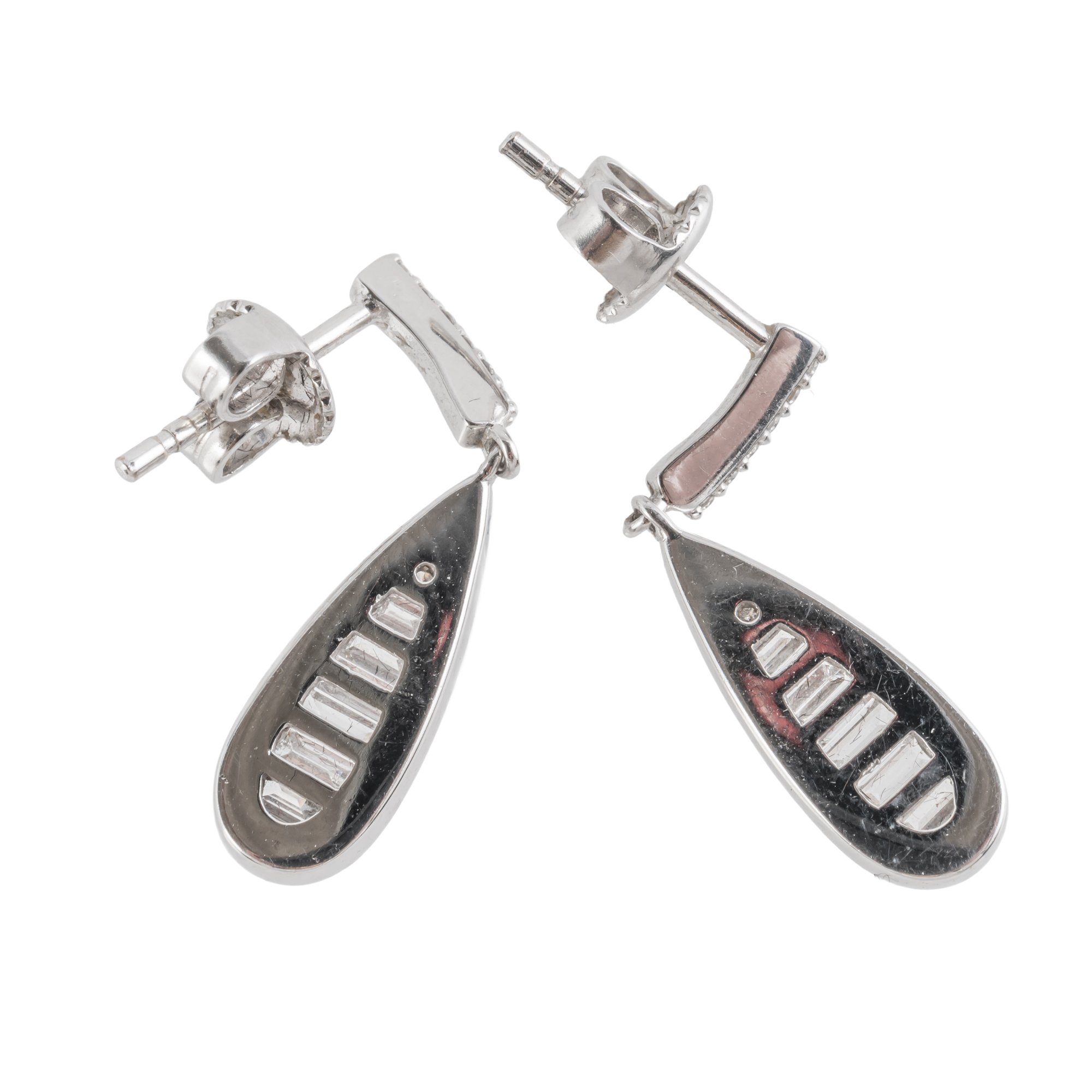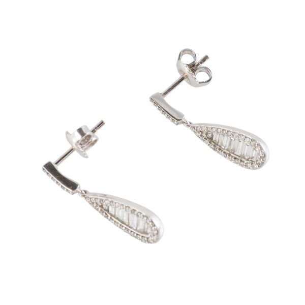 Each in a pear shape, mounted with a row of baguette cut diamonds with a surround of round brilliant cut diamonds, suspended from a further bar of diamonds, in 18ct white gold, with post and butterfly fittings for pierced ears, gross weight 3.2 grams