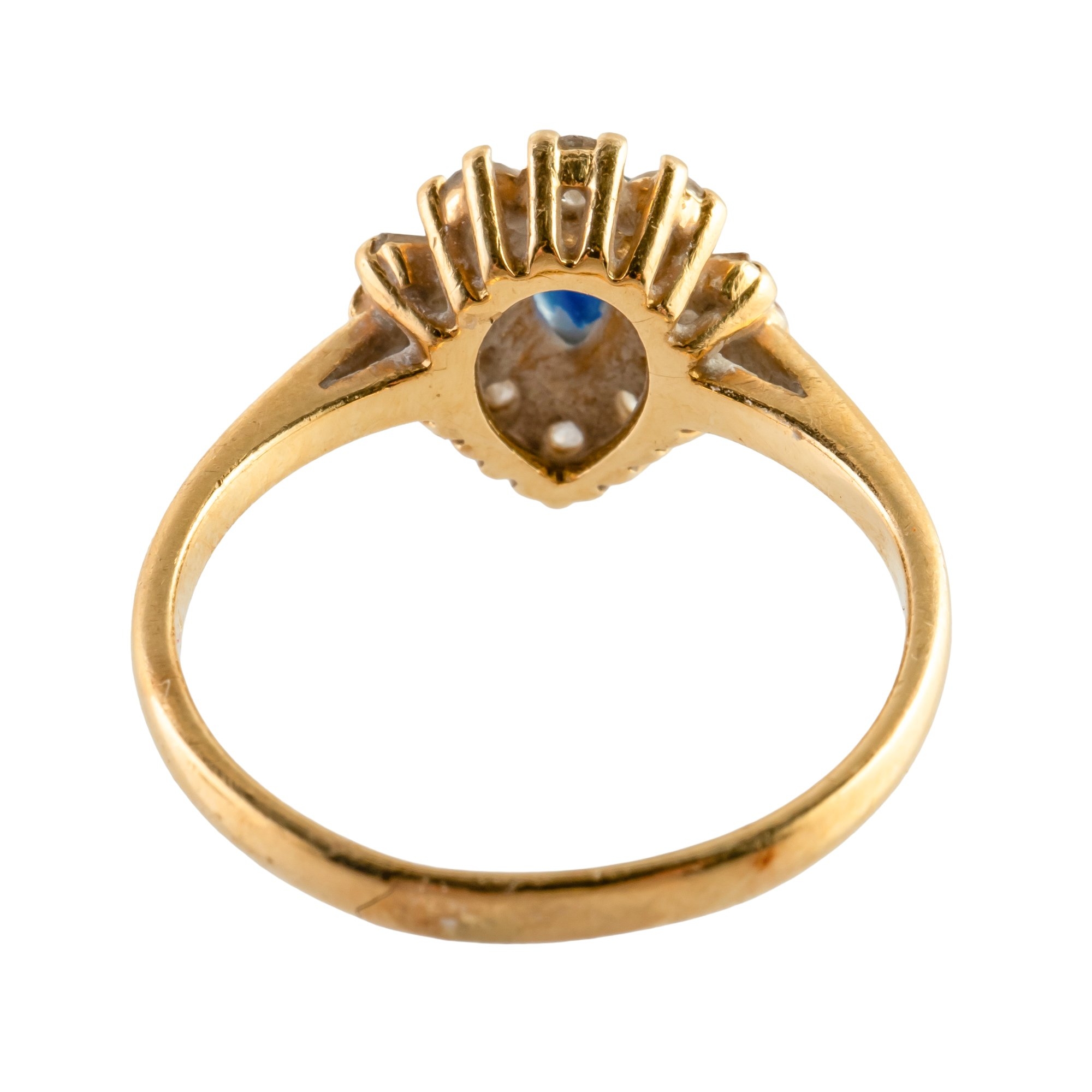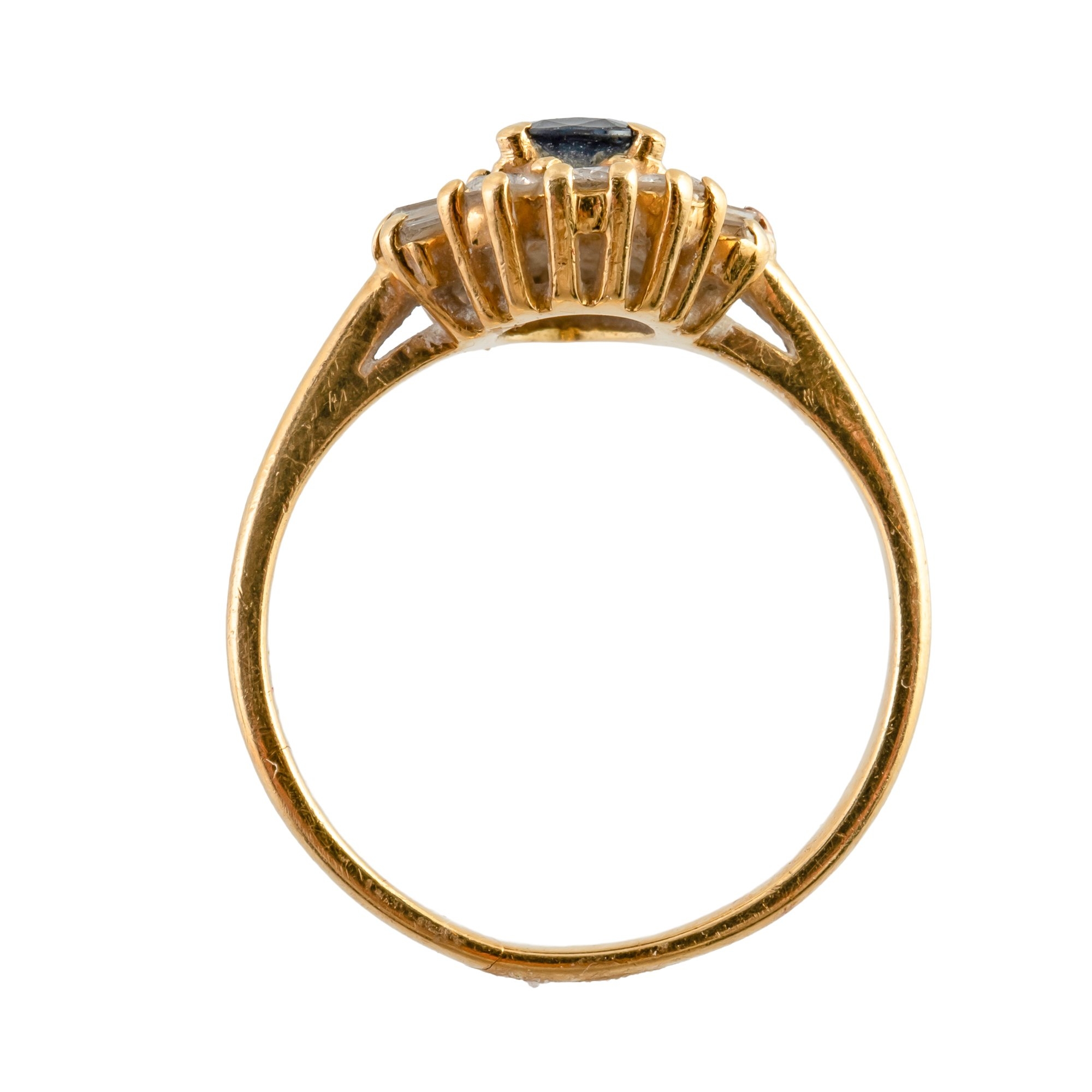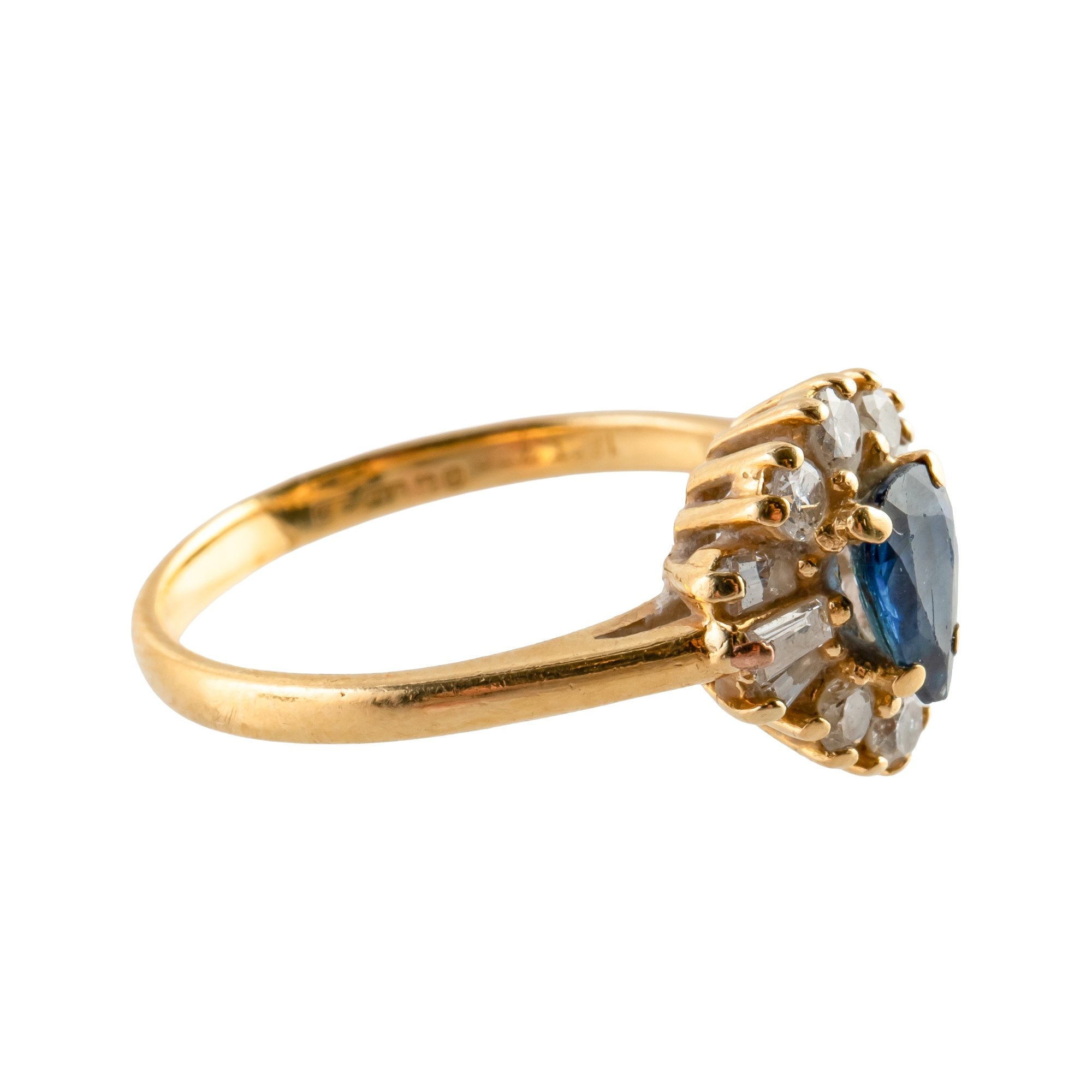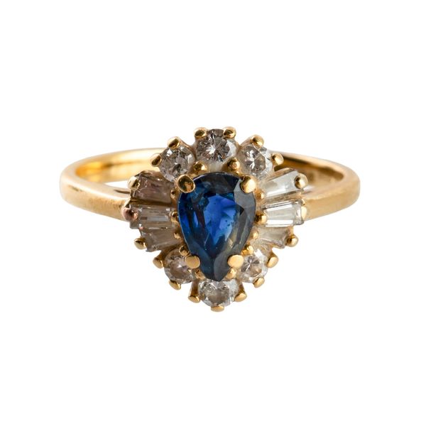 Claw set with a pear shaped sapphire in a surround of six tapered baguette diamonds and with six round brilliant cut diamonds, detailed 18 CT 750, ring size K, gross weight 2.7 grams