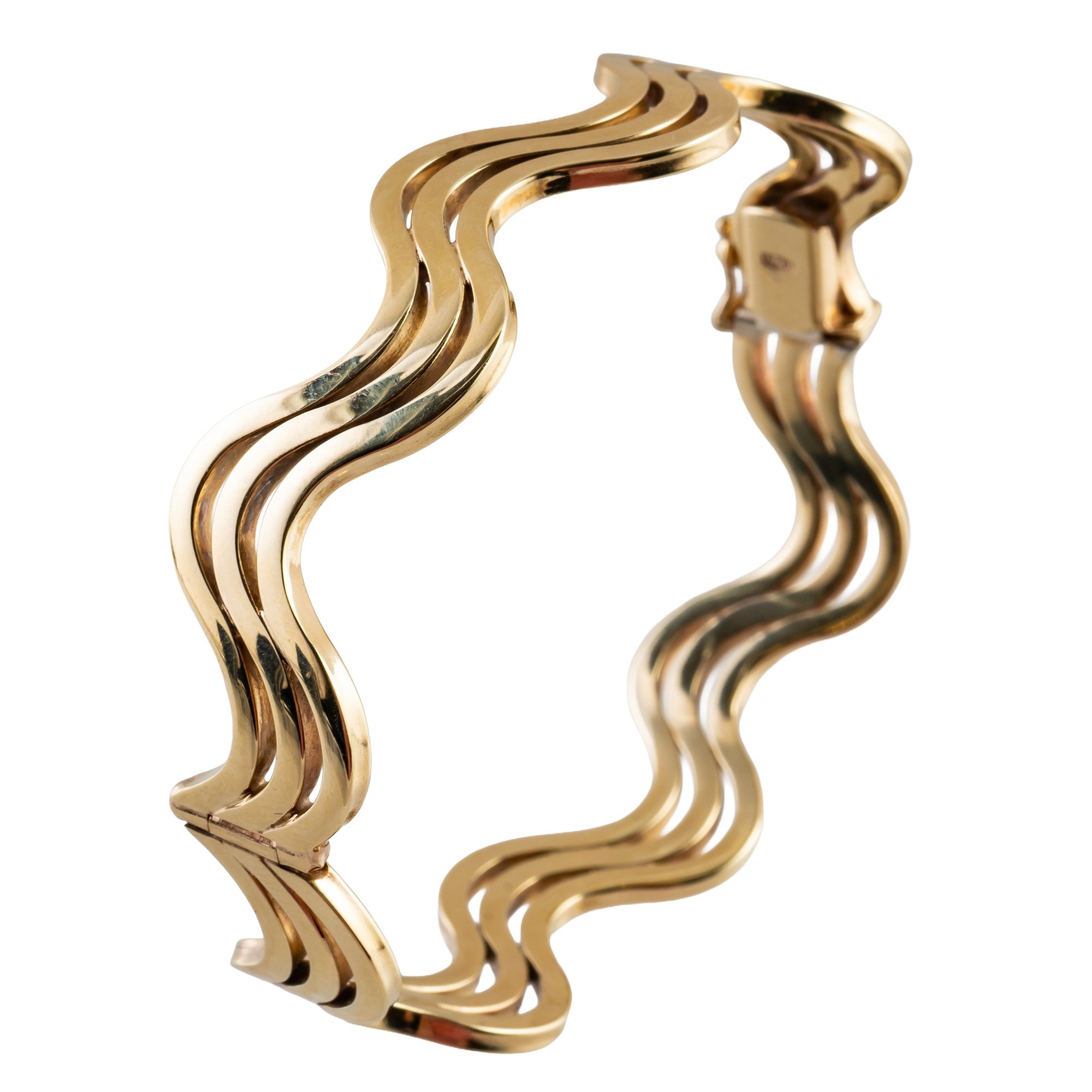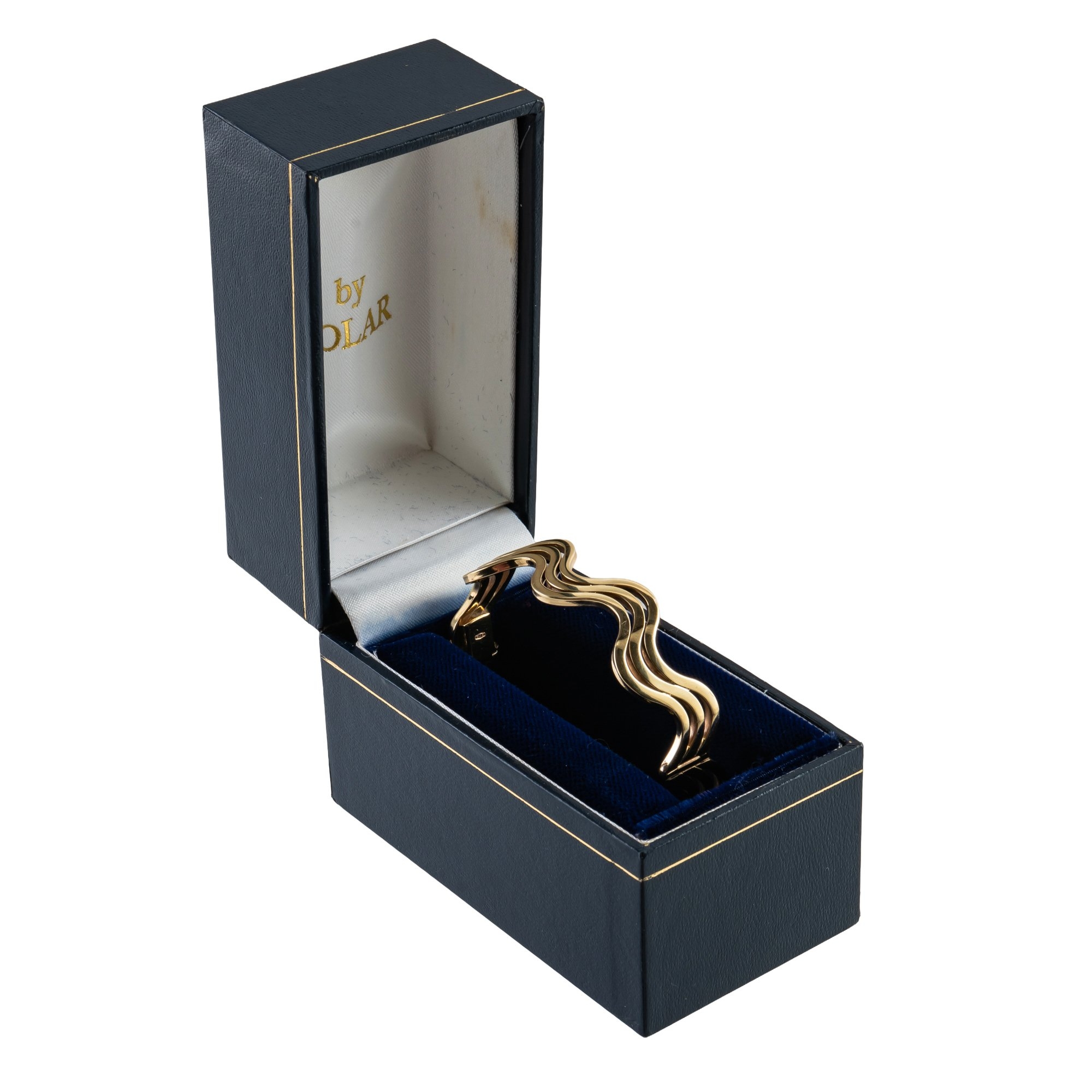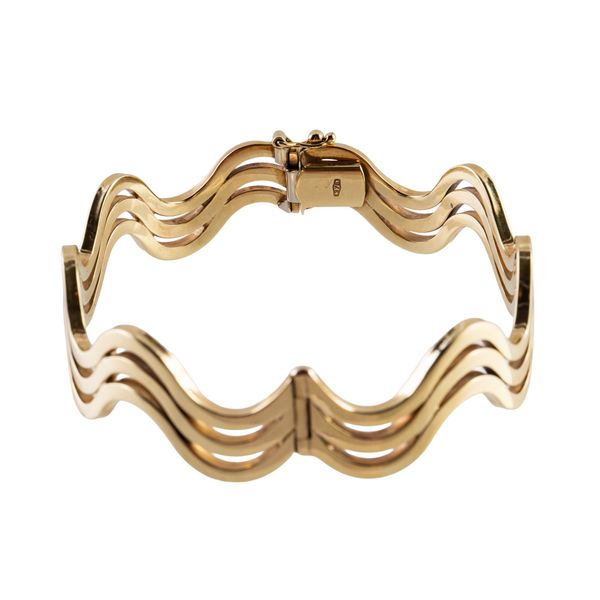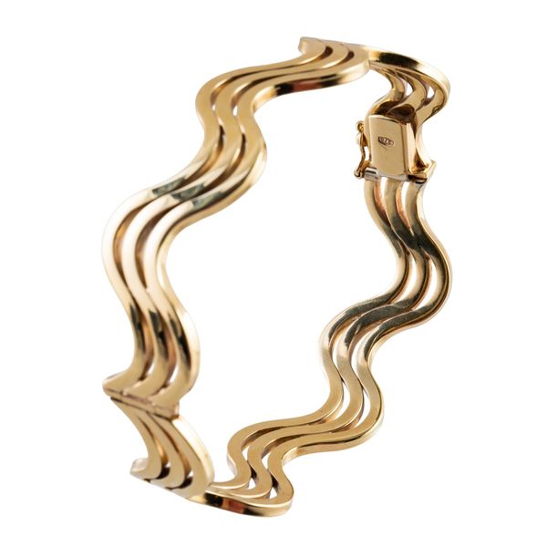 The three row bangle in a wavy design, with box clasp and safety clip, in 9ct gold, measuring 57.9mm x 51.4mm, gross weight 18.5 grams, with a box