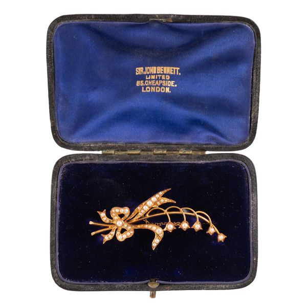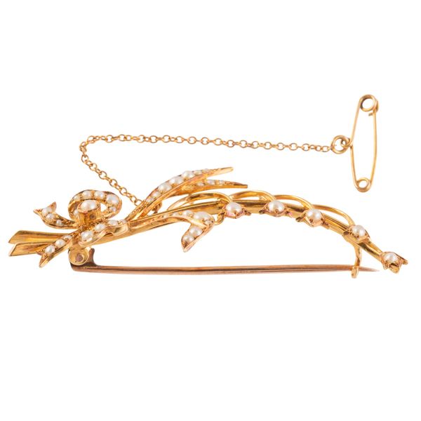 The seed pearls set in a lily of the valley motif tied with a bow, the reverse marked for 15ct, measuring 60mm x 24.7mm, with a safety chain, gross weight 6.7 grams, with a box