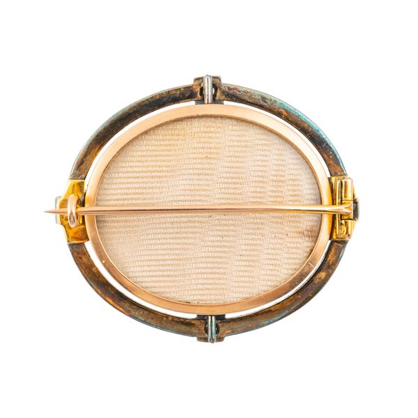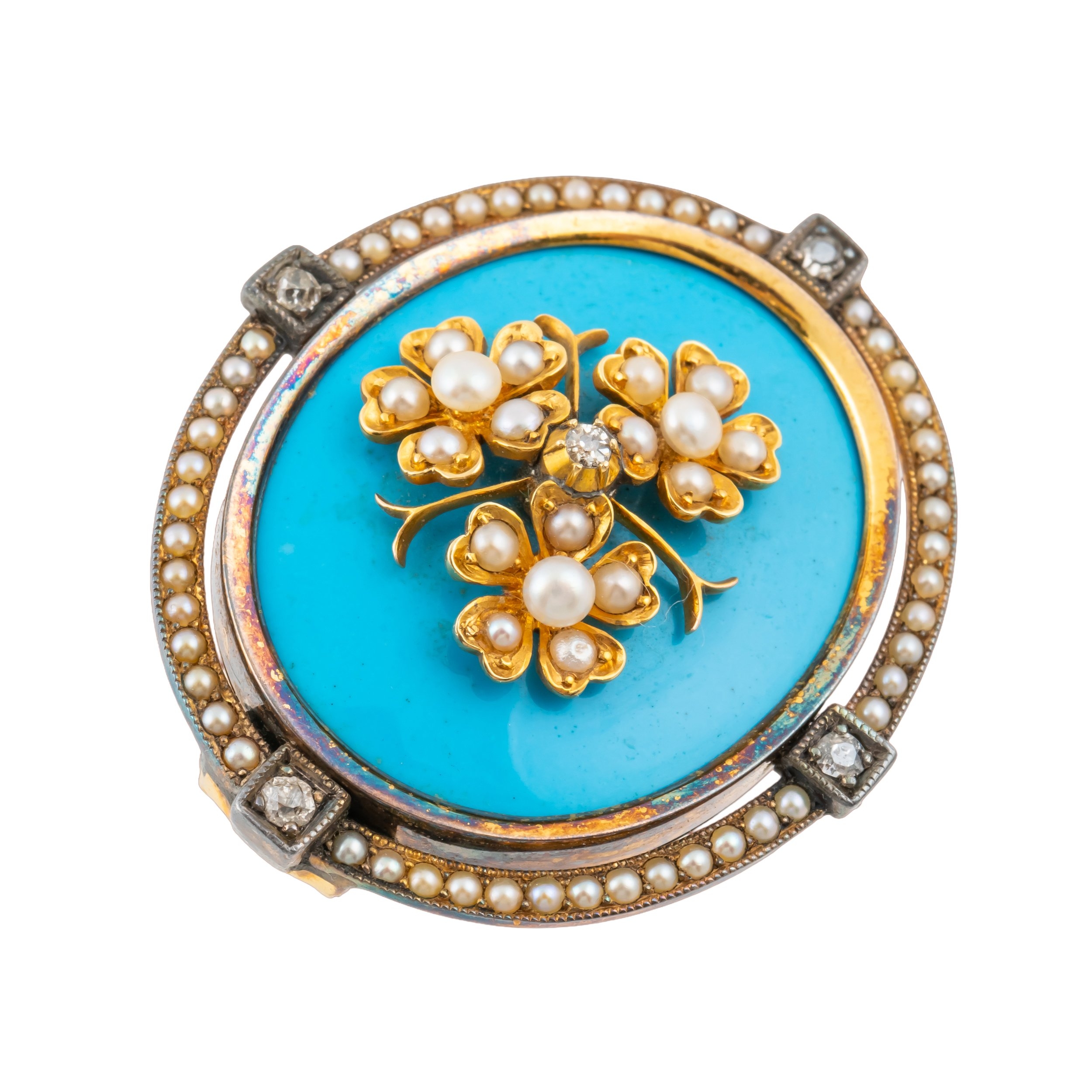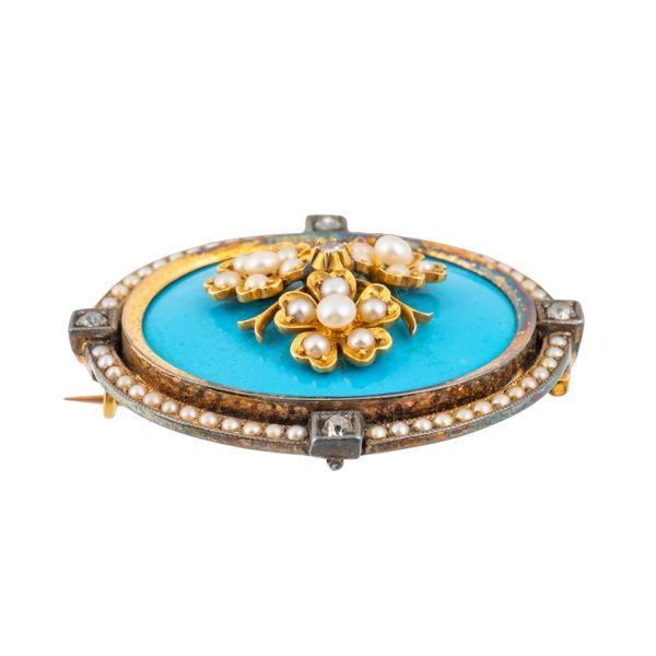 The body set with a oval turquoise panel, with applied pearl and diamond flowers, with a rim of seed pearls and diamonds set at cardinal points, the back with glazed compartment, in unmarked silver and gold, measuring 39.2mm x 34.5mm, gross weight 18.8 grams