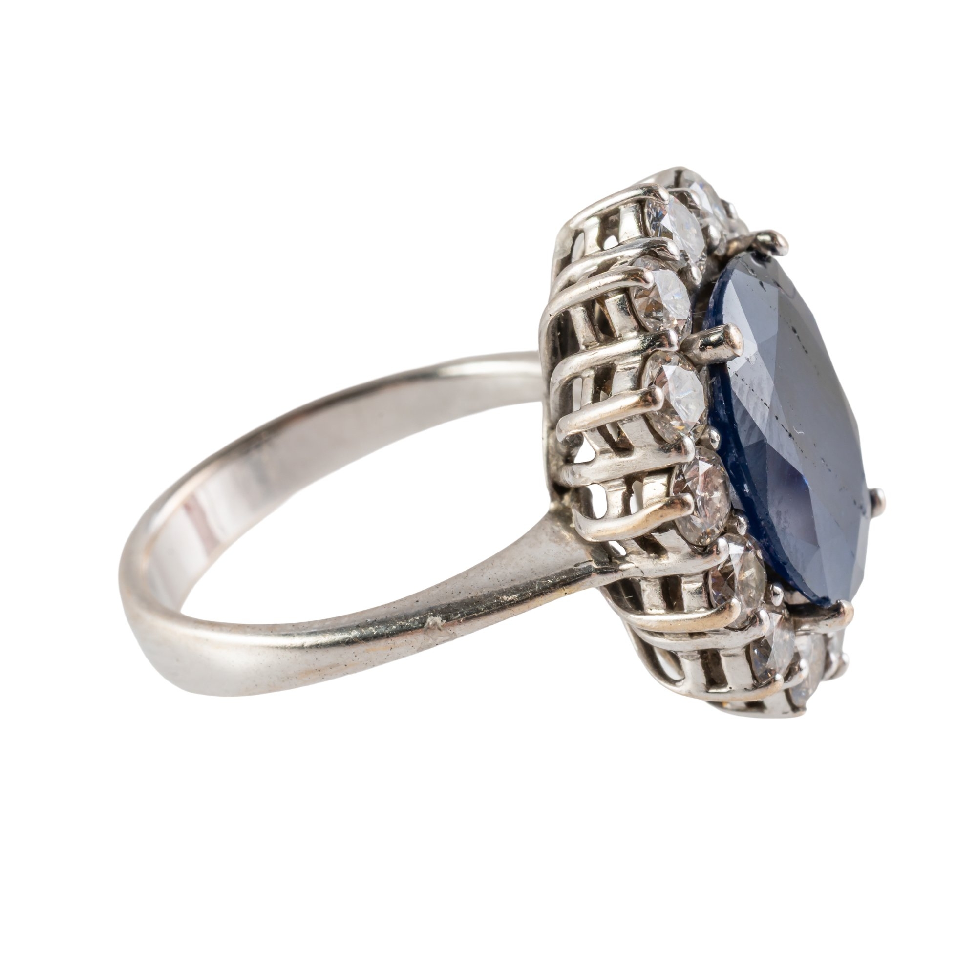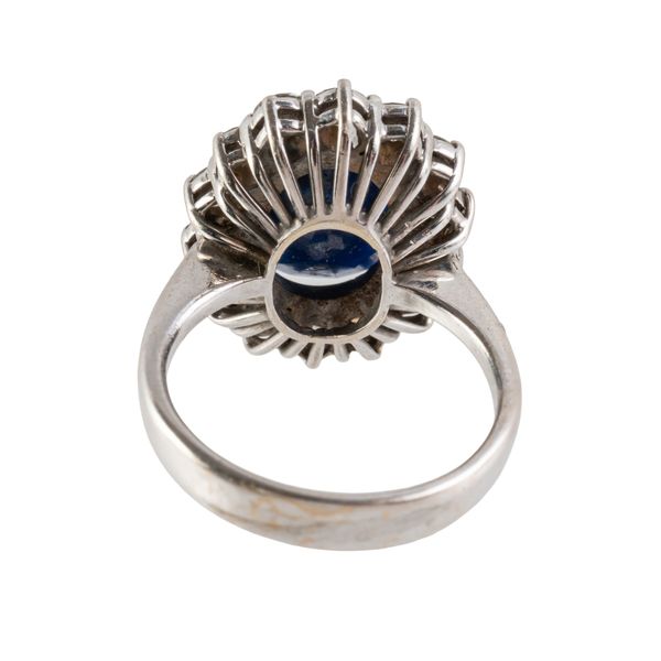 Mounted with an oval cut sapphire weighing an estimated 5.48 carats, claw set with a surround of round brilliant cut diamonds, in 18ct white gold, size N, gross weight 8.8 grams, with a box
