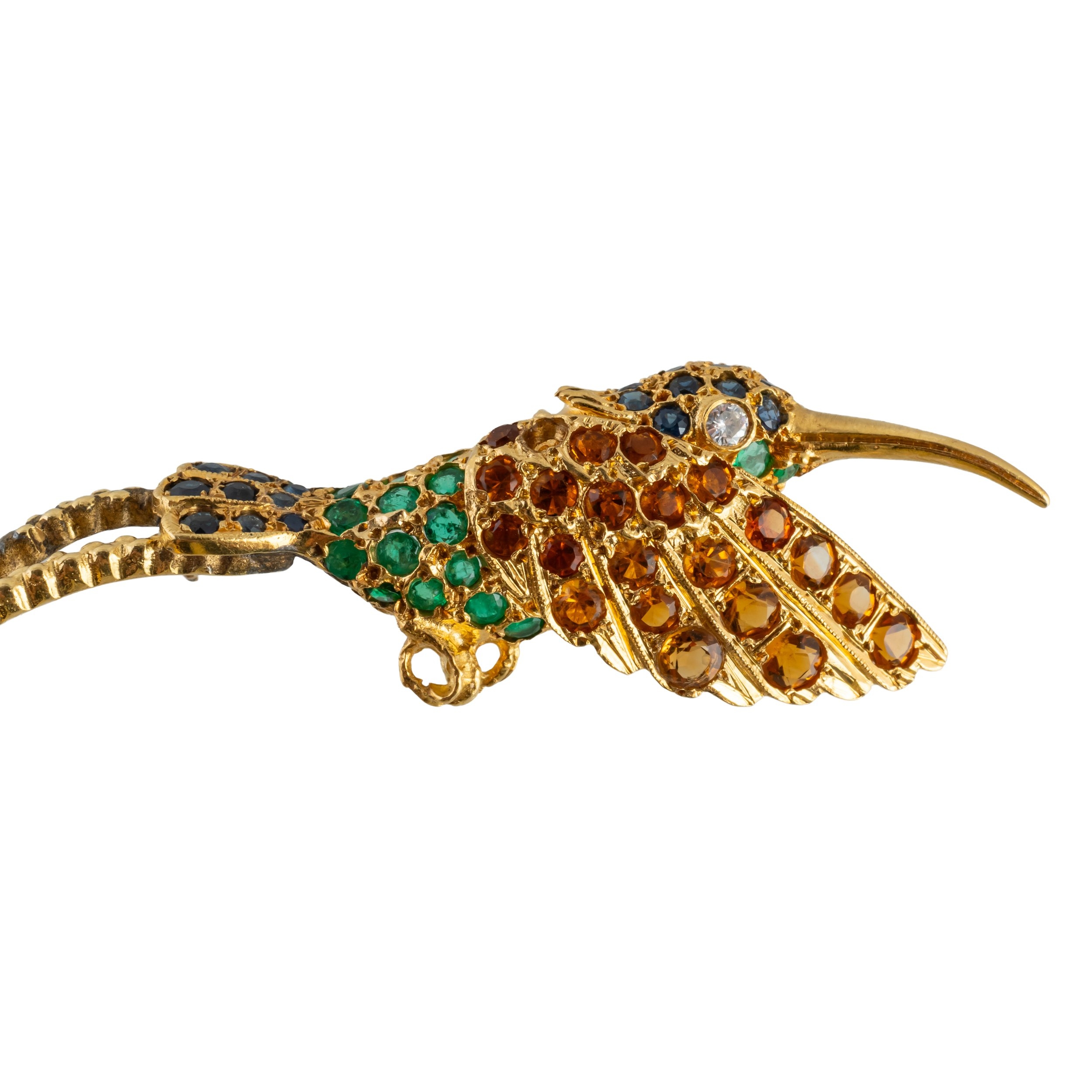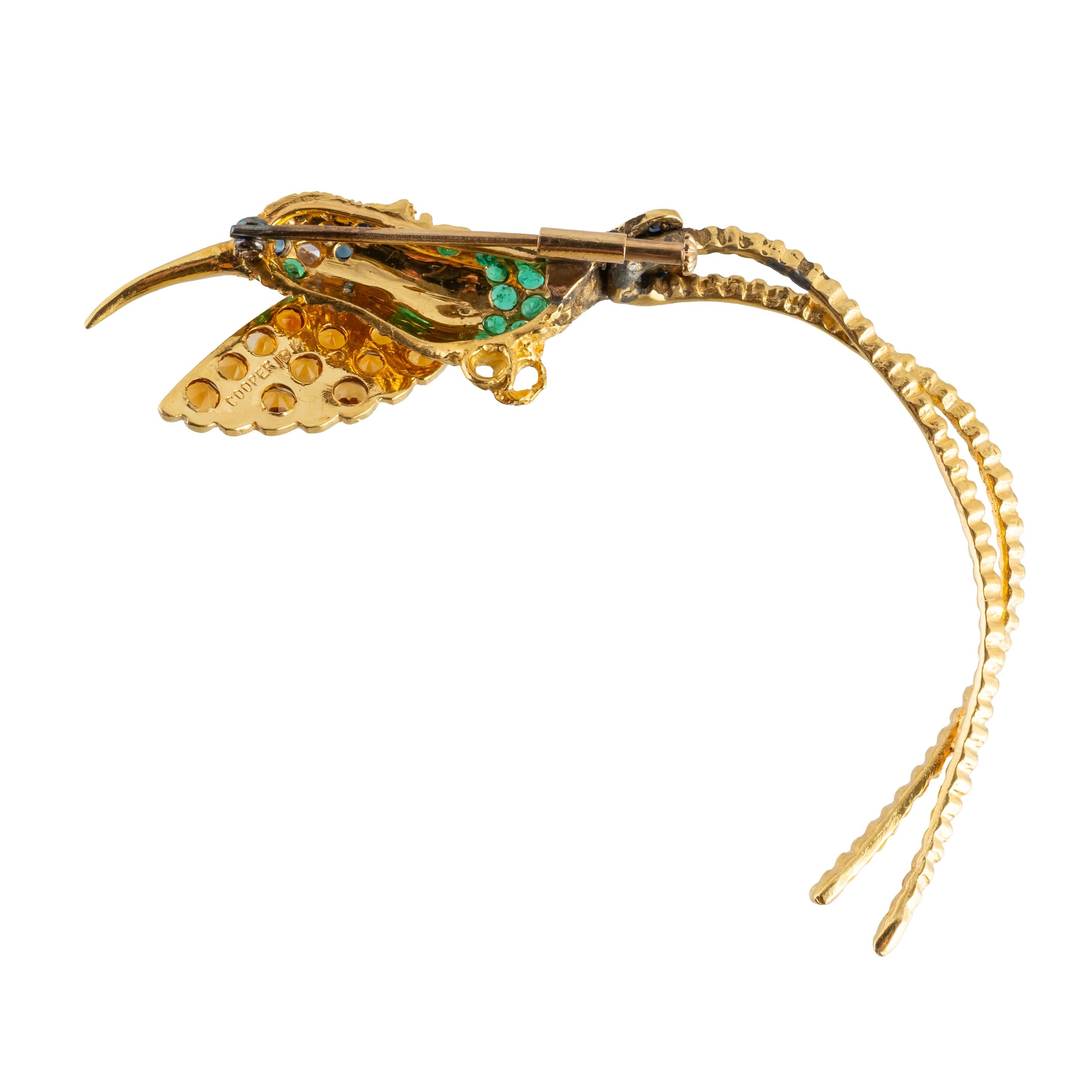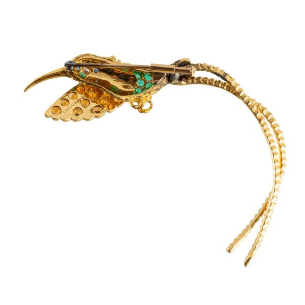 Mounted with citrines, emeralds, sapphires and a diamond eye, with a long gold tail, marked to the reverse Cooper, 18K, measuring approximately 72mm x 50mm, gross weight 15.5 grams