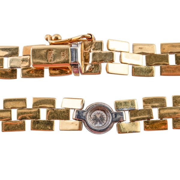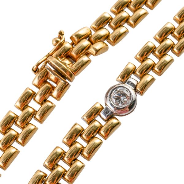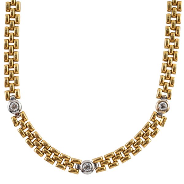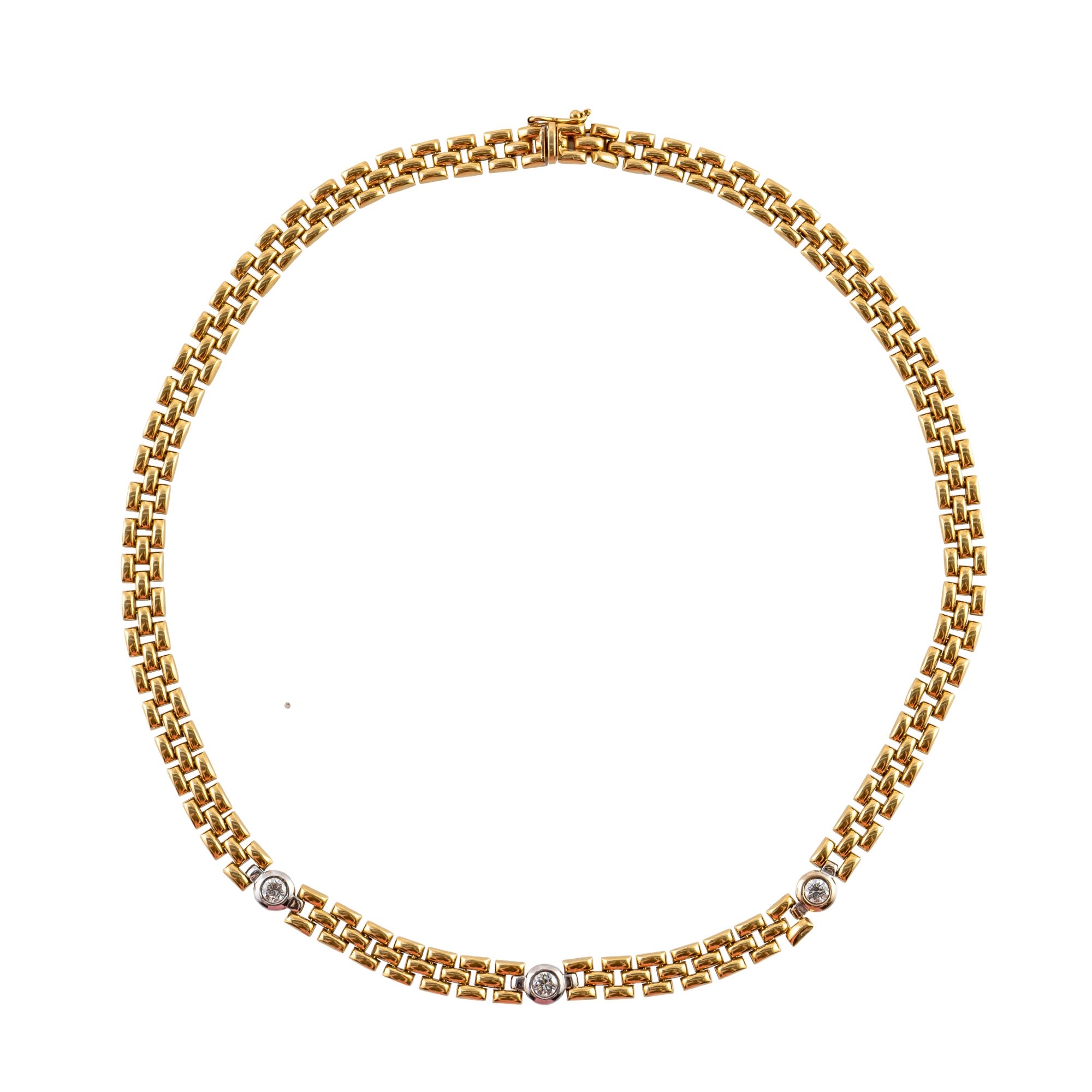 Consisting of three round brilliant cut diamonds with a total estimated weight of 0.75ct bezel set into sections into a brick link chain in yellow gold stamped '750' for 18ct gold, onto a box clasp with a safety clip, measuring 44.5cm in length, gross weight 32.4 grams