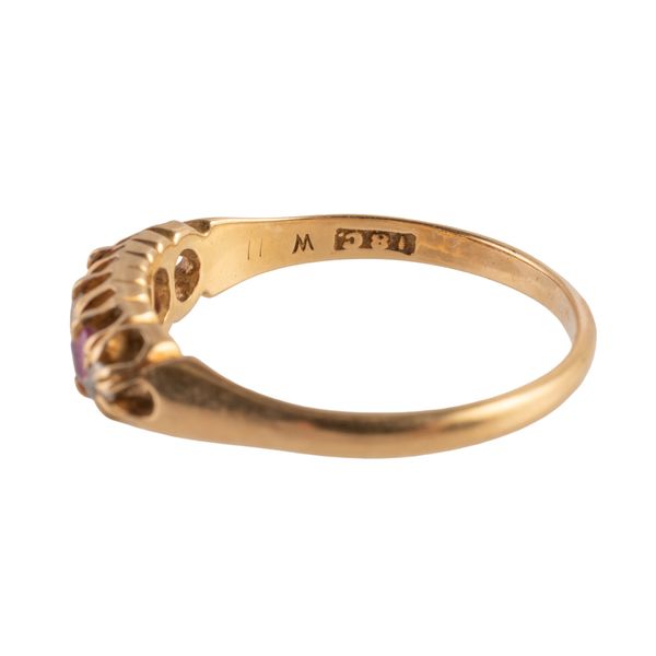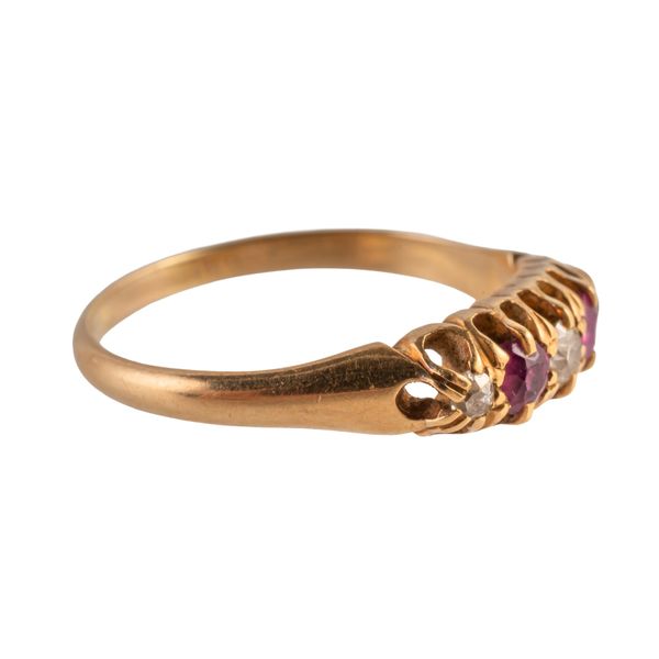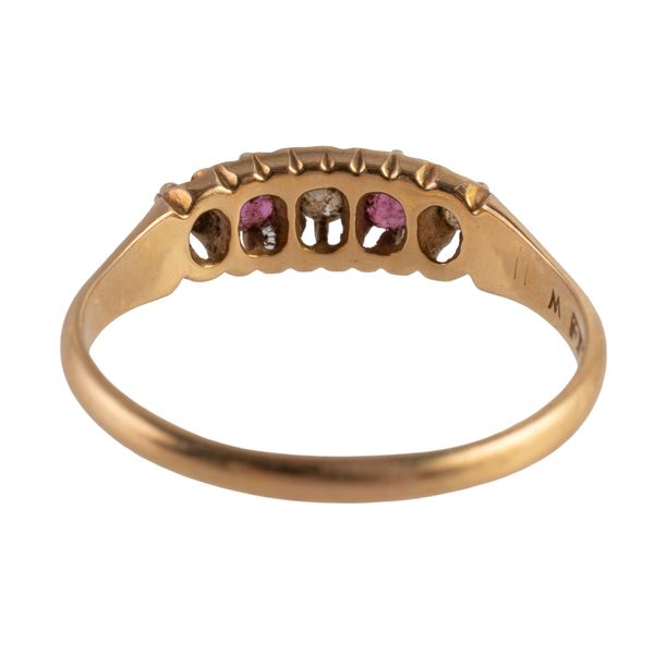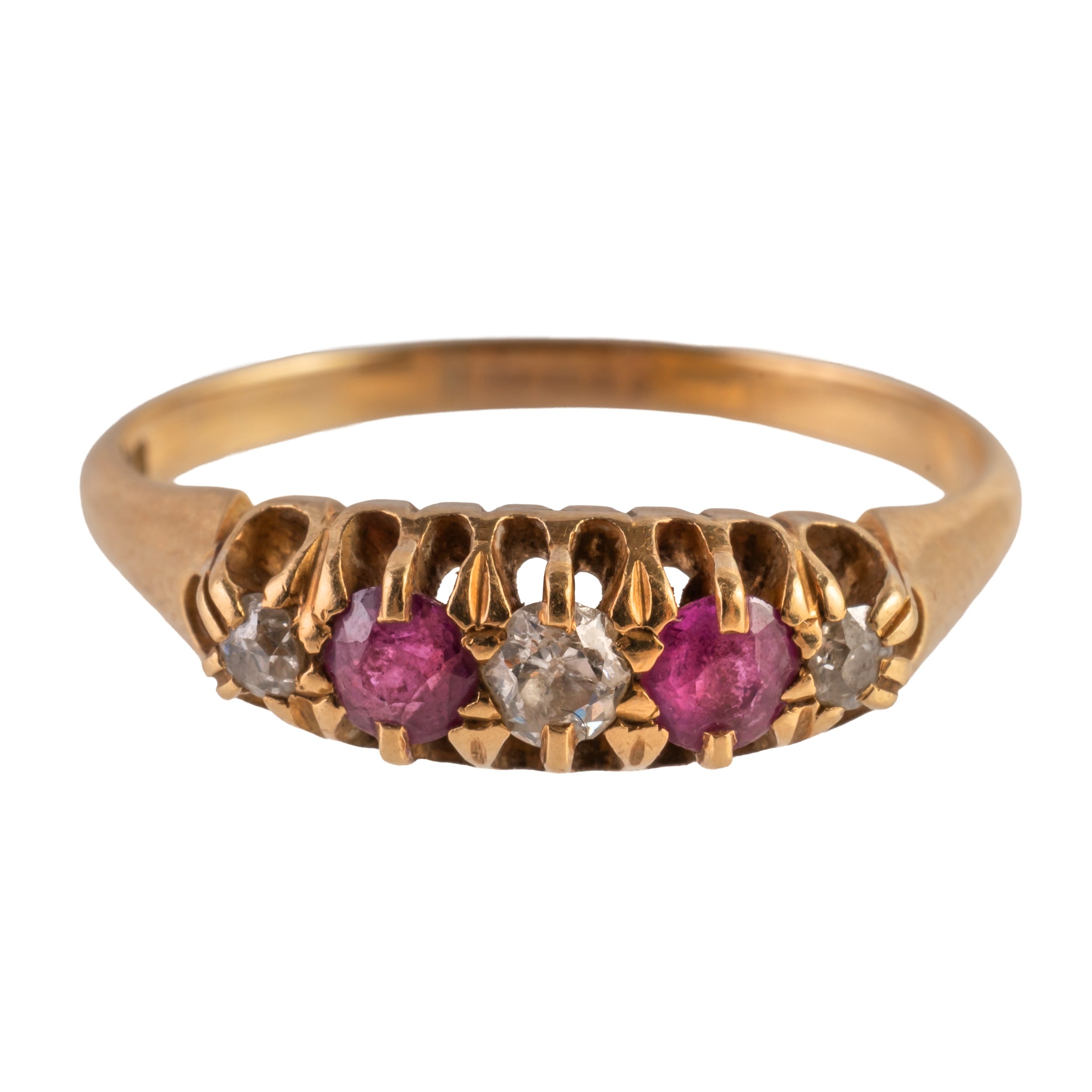 Mounted with old cut diamonds intermittently set with round cut rubies, in 18ct gold, size O½, gross weight 2.7 grams