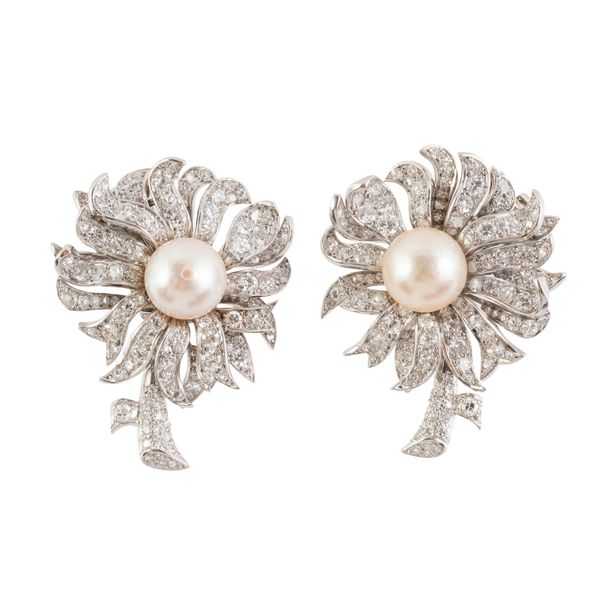 Each with a central pearl measuring 9.8mm and 9.6mm, in a floral spray design of round brilliant, old and transitional cut diamonds, measuring 37.6mm x 29.9mm, with clip back fittings for non pierced ears, together with extra parts previously removed and a Boucheron box, gross weight 35.4 grams
