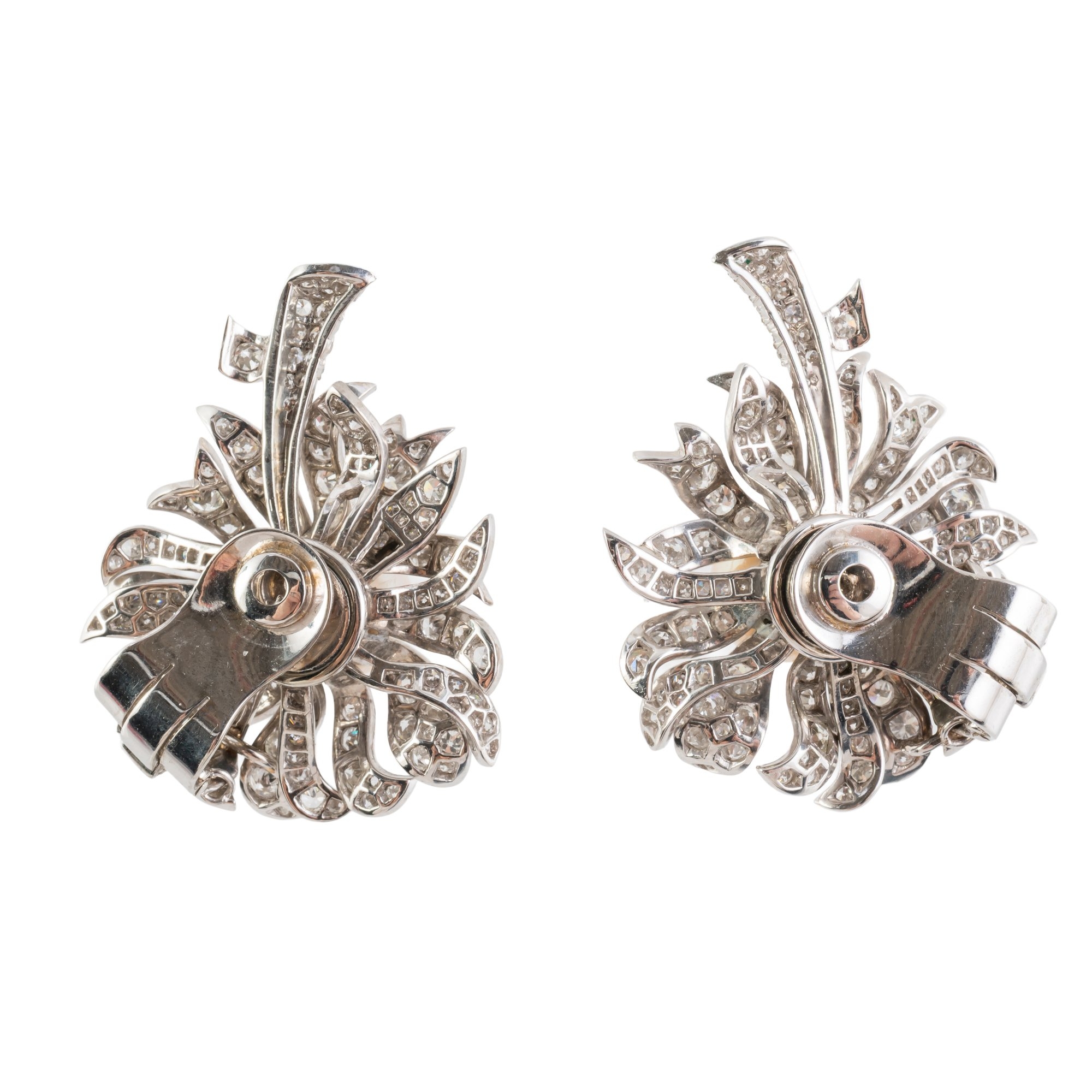 Clip backs are said to be later than the earrings, there are loose two wheels with posts and springs that we believe have been removed from the backs of the earrings, there is a mark clearly on the back of the earrings where something has been removed, the earrings are not marked at all as the marks were thought to be on the original fittings. The clip backs could benefit from tightening