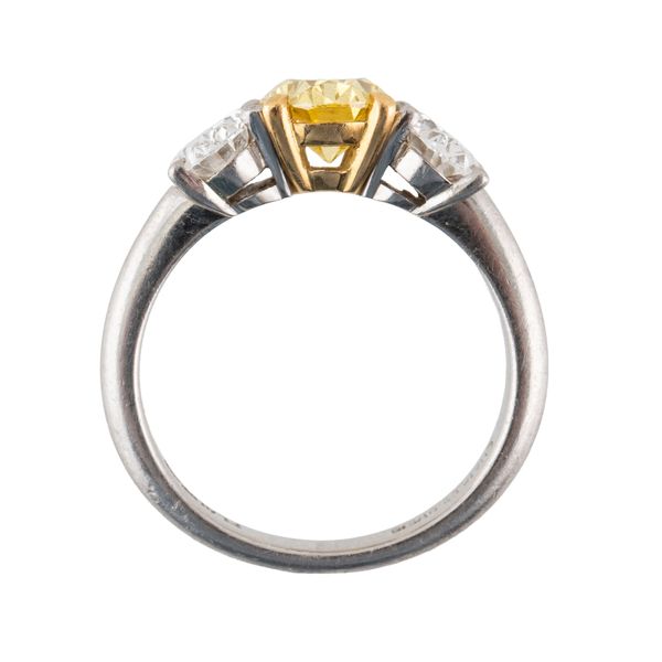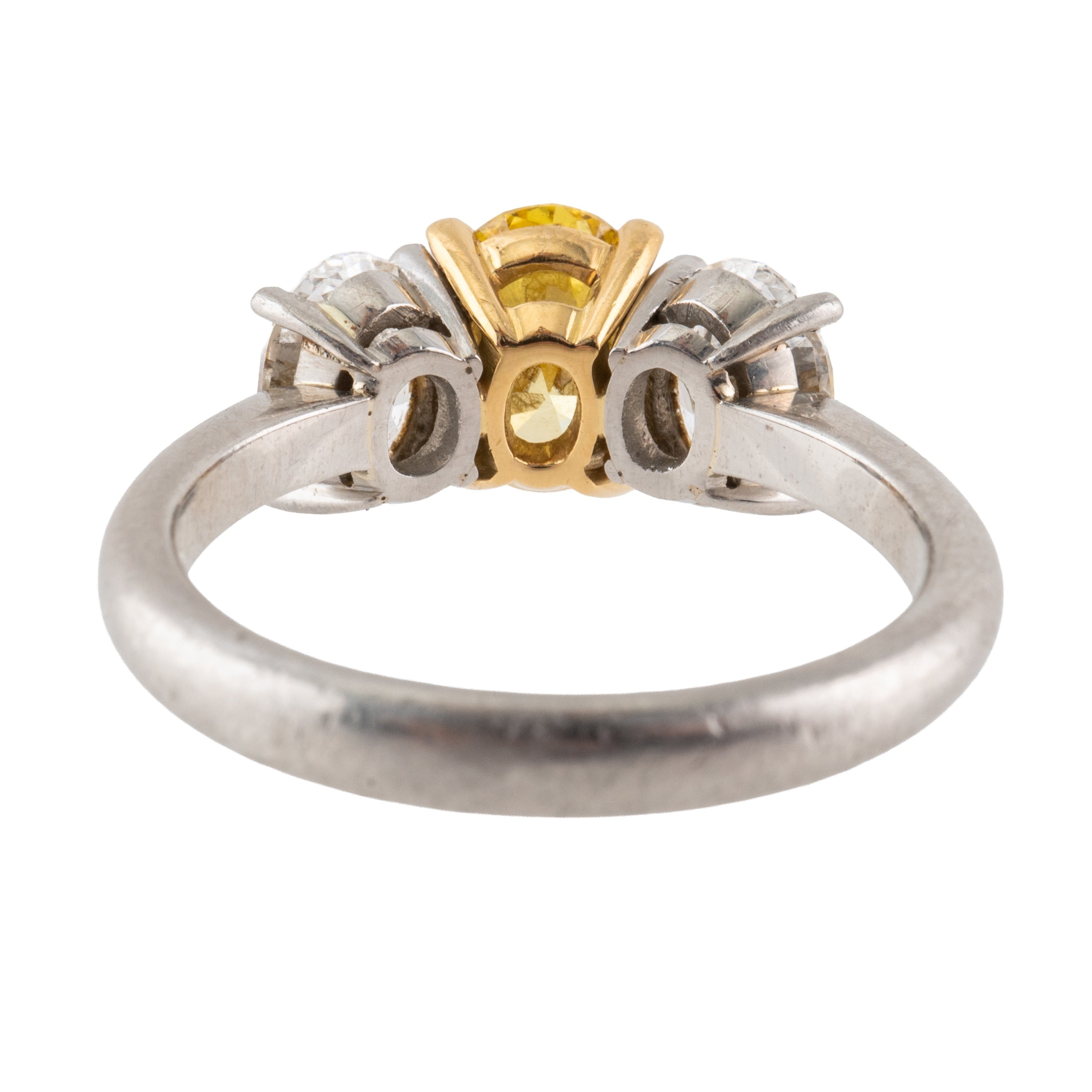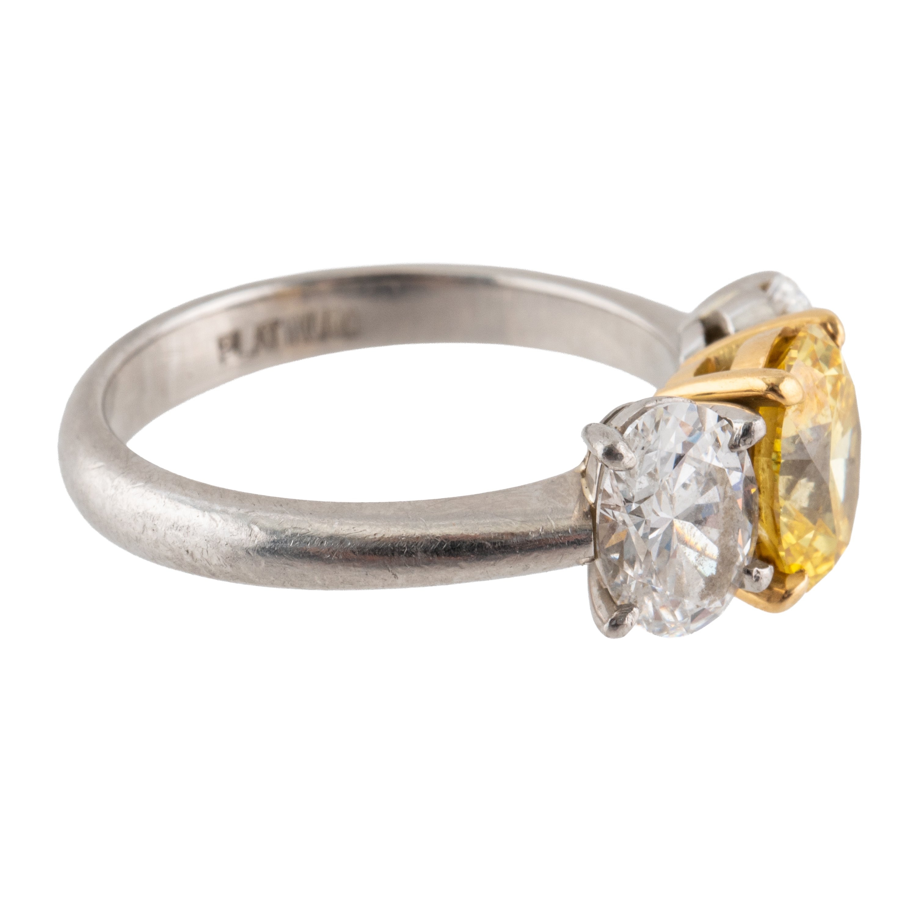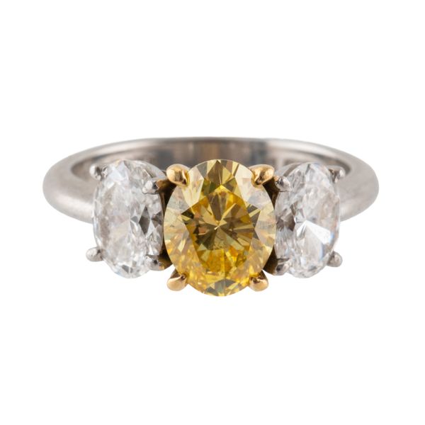Featuring a central oval cut fancy yellow diamond with known dimensions of 7.83mm x 6.30mm with a weight of 1.23ct and colour graded as 'Intense Yellow' claw set into a yellow metal collet on a white metal mount stamped 'Platinum' flanked by two oval cut diamonds with known weights of 0.70 D-VS1 and 0.73ct D-VS2 all on a D-section band, ring size M 1/2, total weight of item: 6.0 grams.