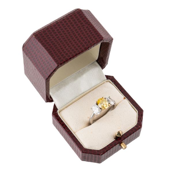 A FANCY YELLOW DIAMOND THREE STONE RING BY CHARLES GREIG