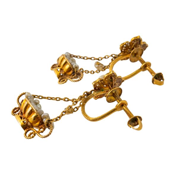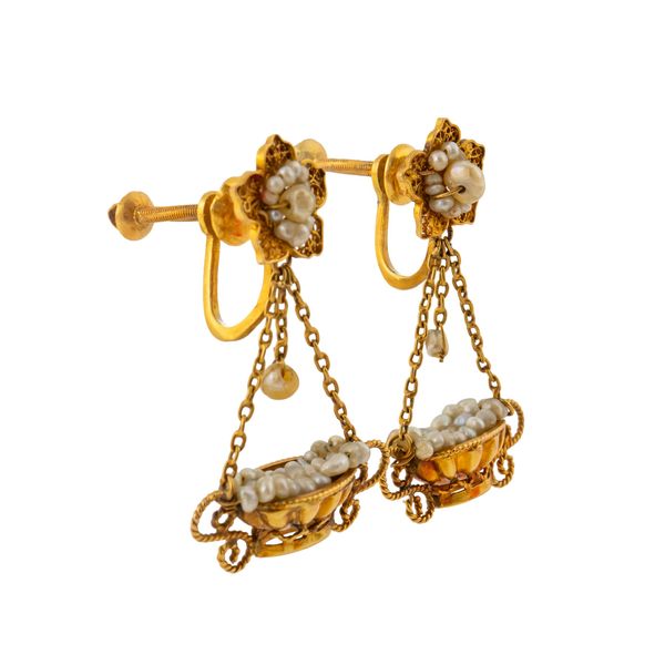 Each with a filigree and seed pearl floral stud with screw back fittings for non pierced ears, suspending a basket holding three rows of seed pearls, unmarked, gross weight 7.2 grams