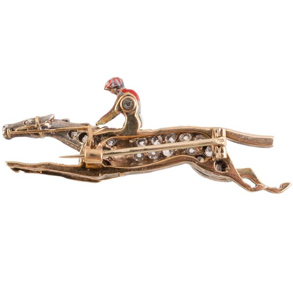 The enamelled jockey wearing a red and silver jersey and cap with white trousers, riding a rose and old cut diamond set horse, in unmarked gold, measuring 49.8mm x 18.2mm, gross weight 8.9 grams