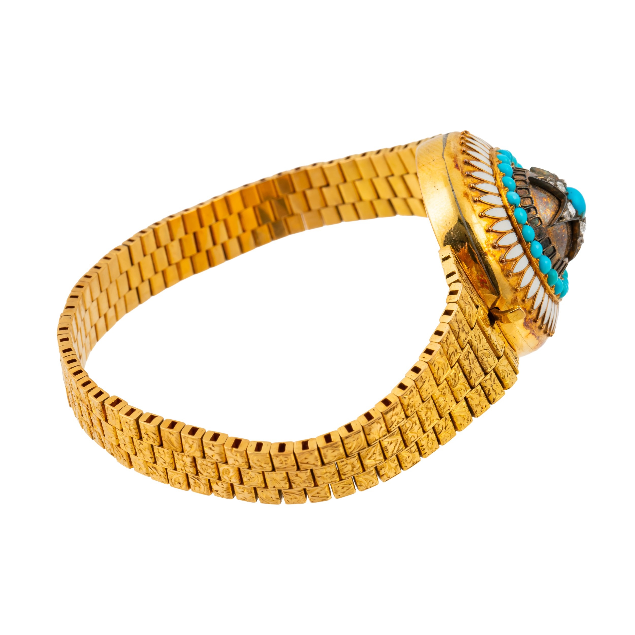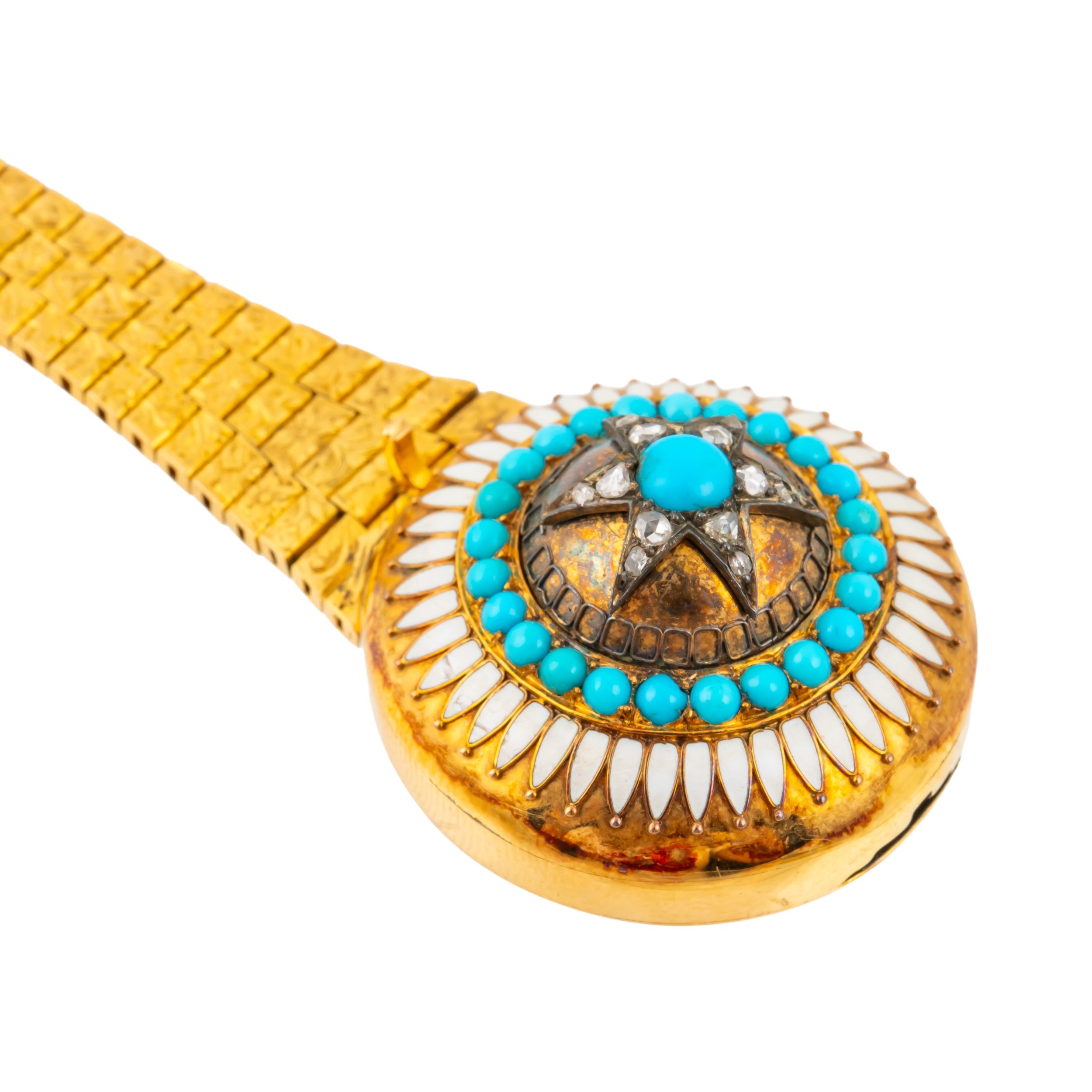 The clasp set with turquoise cabochons, rose cut diamonds and white enamel detailing, with a detachable brick link bracelet, each link with engraved floral and scrollwork detailing, measuring 18.5cm in length, in unmarked gold, gross weight 41.3 grams