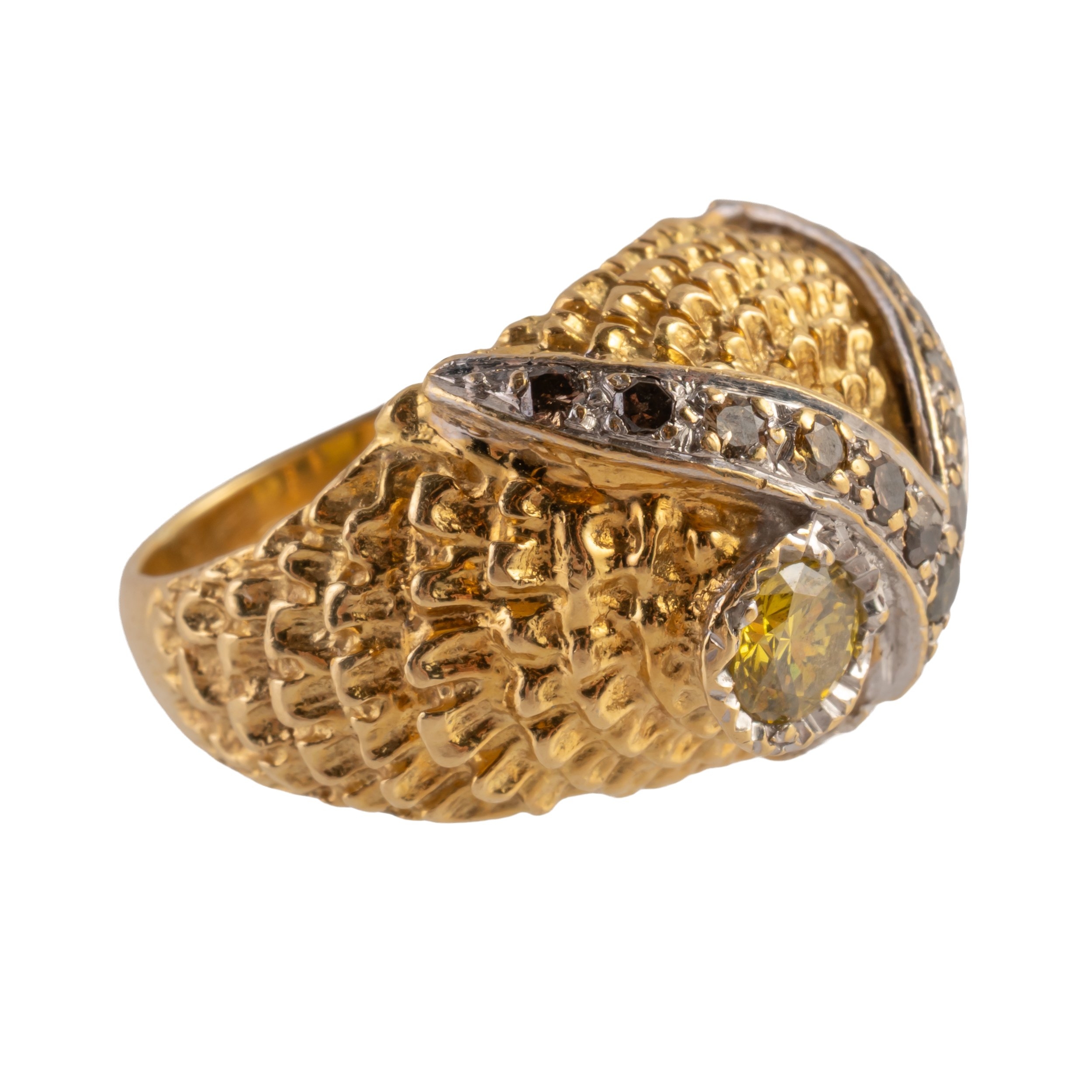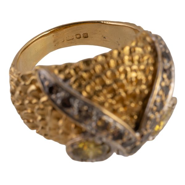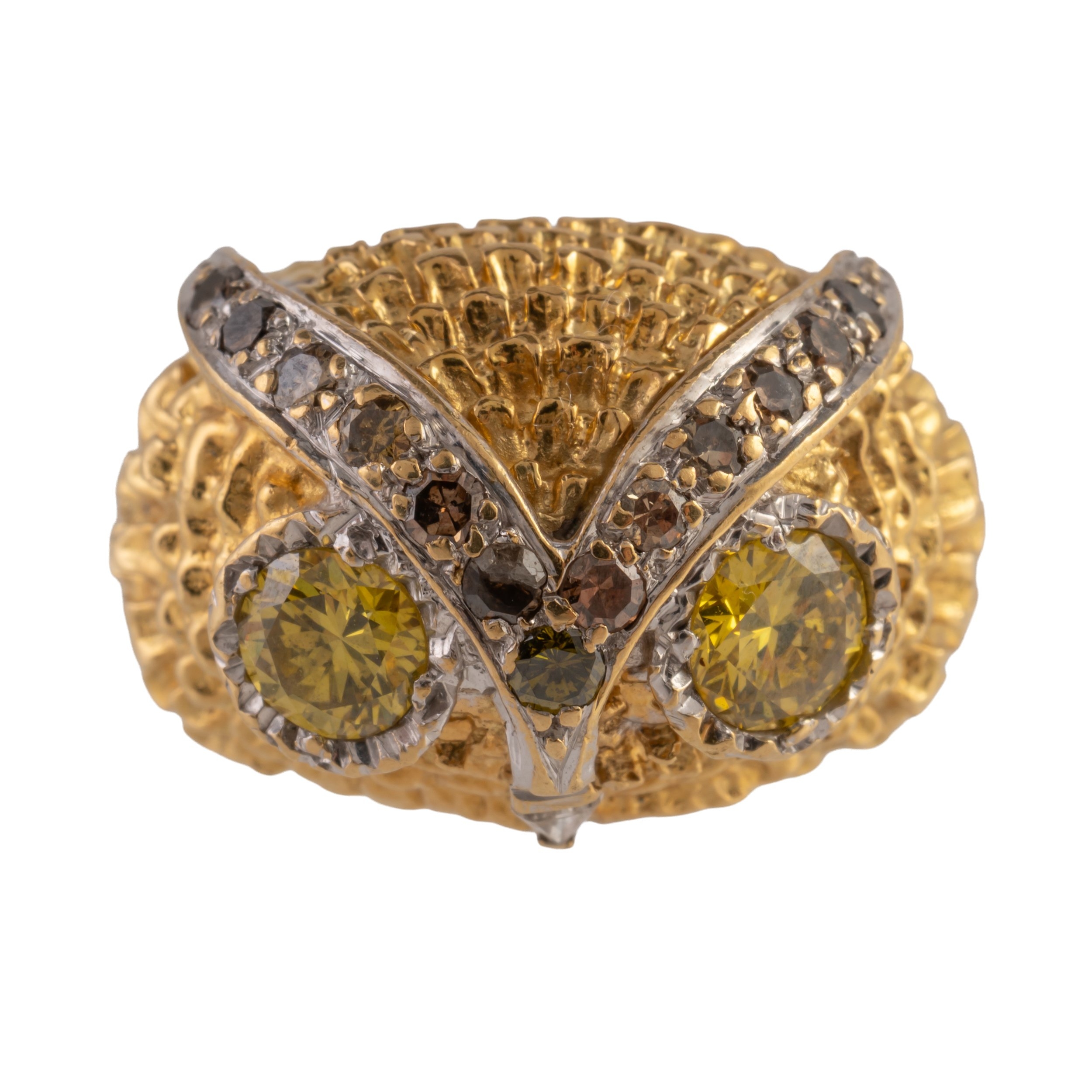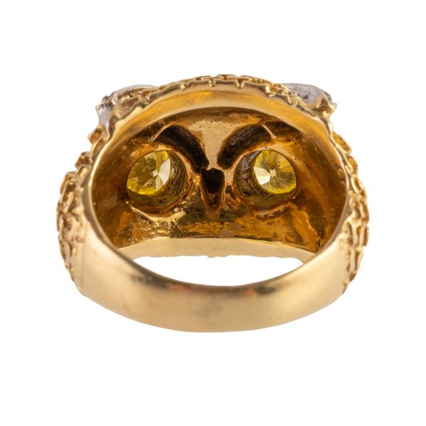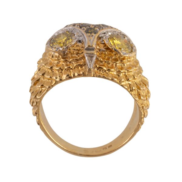 The ring designed as the face of an owl with treated yellow diamond eyes and brown diamond detailing, with a textured surface, in yellow and white 18ct gold, with rubbed hallmarks for London, 1974, size I, gross weight 12.7 grams