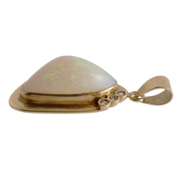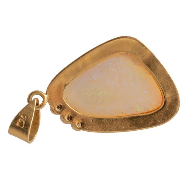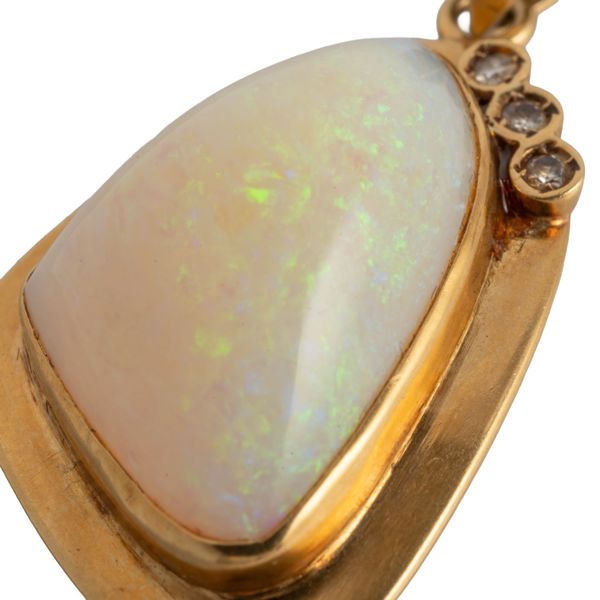The cabochon opal measuring 18mm x 12mm set within a gold surround, accented with three round brilliant cut diamonds, the bale marked to the reverse 750 for 18ct gold, gross weight 4.8 grams