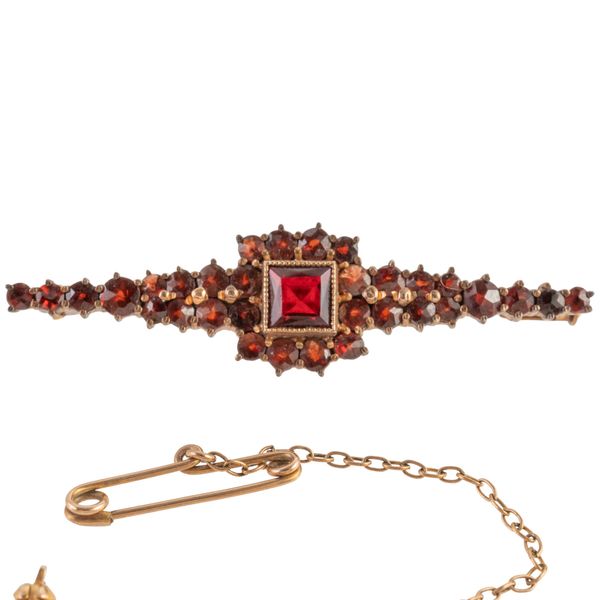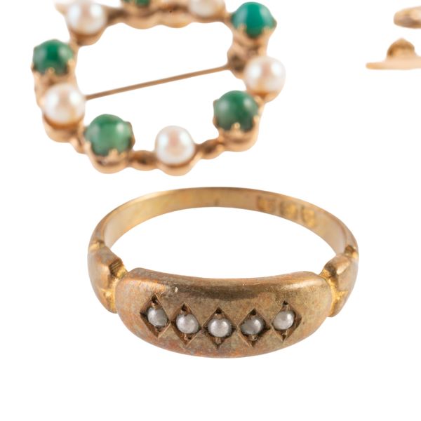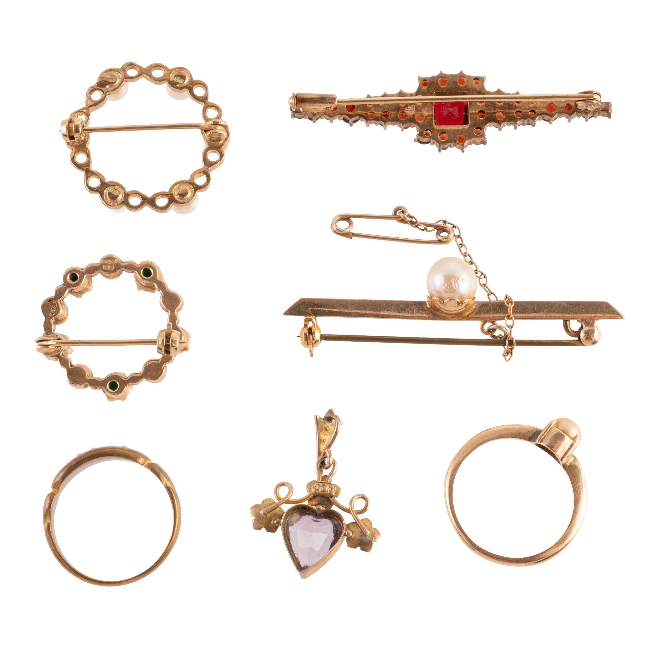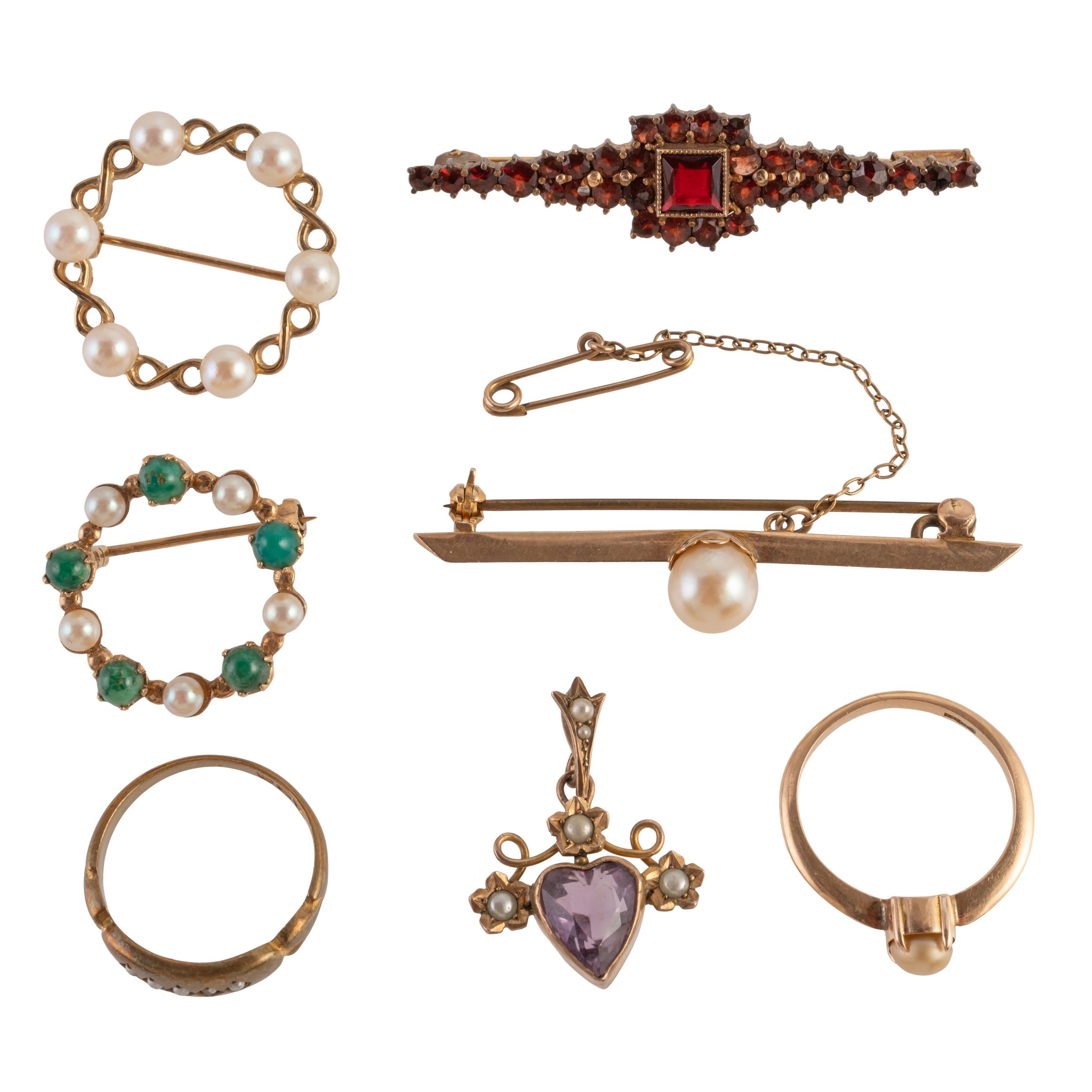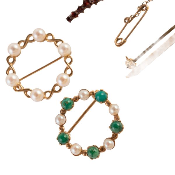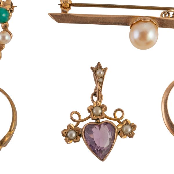 Including a pearl ring brooch, a pearl and turquoise ring brooch, a pearl bar brooch and a pearl and amethyst pendant all in 9ct gold, combined gross weight 11.1 grams, two pearl set rings marked 18ct, sizes L½ and M, combined gross weight 4.4 grams, and a garnet bar brooch
