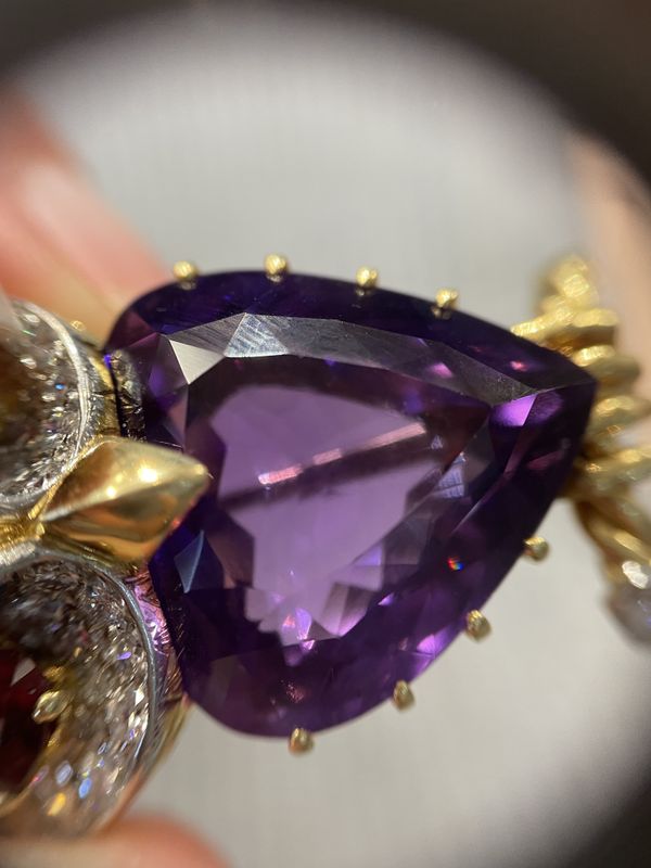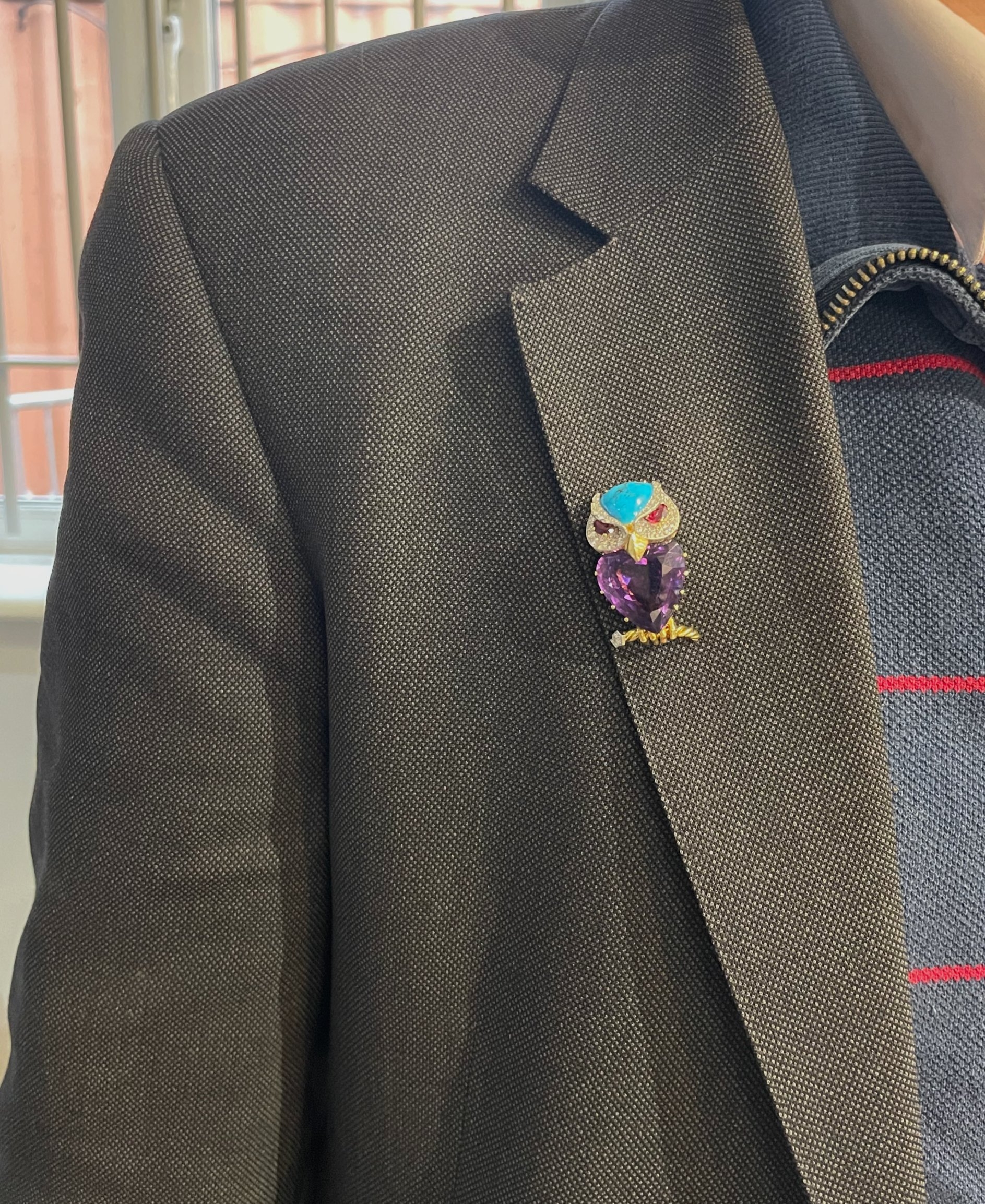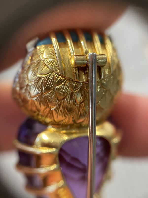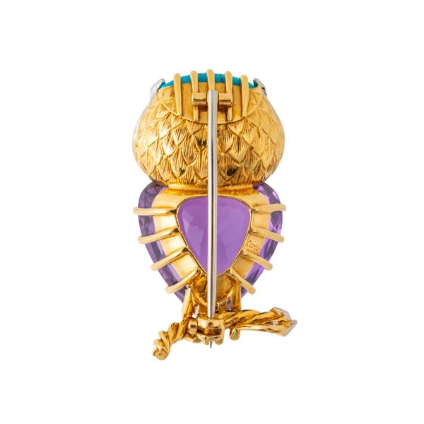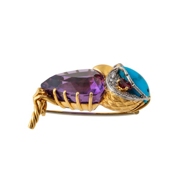 With a amethyst body, turquoise head, round brilliant cut diamond face and oval cut ruby eyes, perched on a branch also set with a round brilliant cut diamond, the back marked Cartier and numbered L5464, measuring approximately 39.2mm x 21.2mm, gross weight 21.2 grams
