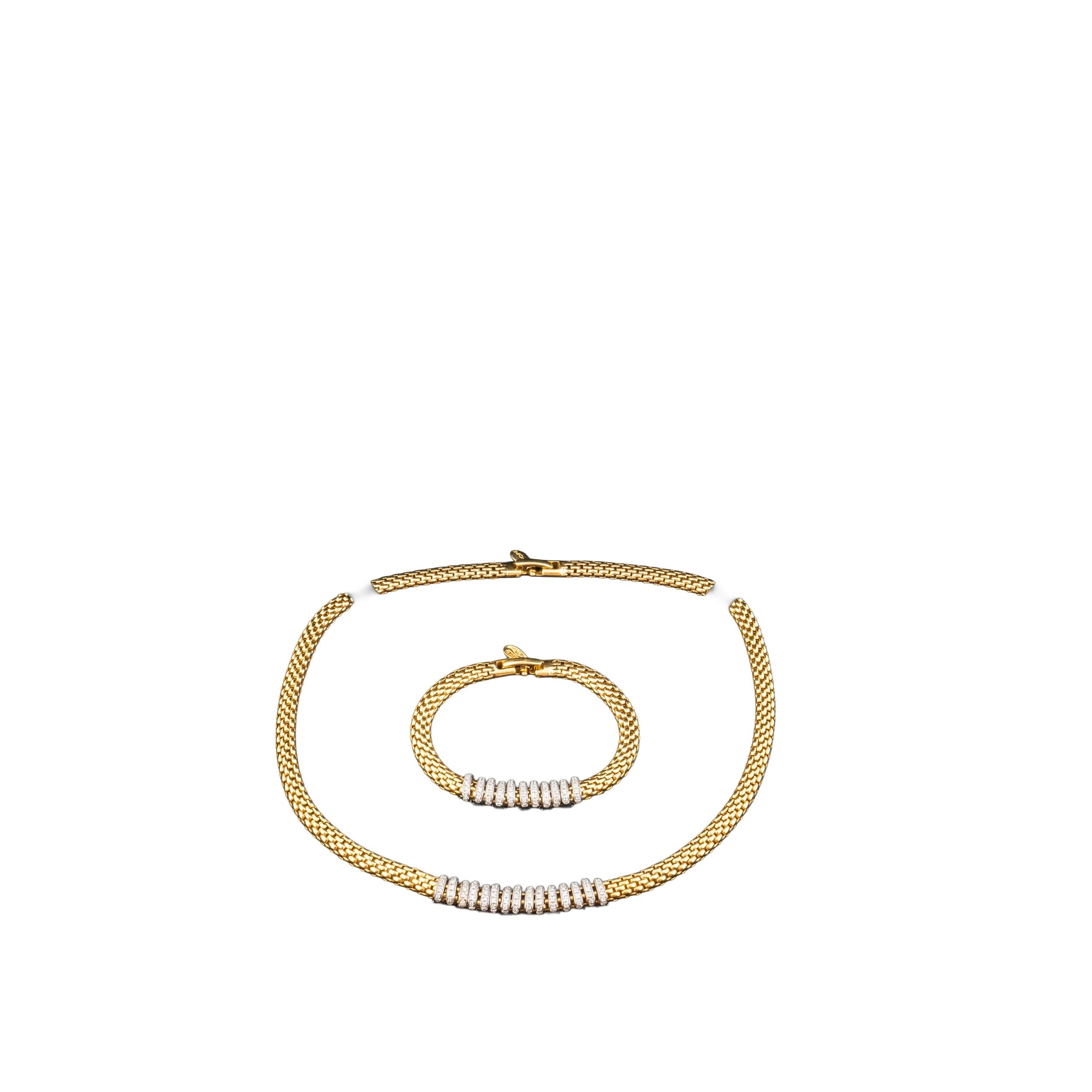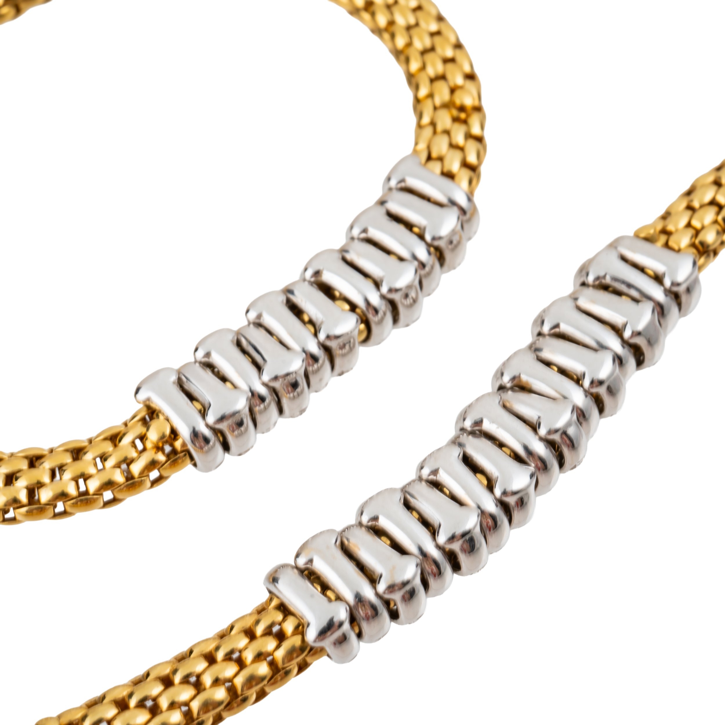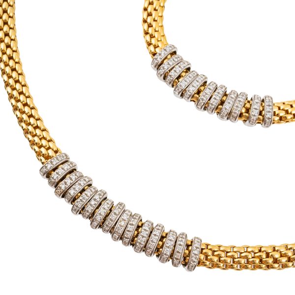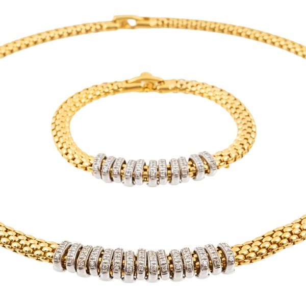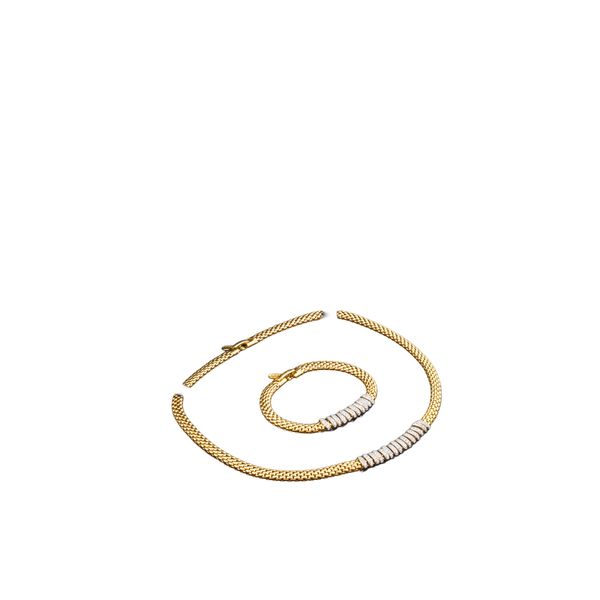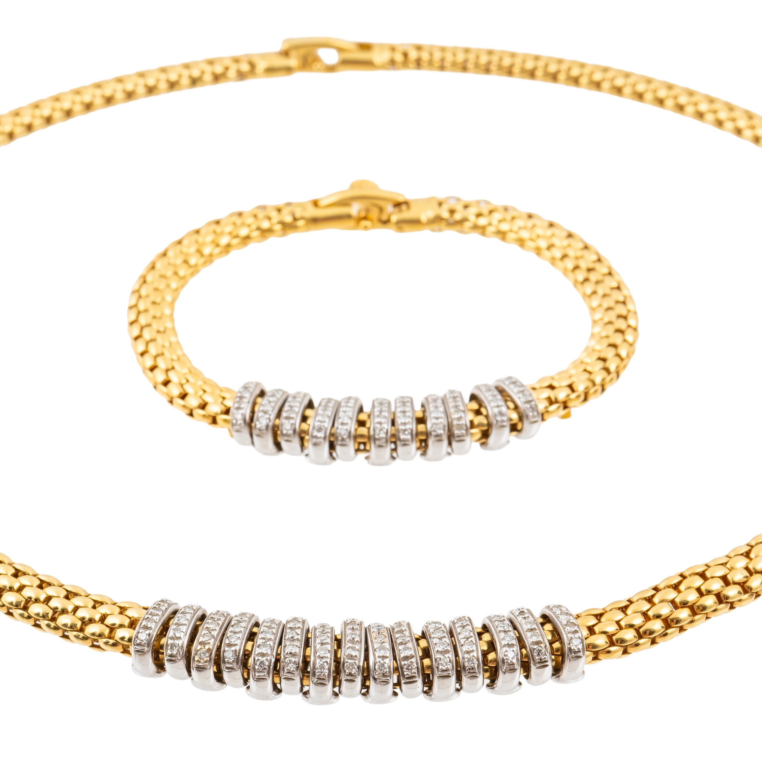 The necklace formed from 18ct yellow gold woven rope link with 18ct white gold diamond set articulated rings, with a signed folding clasp, measuring 42cm in length, with a matching bracelet measuring 18cm in length, gross weight 62.4 grams, with a box