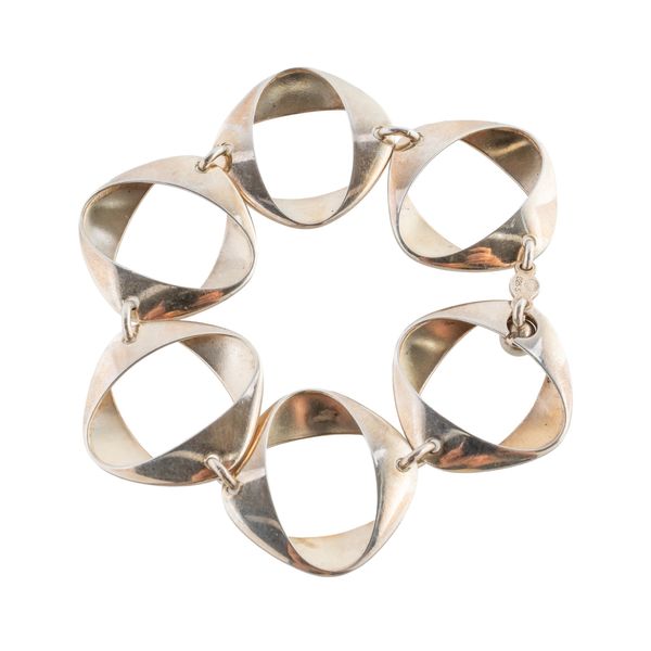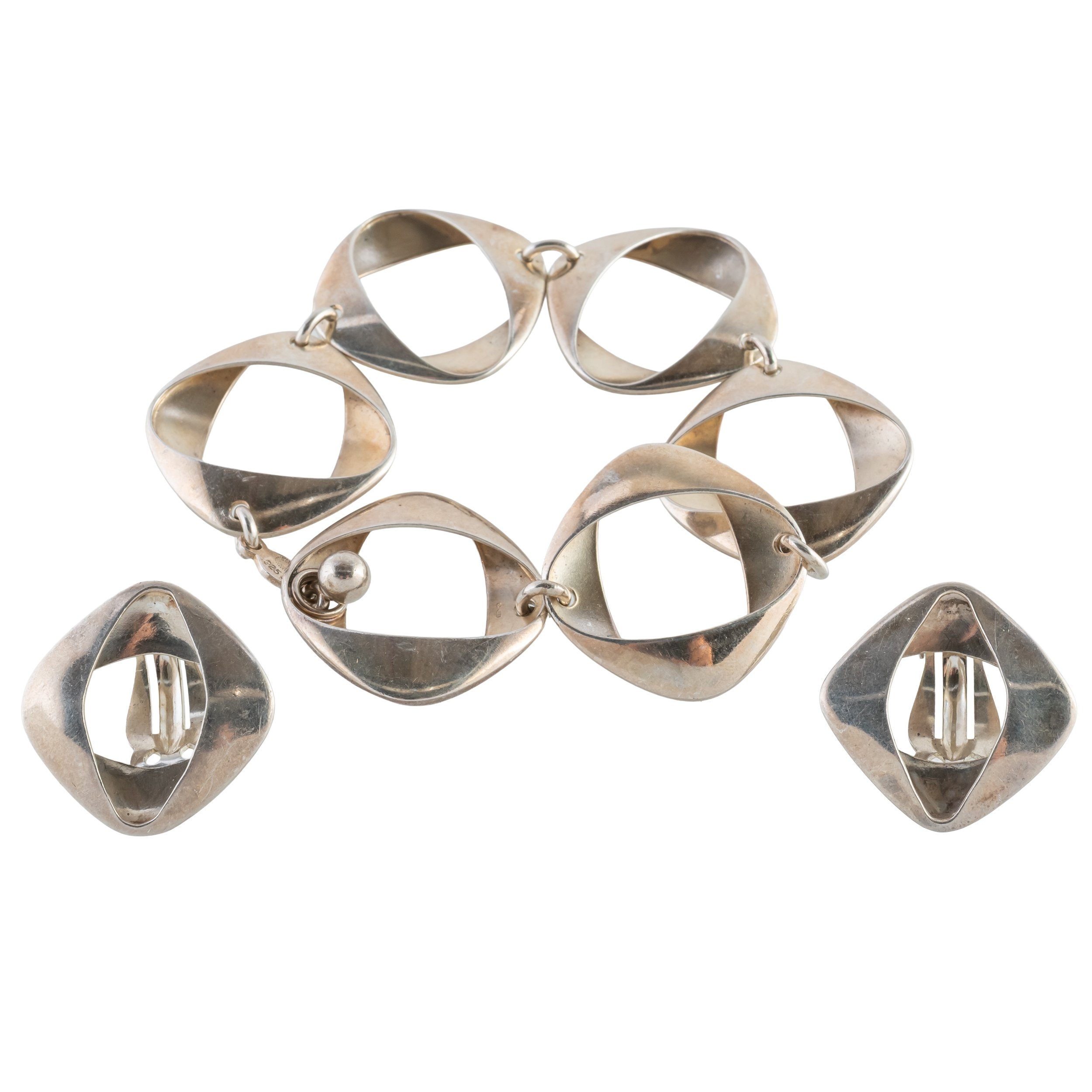 Designed by Henning Koppel, the bracelet with fancy links measuring approximately 19.5cm in length, with import marks for London, 1979, the clip back earrings marked sterling and made later to match, gross weight 35.7 grams