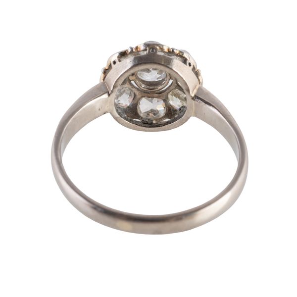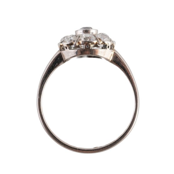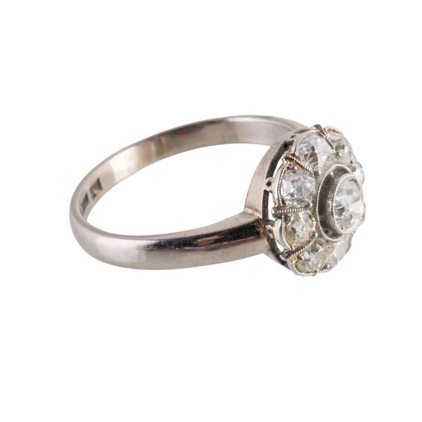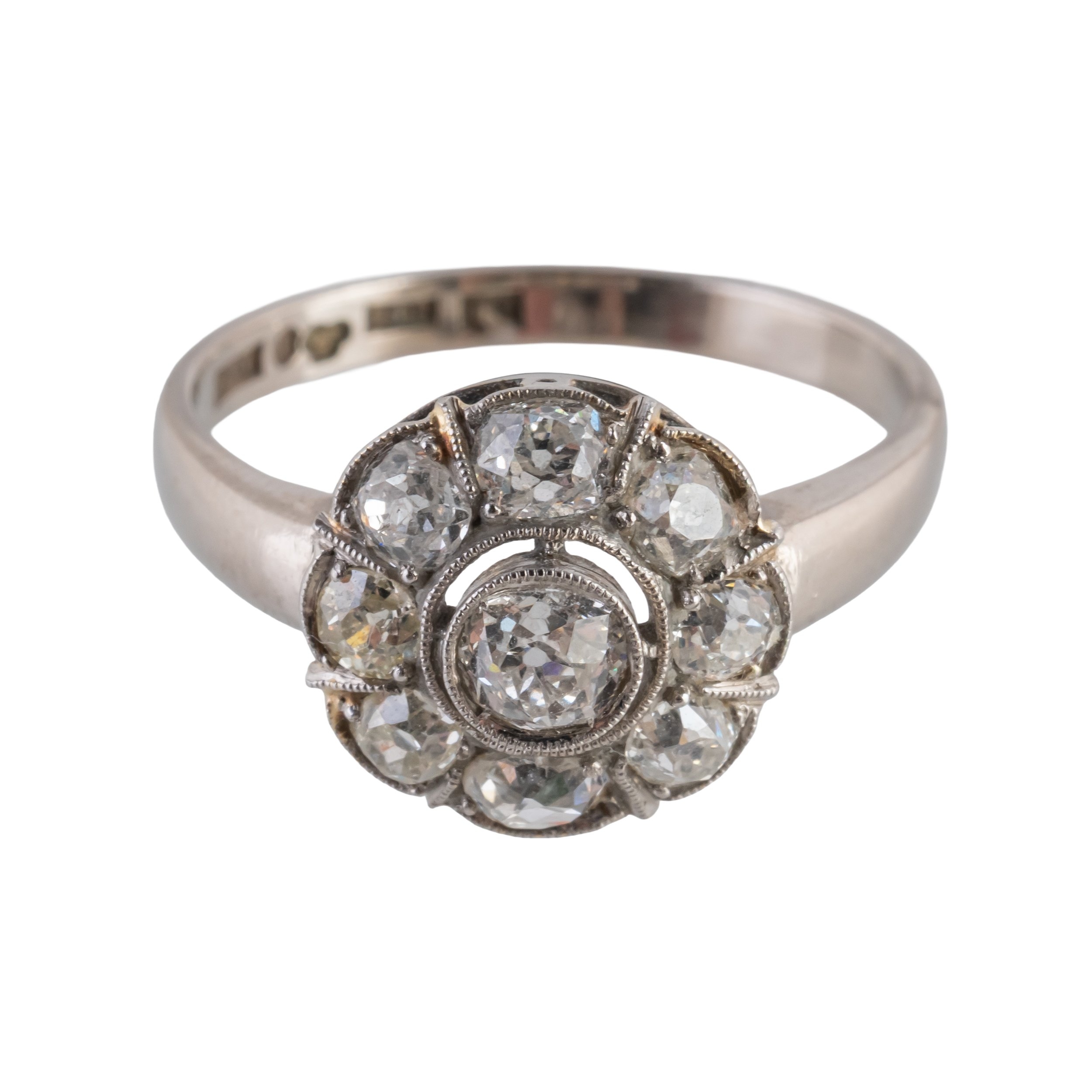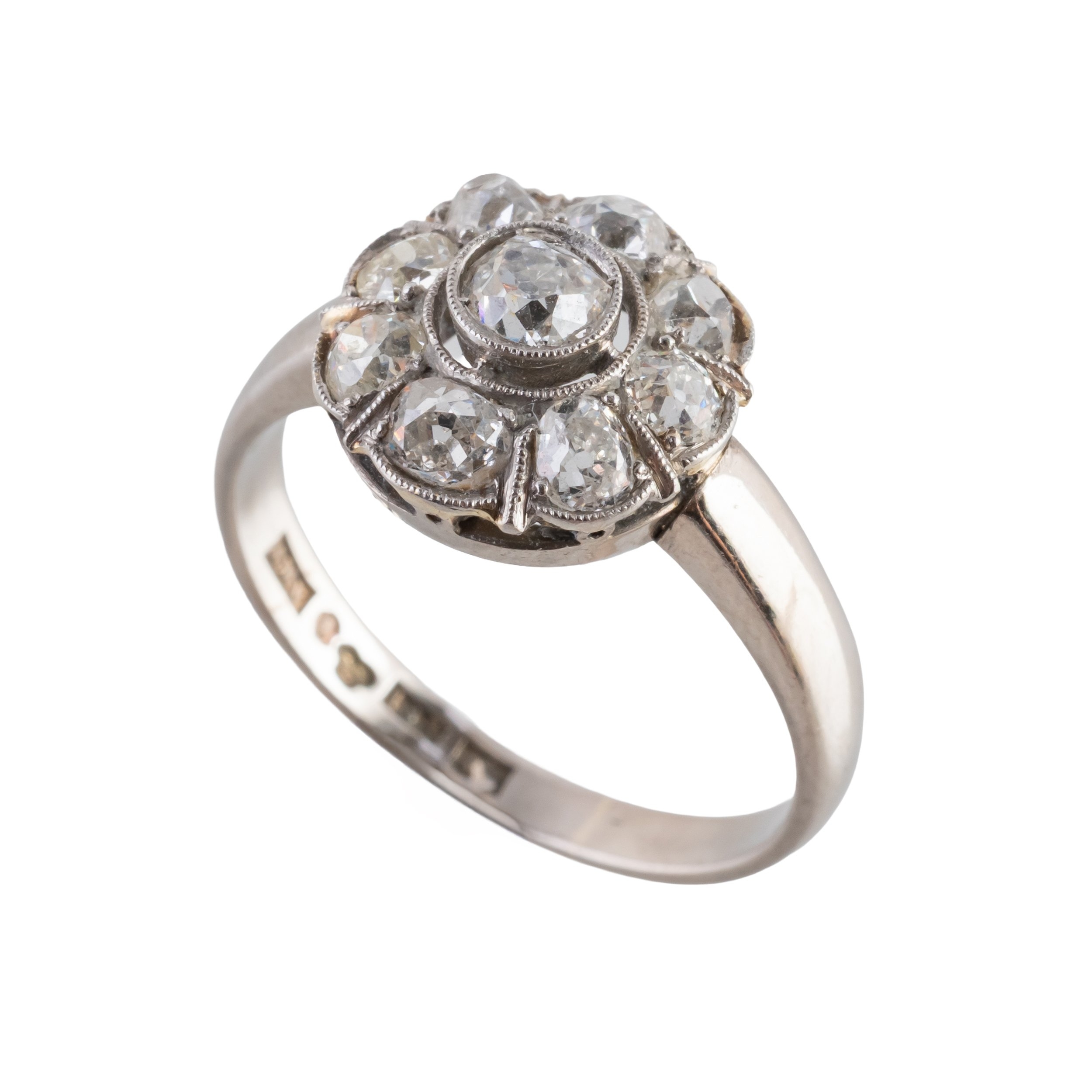 With nine old cut diamonds in millegrain settings, marked for 18ct white gold, size Q, gross weight 4.6 grams