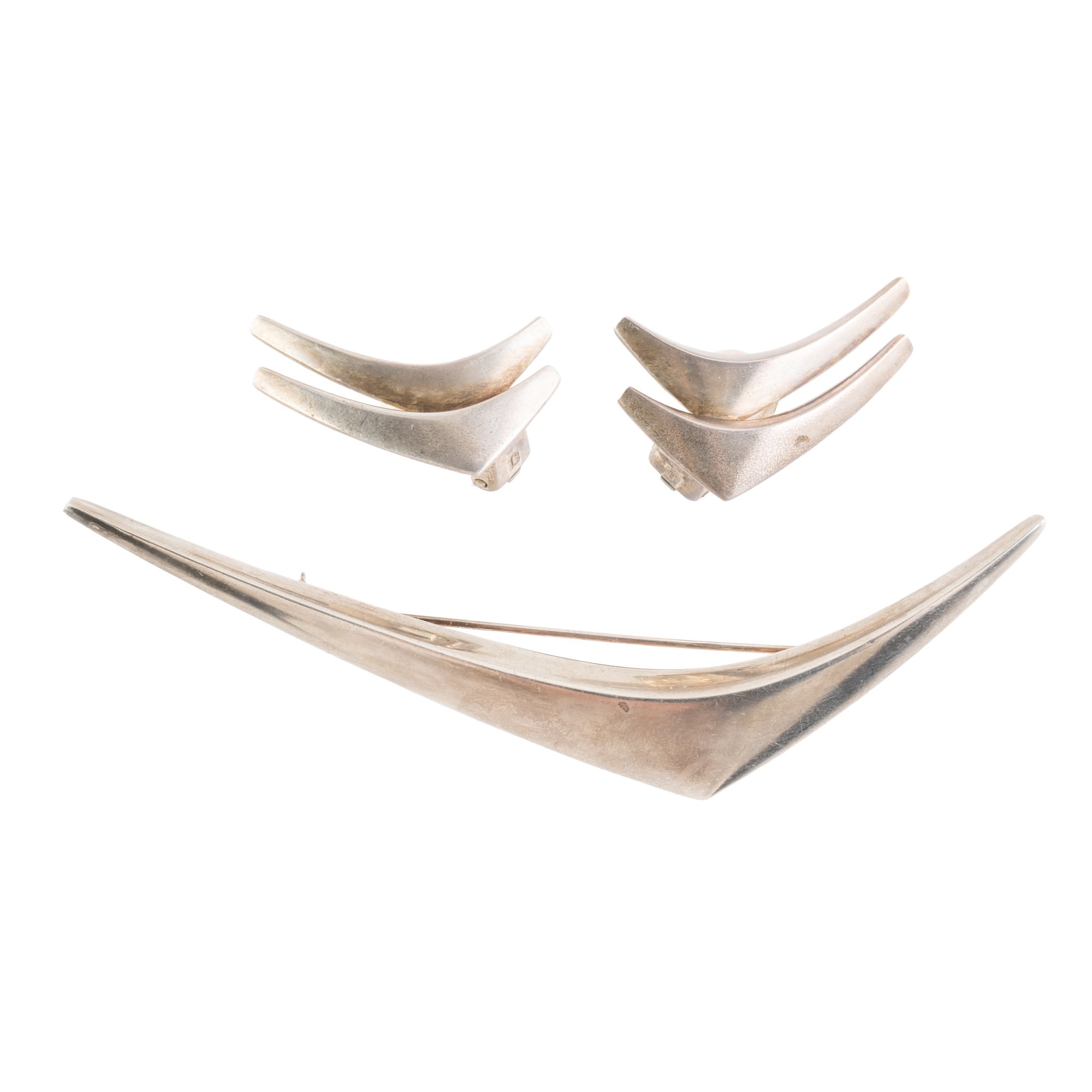 All signed AM, Sterling Denmark, the brooch with initials EJ for Eigil Jensen, the earrings with clip fittings for non pierced ears, gross weight 29 grams