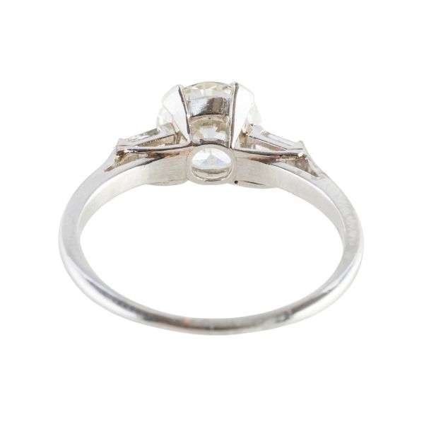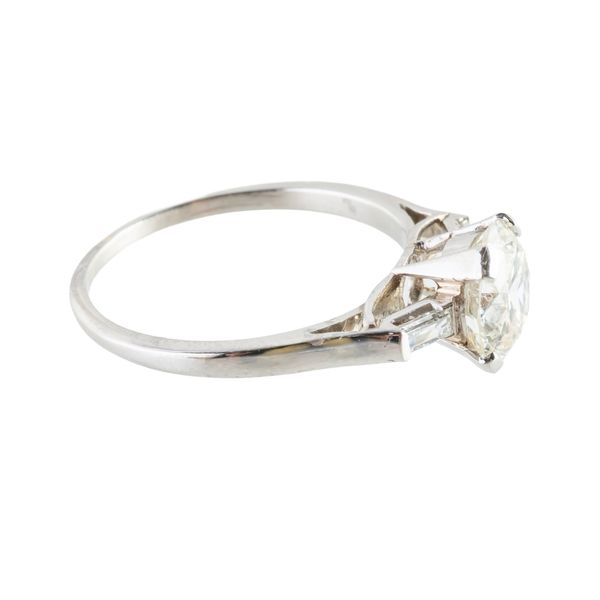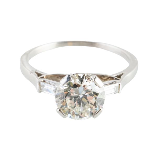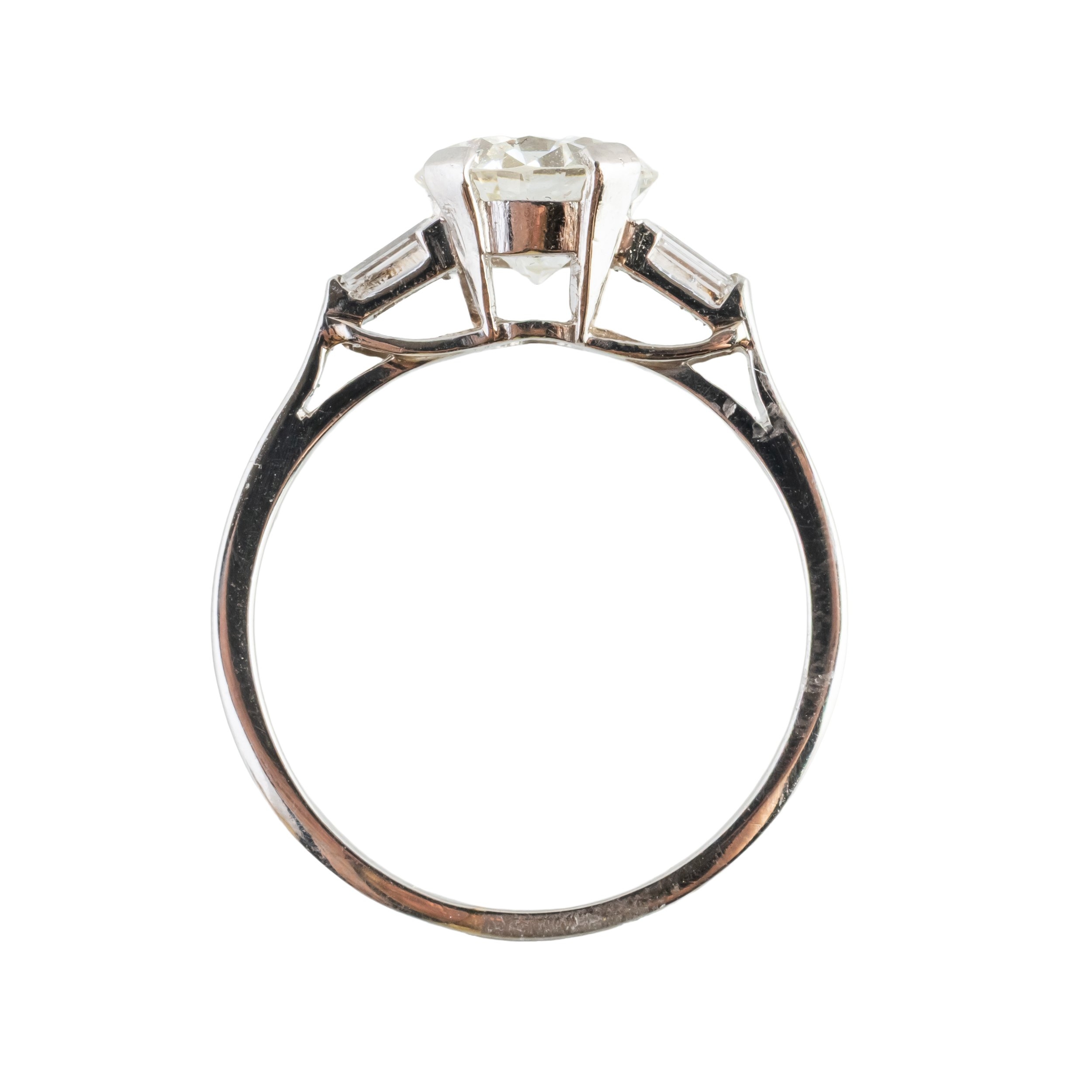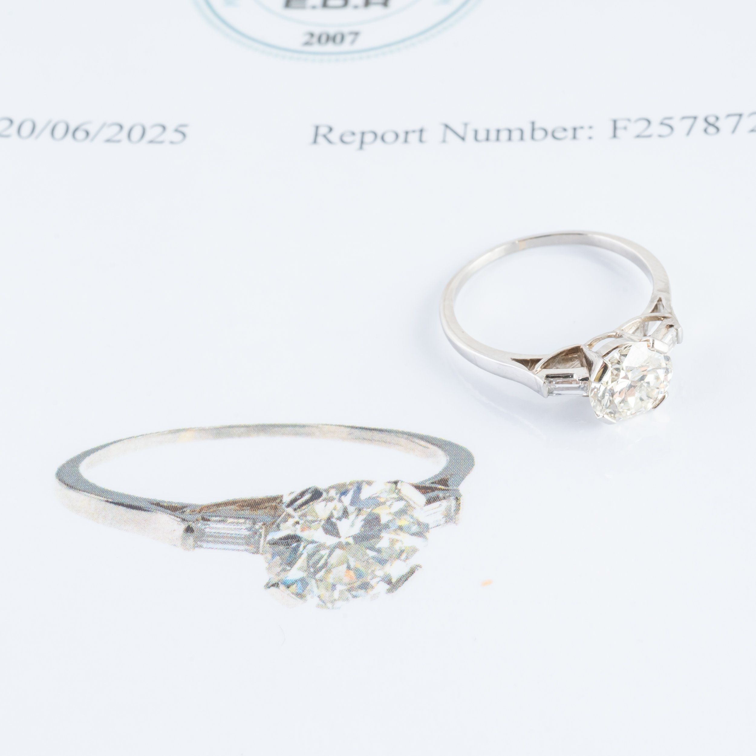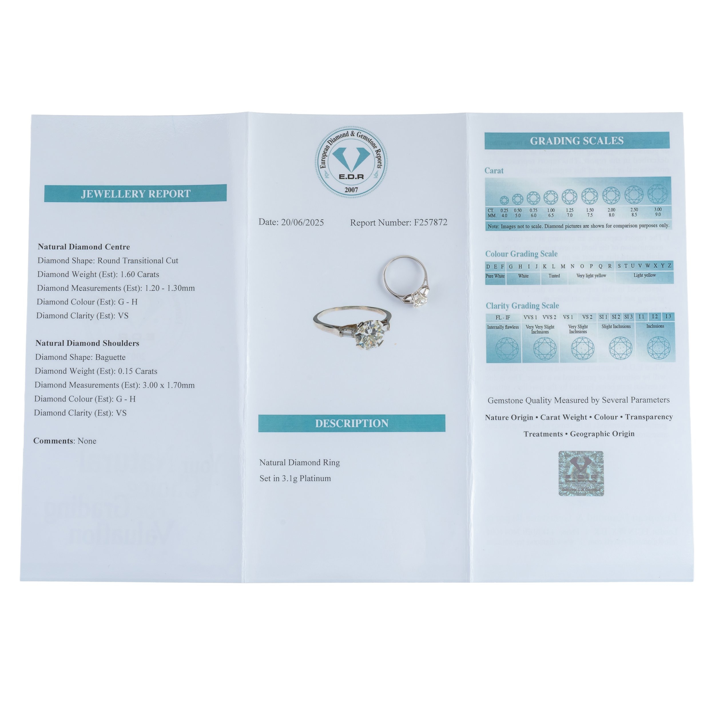 With central transitional cut diamond weighing a stated 1.60 carats, with a stated colour of G-H and clarity of VS, flanked either side by baguette cut diamonds with a stated combined weight of 0.15 carats, mounted in unmarked platinum, size N, gross weight 3.2 grams, with an EDR certificate