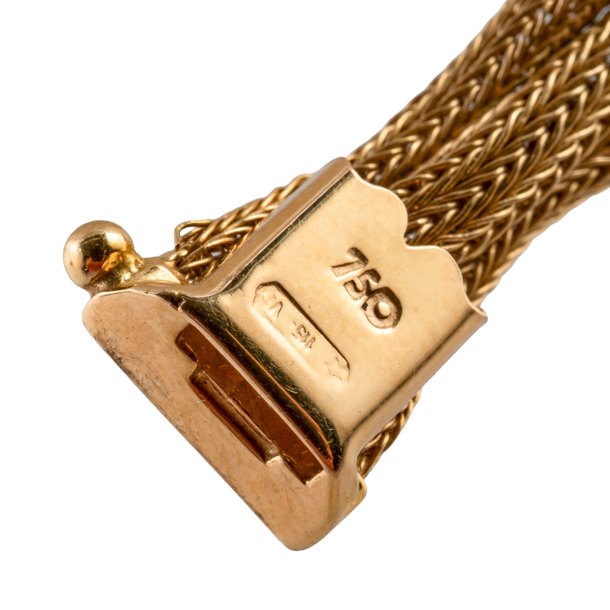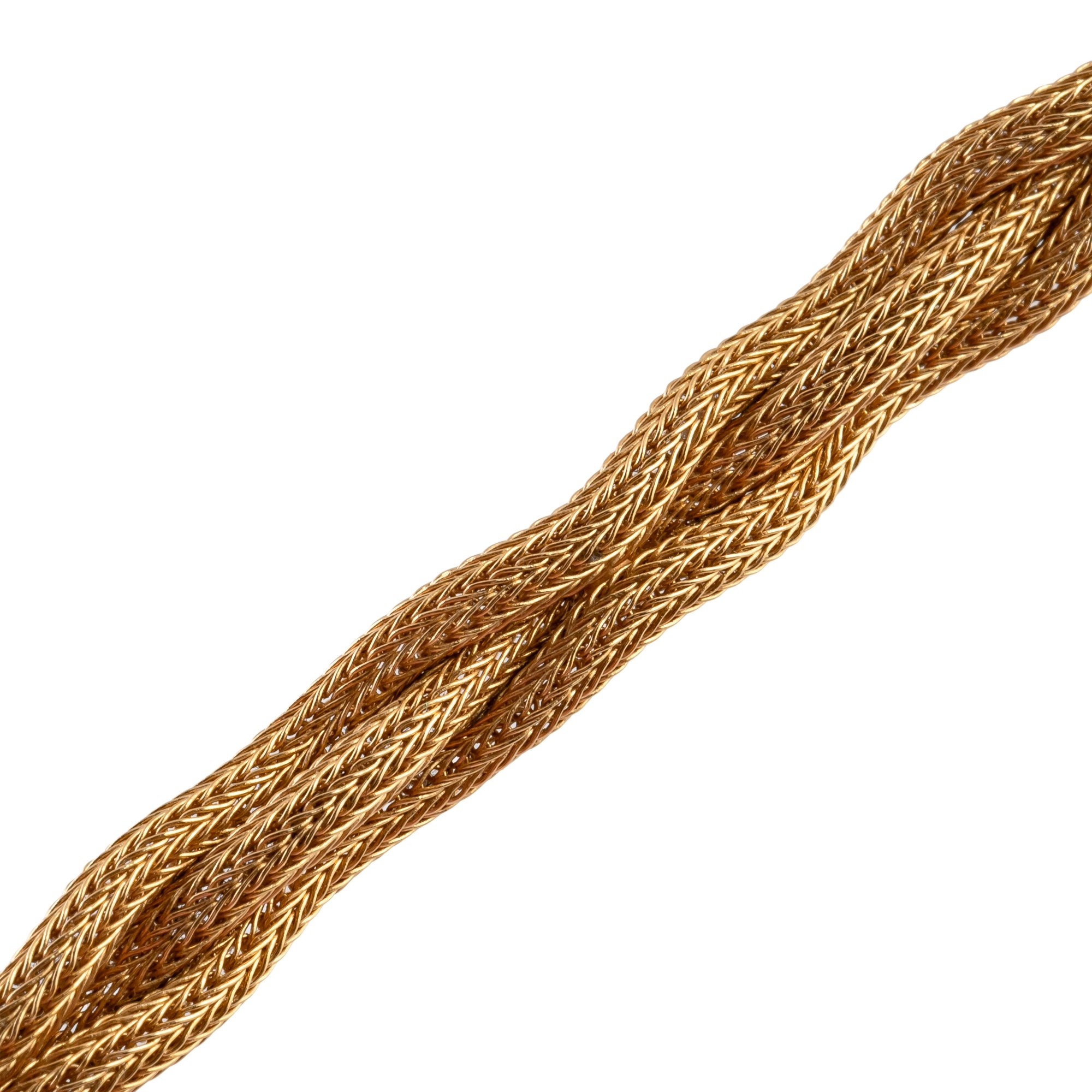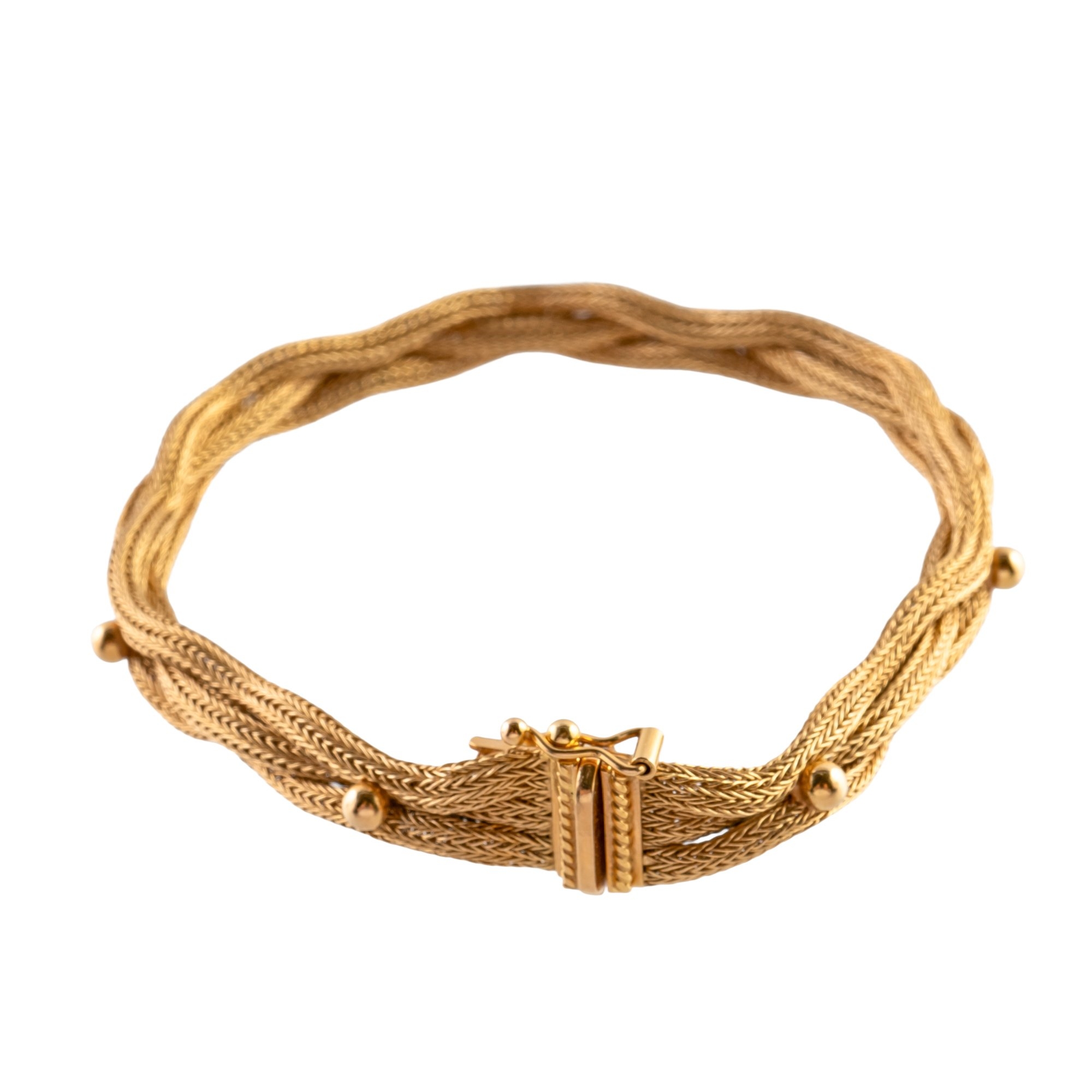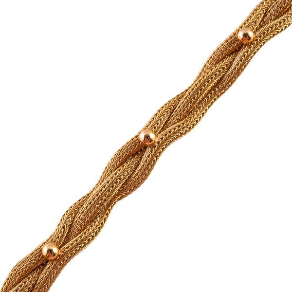 Comprising three rows of rope-style woven and pinned 18ct gold strings spaced with seven gold beads with a box clasp and safety clip, measuring length 18.5cm, gross weight of 14.9 grams