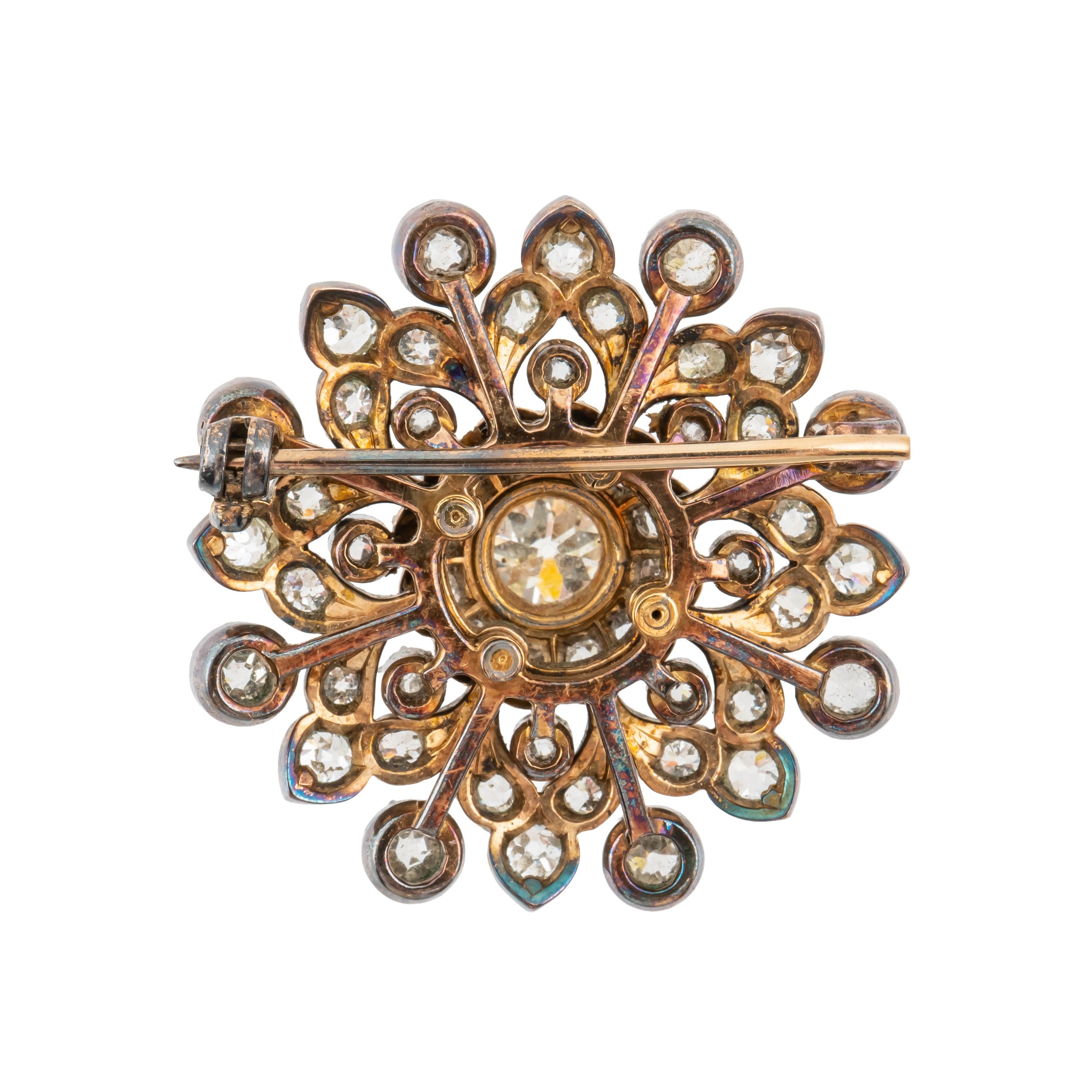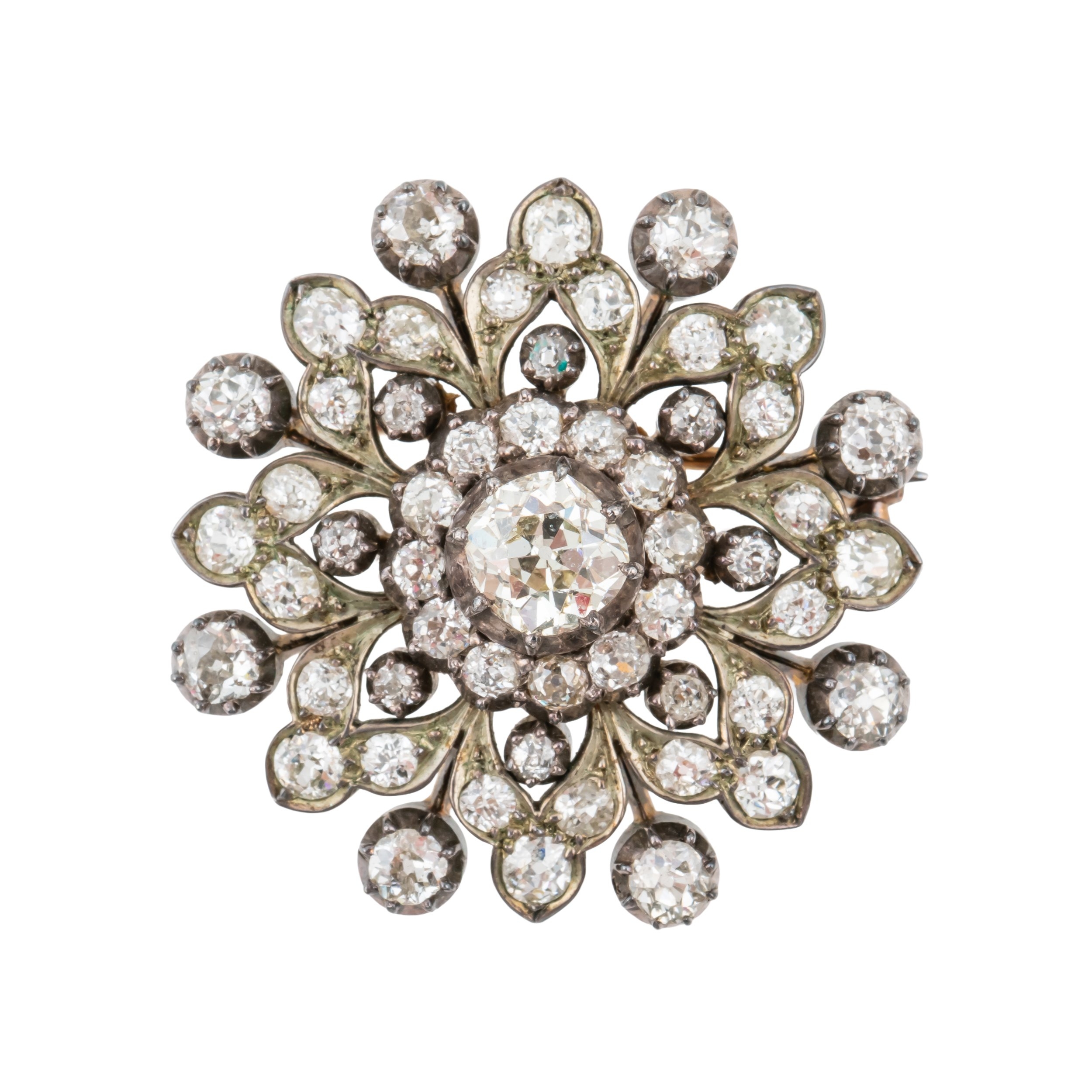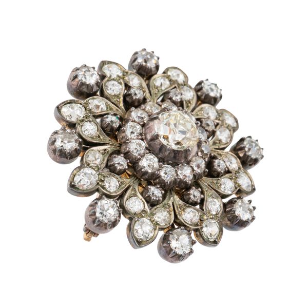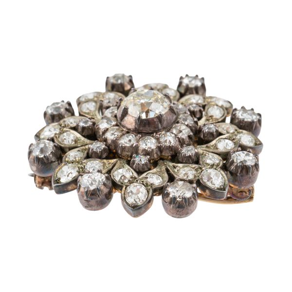 With a central old cut diamond weighing approximately 1.30 carats, surrounded by further old cut diamonds in an openwork design, mounted in silver on gold with a later pin and catch, measuring approximately 33.3mm in diameter, gross weight 16.5 grams