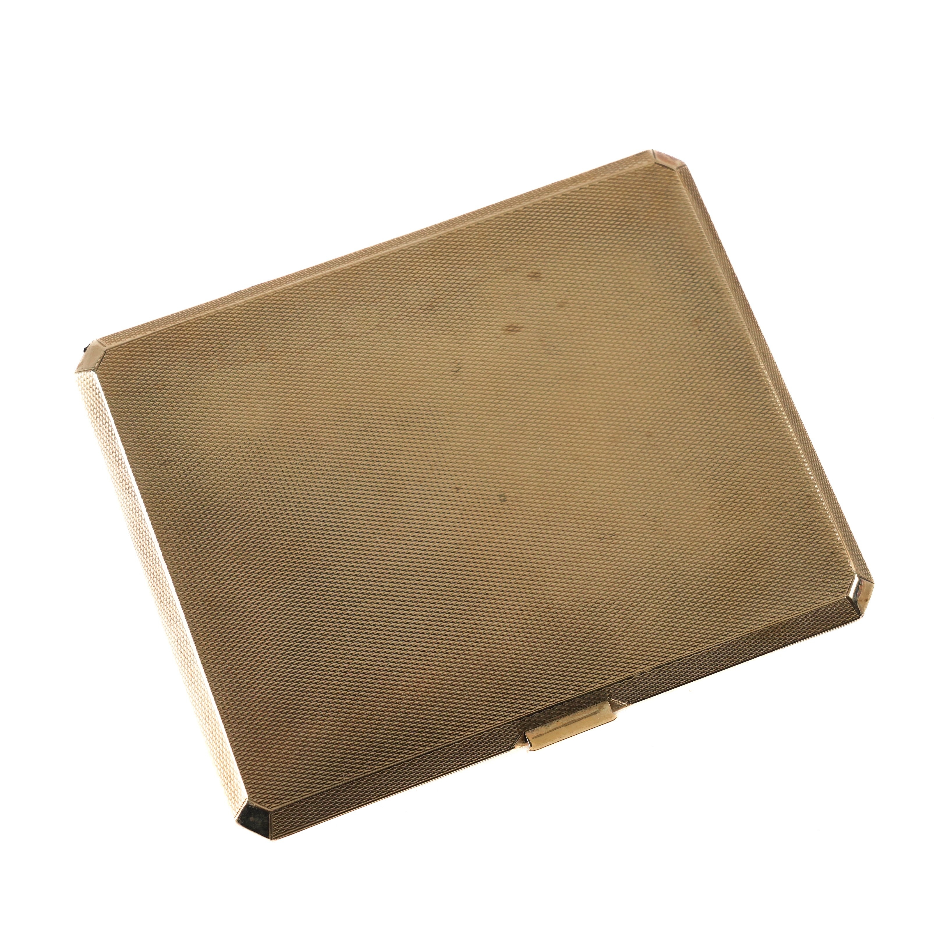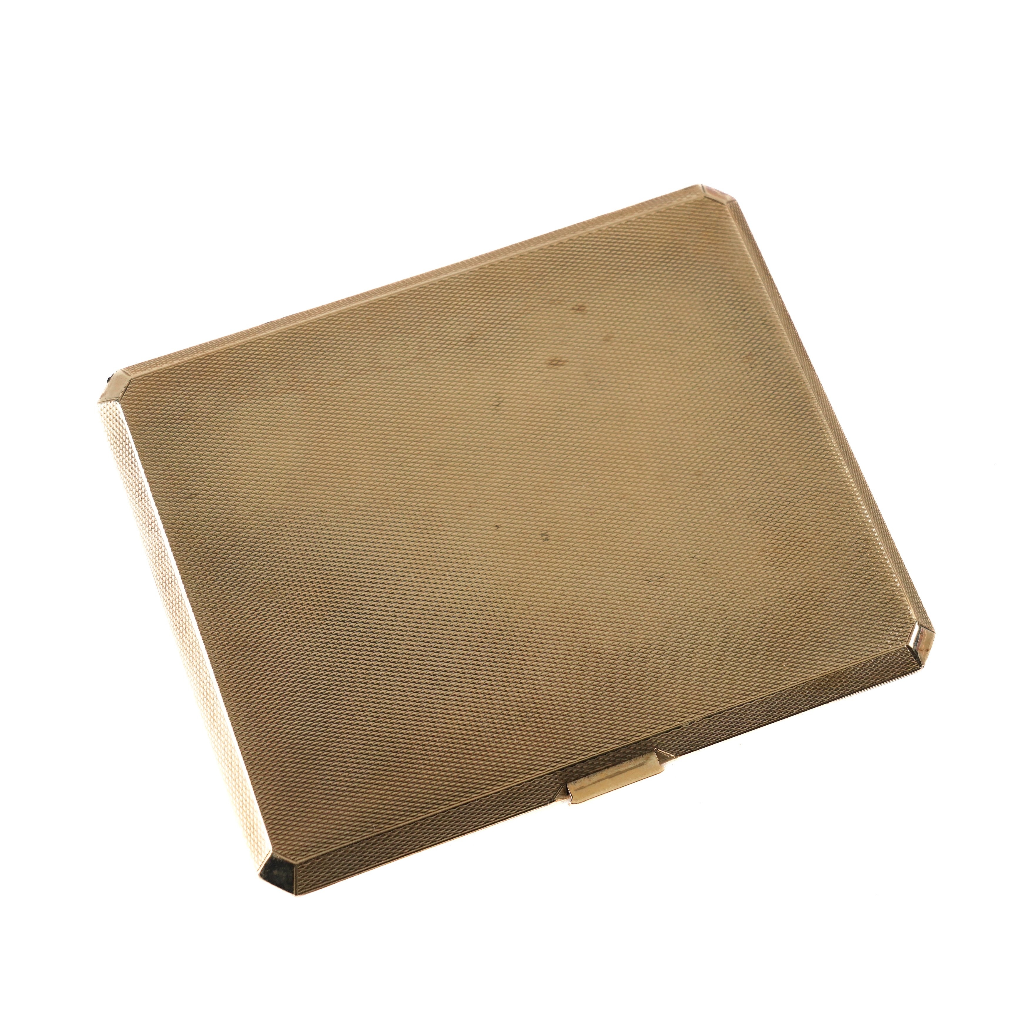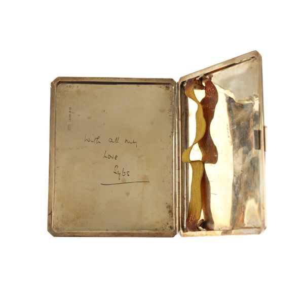 With engine turned decoration to the exterior, hallmarked London 1930, and engraved to the inside 'With all my love Sybs', measuring 103mm x 83mm, gross weight 117.1 grams