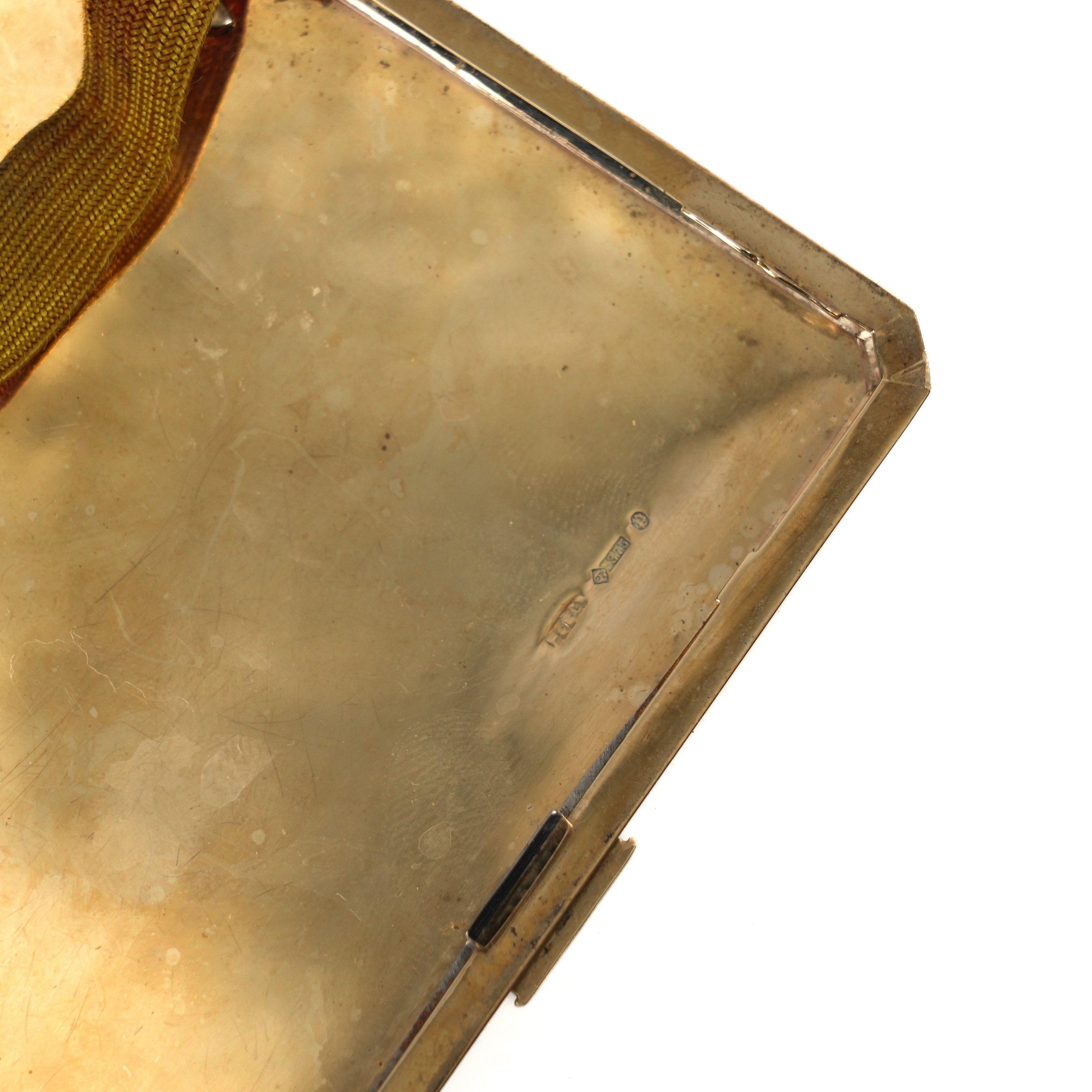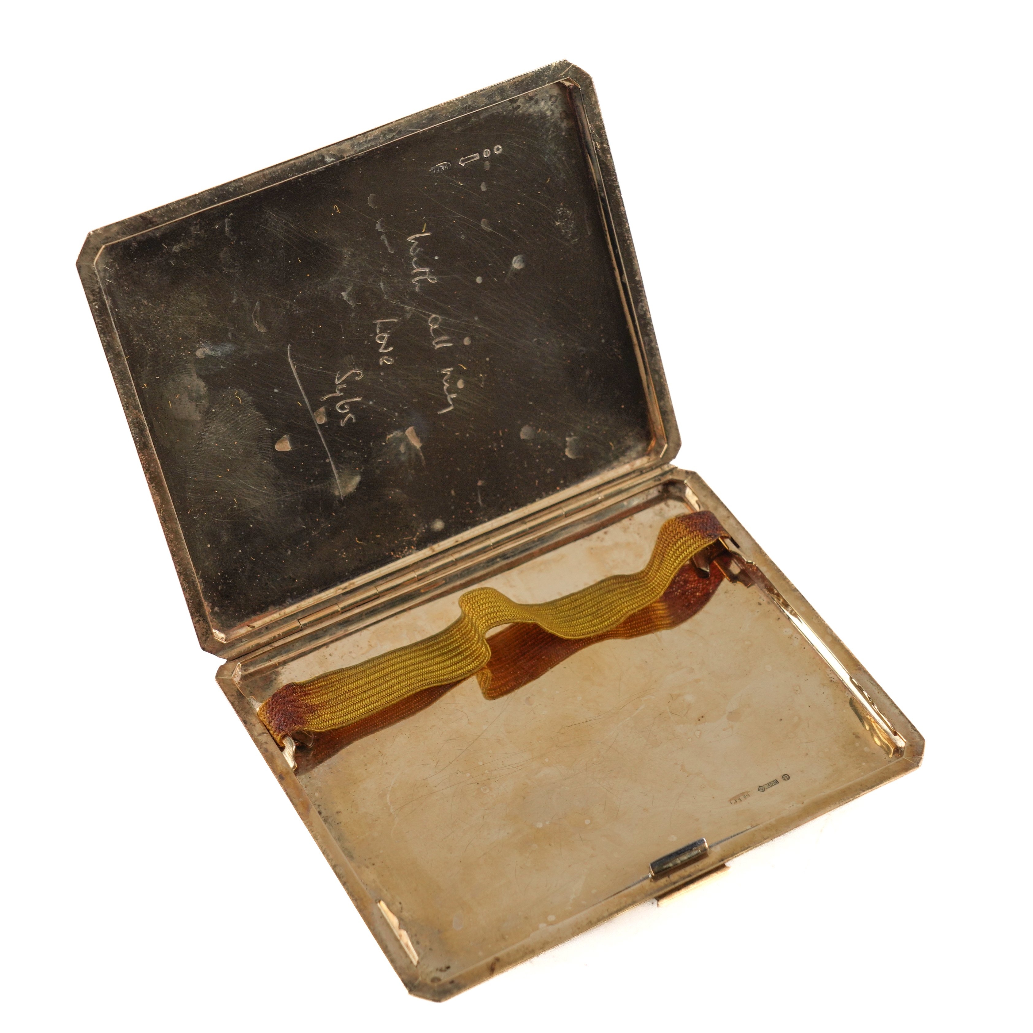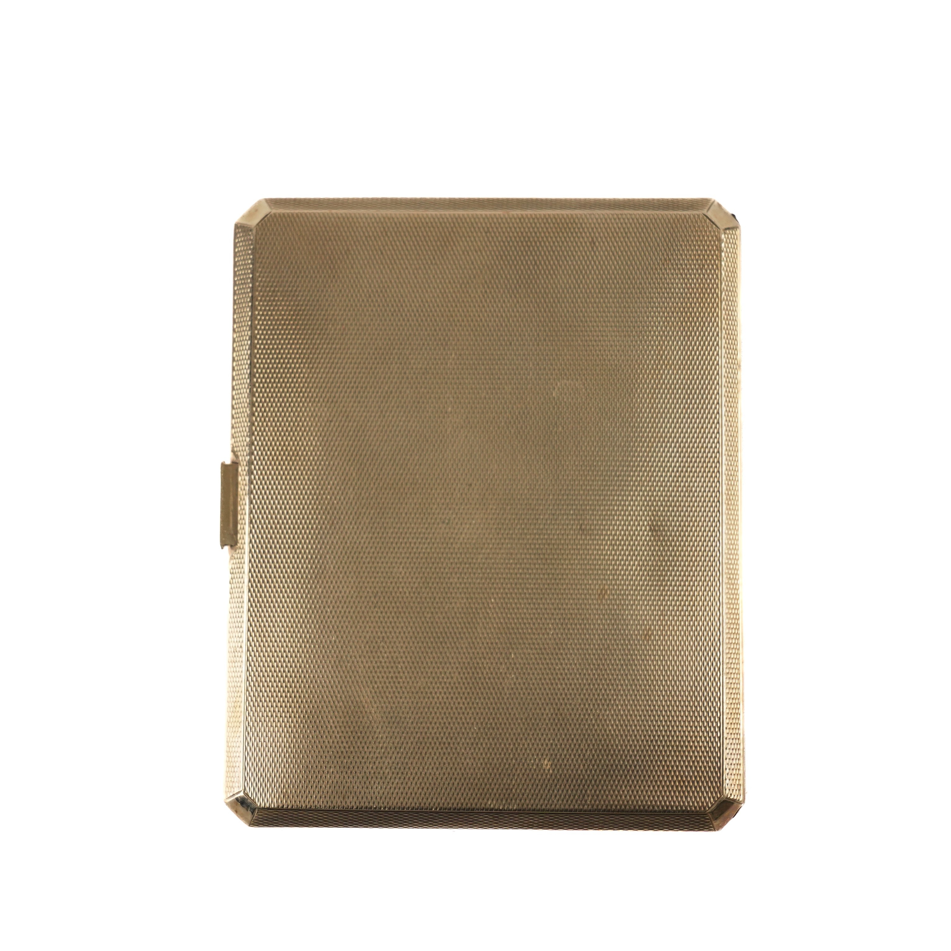 With engine turned decoration to the exterior, hallmarked London 1930, and engraved to the inside 'With all my love Sybs', measuring 103mm x 83mm, gross weight 117.1 grams