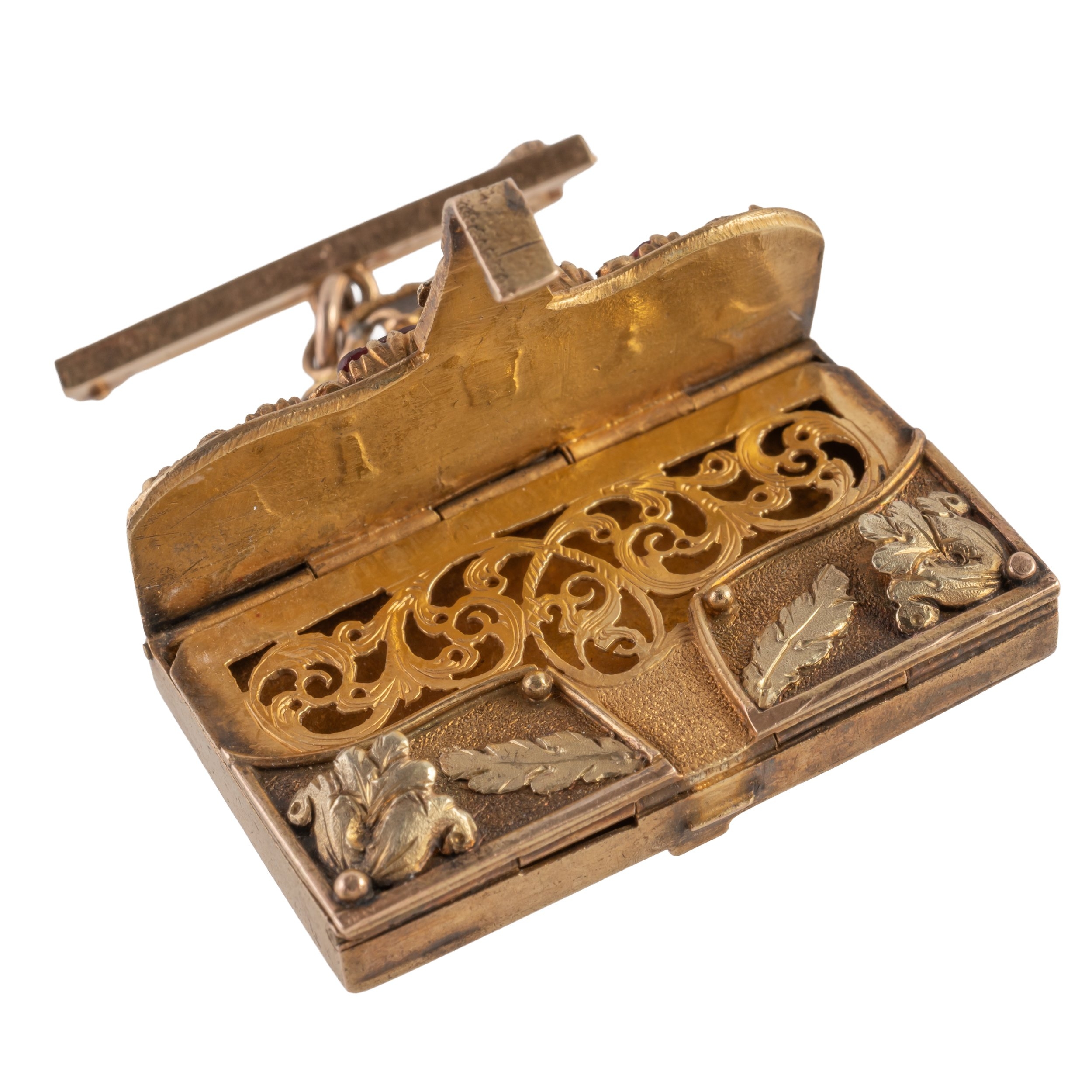 The front of the envelope form vinaigrette mounted with a ruby, emerald, garnet, amethyst, ruby and diamond to spell 'regard', with floral and foliate motifs in gold, suspended from a bar with a further textured heart shaped pendant, the reverse with hairwork behind a glazed panel, all in unmarked gold, gross weight 13.5 grams, with a box
