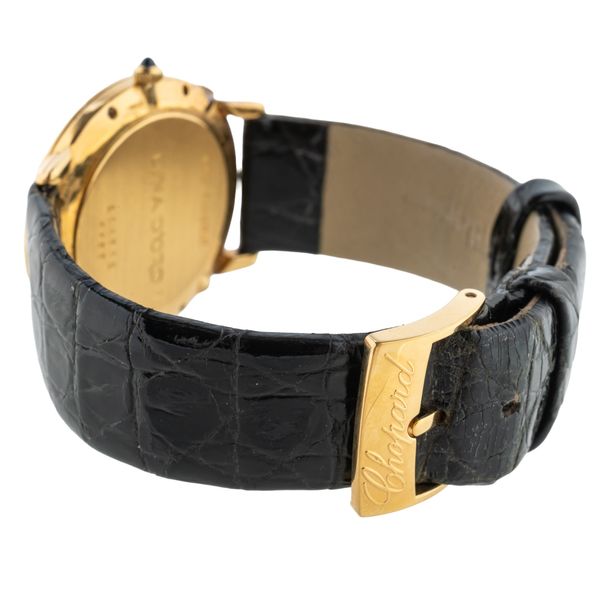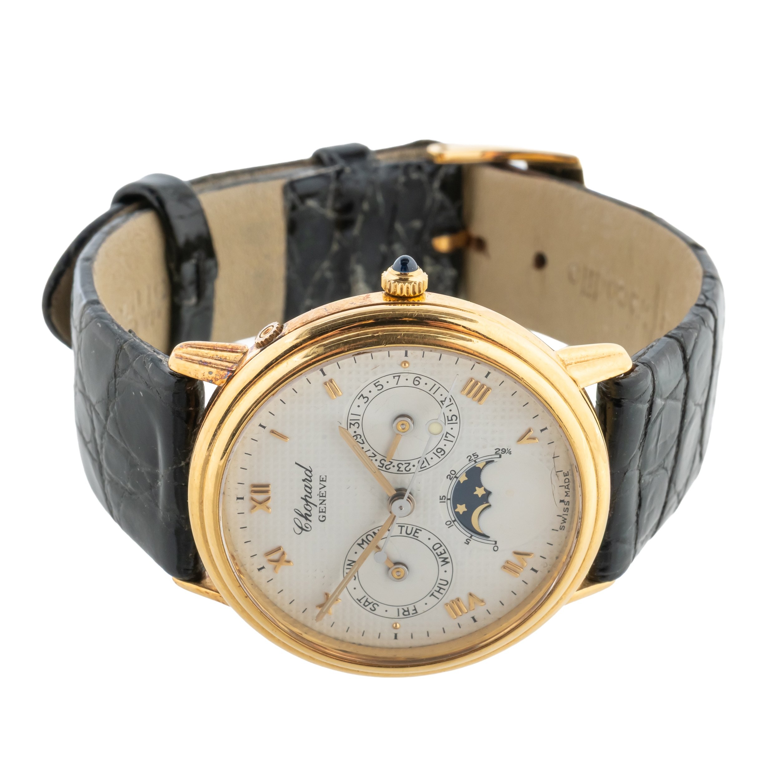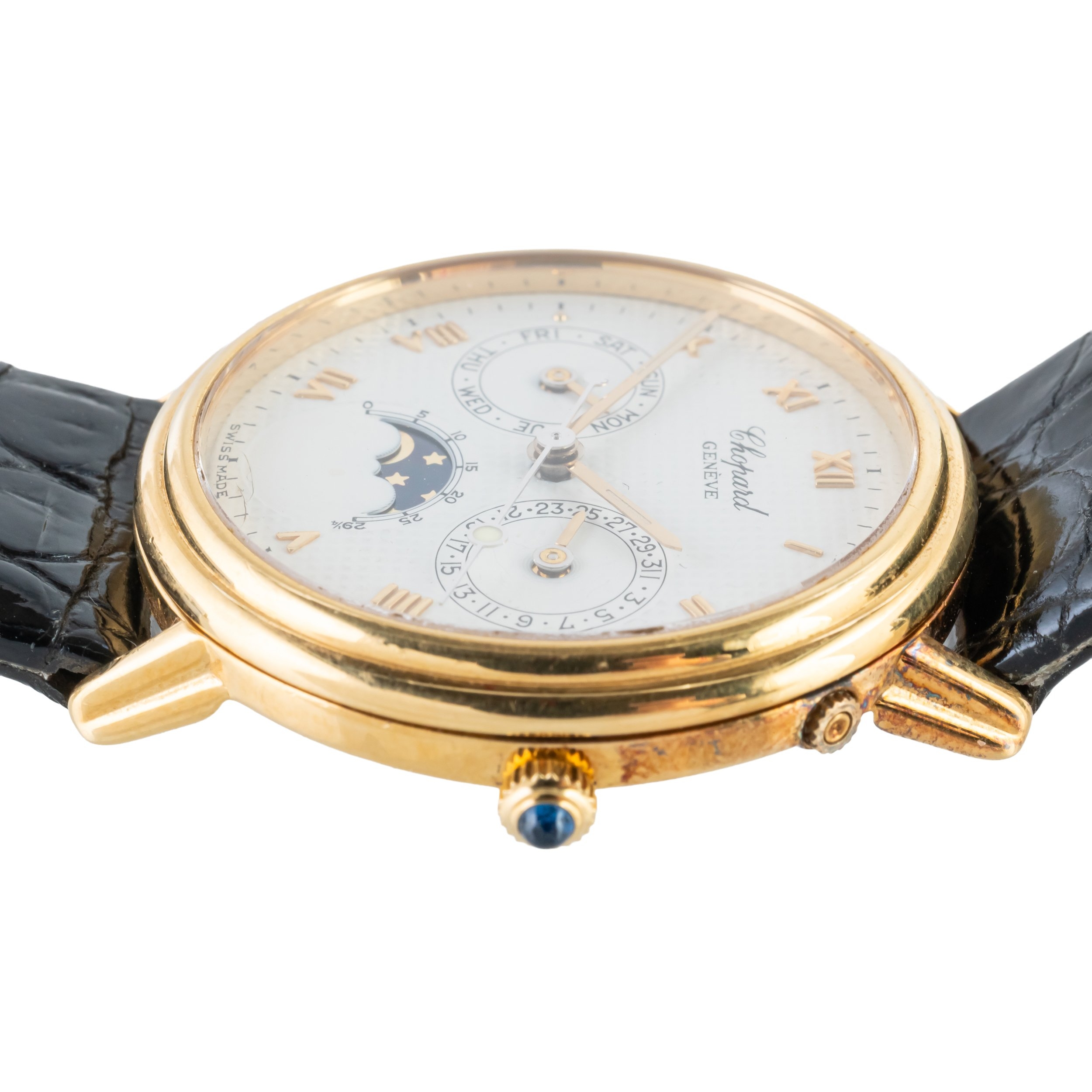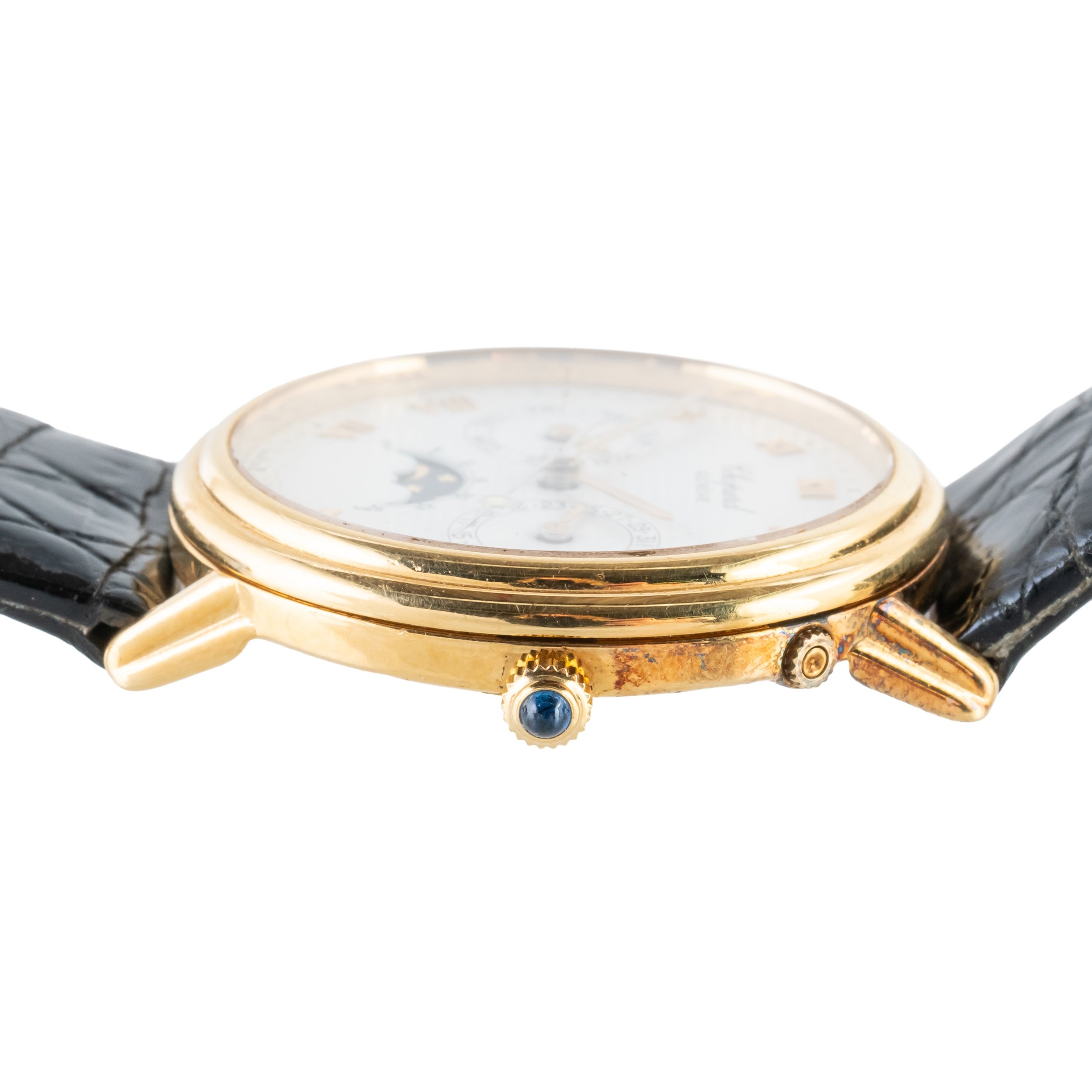 The signed circular white dial with subsidiary dials for day of the week, date of the month and moonphase, with gilt Roman numerals and with centre seconds, with a 32mm 18ct yellow gold case with a cabochon sapphire set crown on a leather strap with a gold-plated Chopard buckle. Serial: 241712 Papers: Yes. Box: No