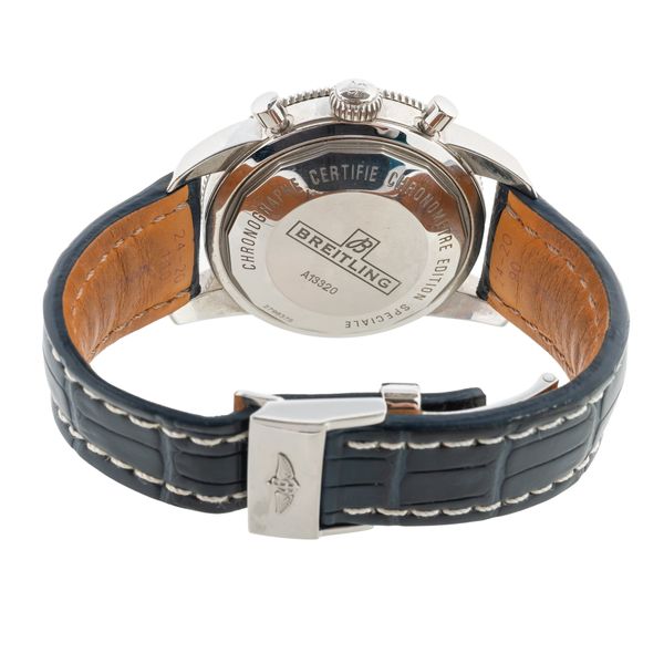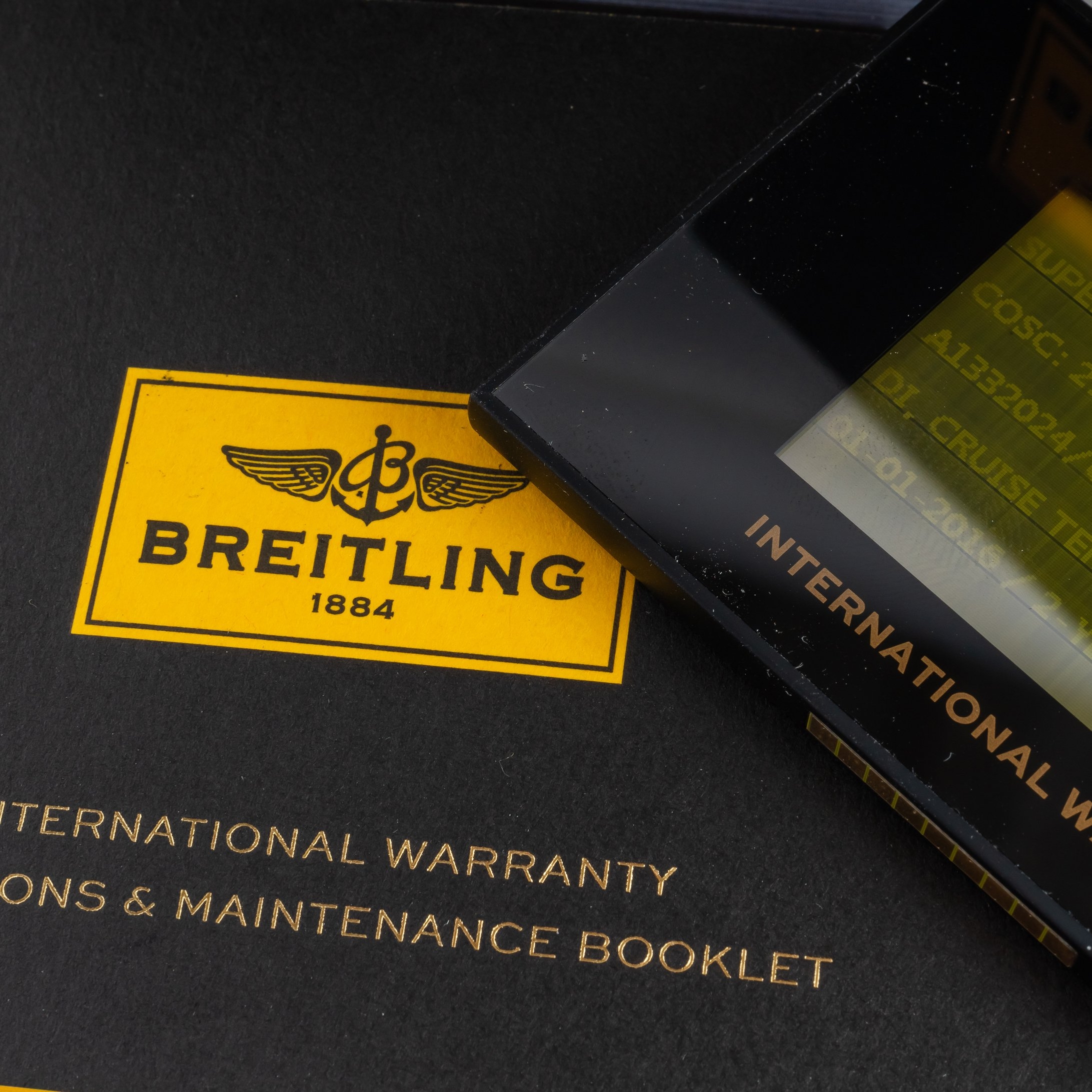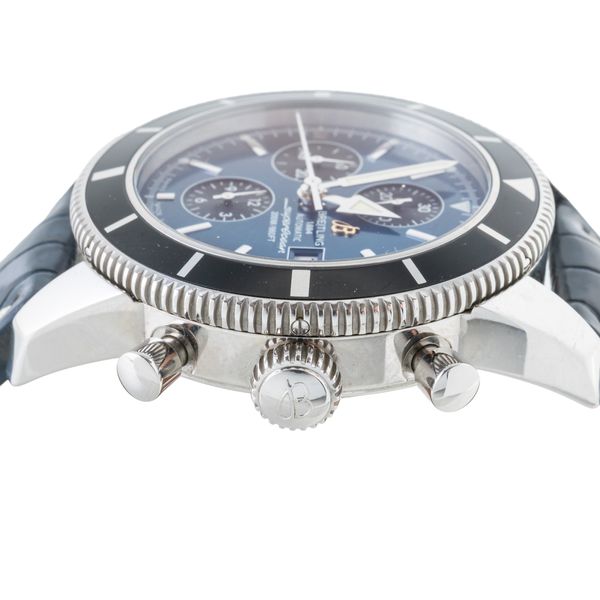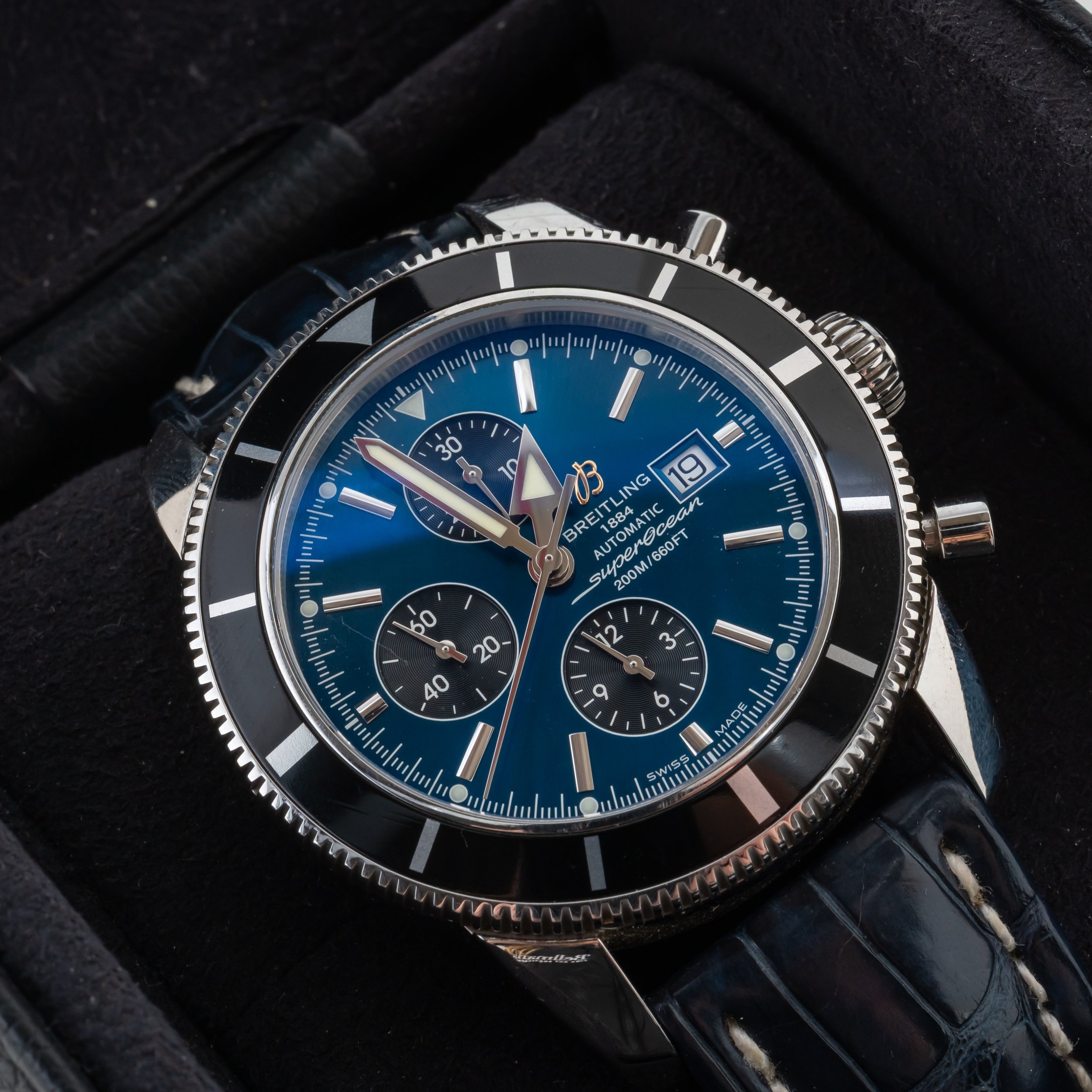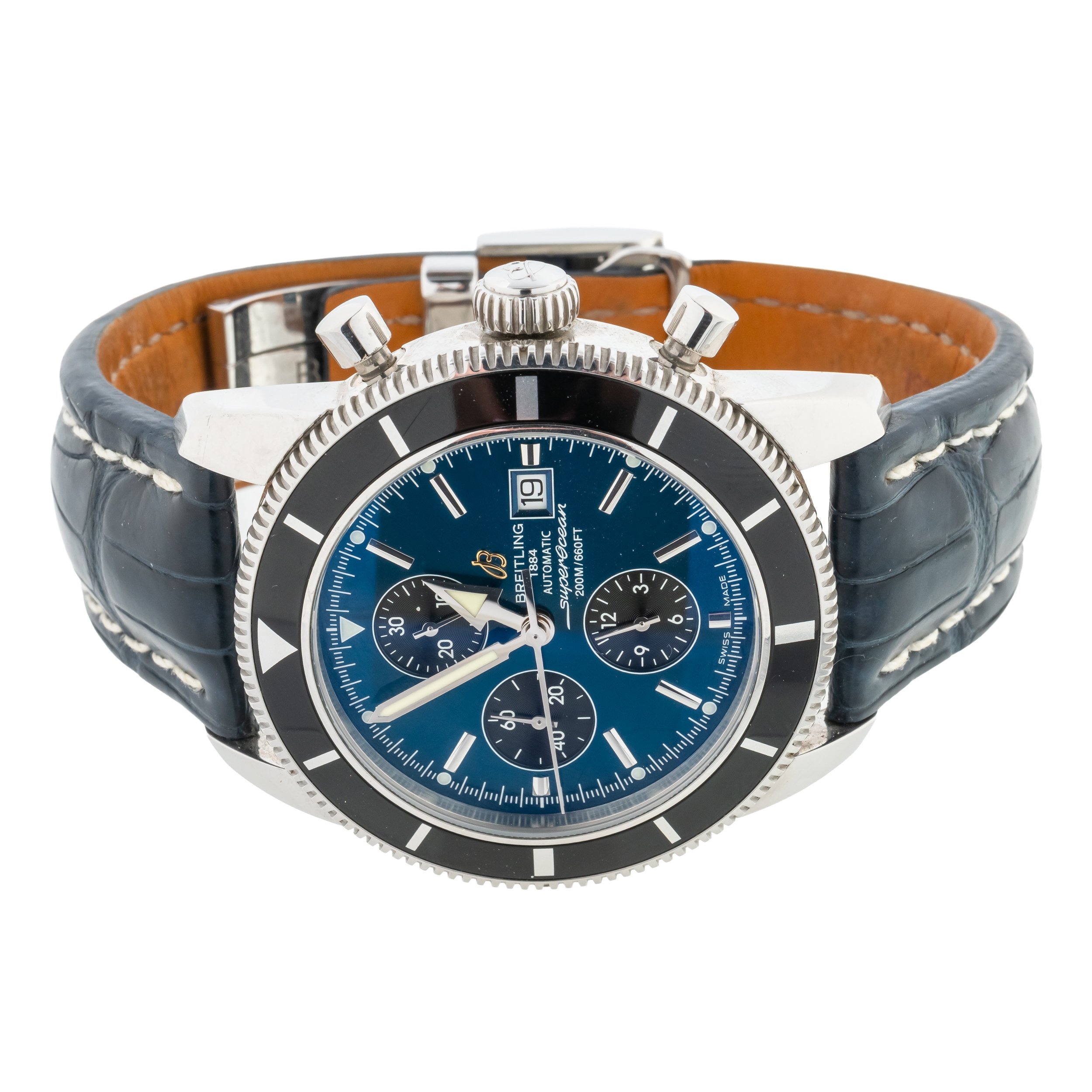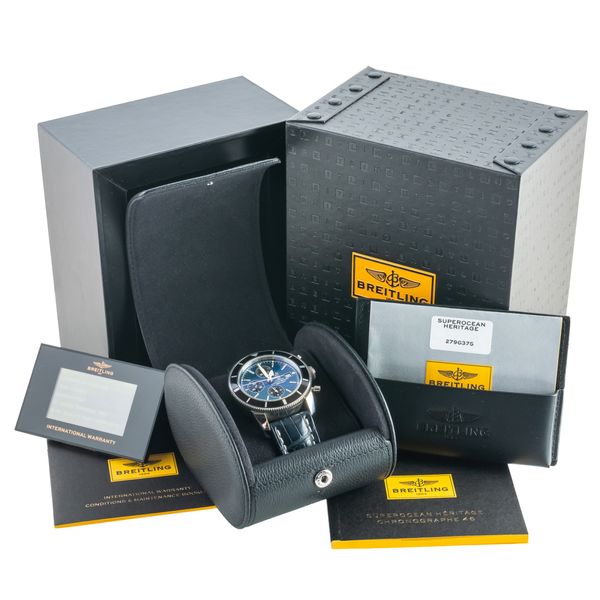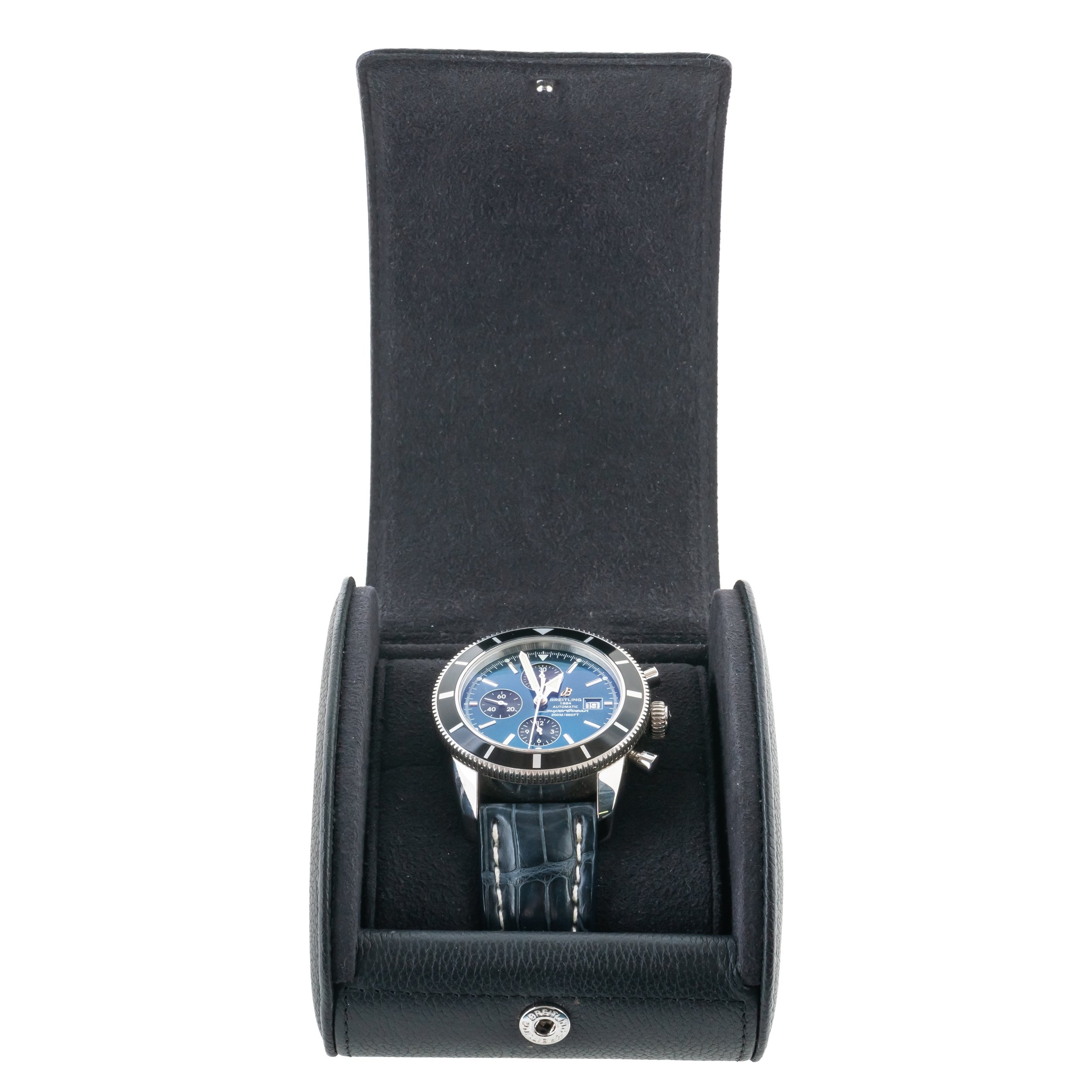 A 2016 Breitling Heritage SuperOcean Chronograph automatic watch featuring a Swiss-made automatic movement in a steel case measuring 45mm with a blue dial and black bezel, with date aperture, all on a blue leather strap. Model: A1332024/C817 Serial: 2796378 With Box and Papers.