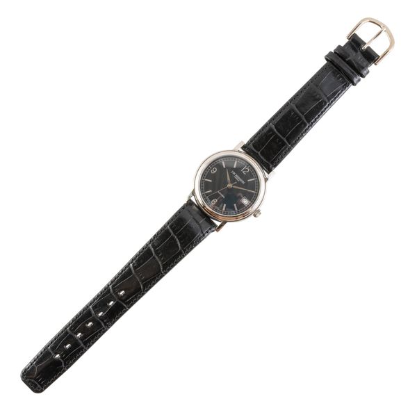 Featuring a Swiss-made automatic ETA 2892A2 movement in a steel case measuring 34mm with exhibition case back, a black dial with date aperture with sapphire crystal glass, all on a black leather strap with pin buckle.