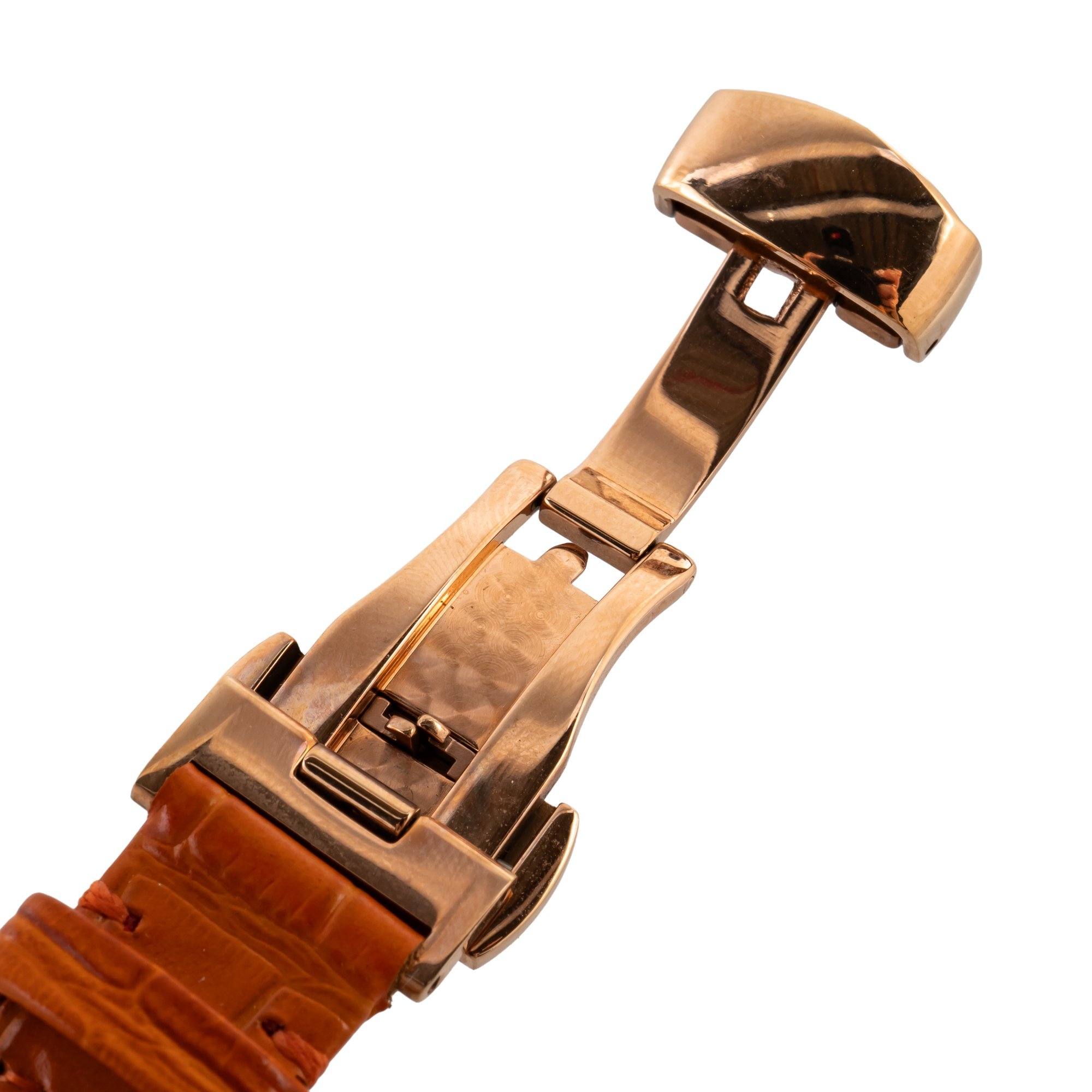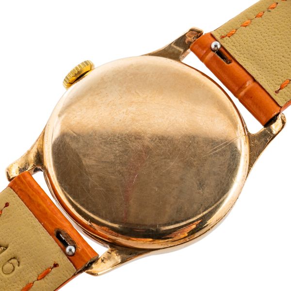 Featuring a Swiss-made handwound movement in a yellow metal case, Chester hallmarked 9ct gold 1953 and measuring 30mm with a white dial and seconds subdial on an orange leather strap with a generic folding clasp.