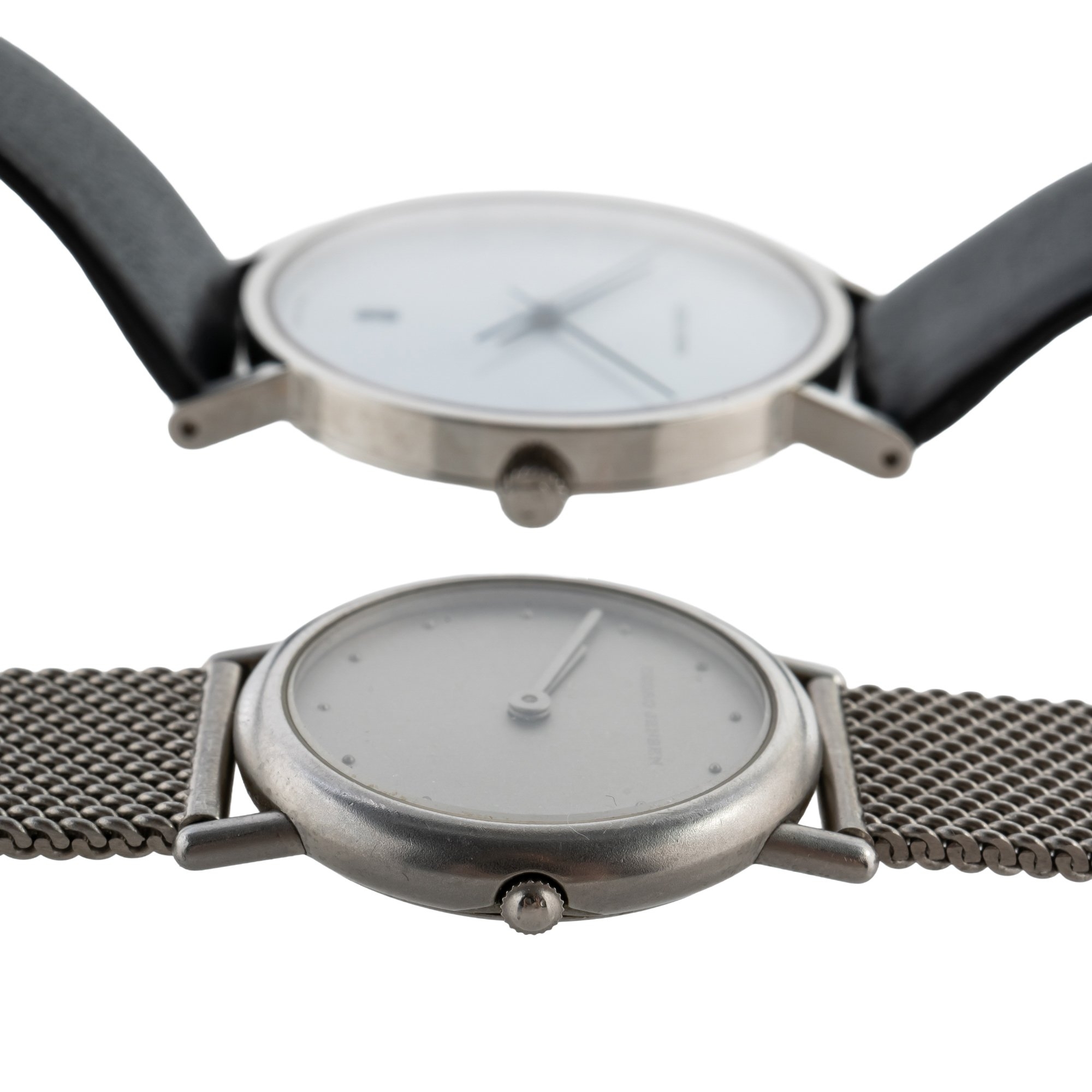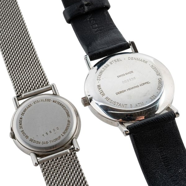 The first Georg Jensen watch No. 346 with serial 15600 features a quartz movement in a steel case measuring 25mm with a mesh strap.