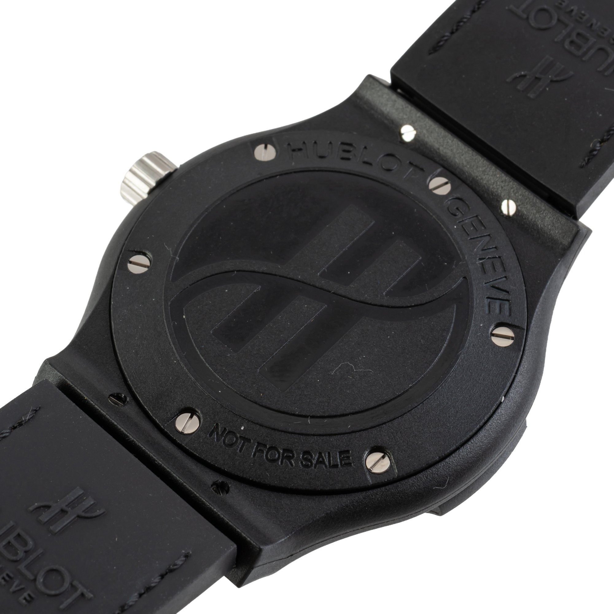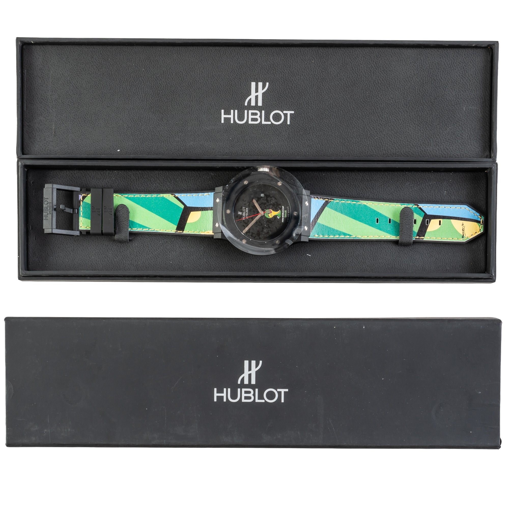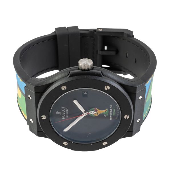 Featuring a Swiss-made quartz movement in a plastic case measuring 46mm with a black dial signed Hublot Atelier on a rubber strap. The watch was gifted to VIP visitors to the 2014 Brazilian World Cup. With box.