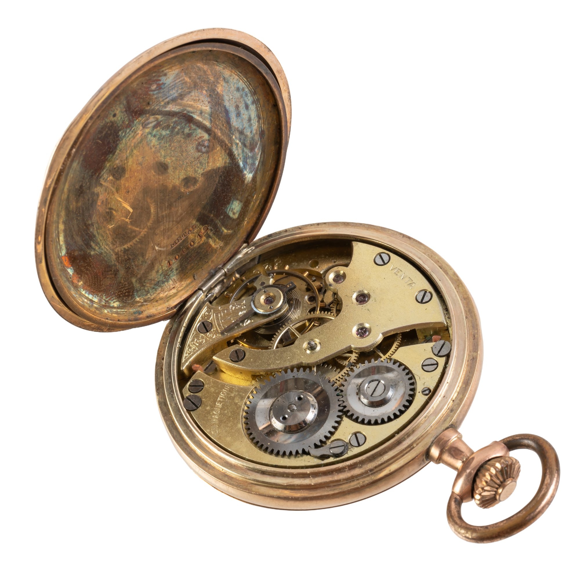 Featuring a handwound movement signed Venta in a yellow metal case stamped 9C and measuring 48mm with an engraved case front. Total weight of item: 72.0 grams