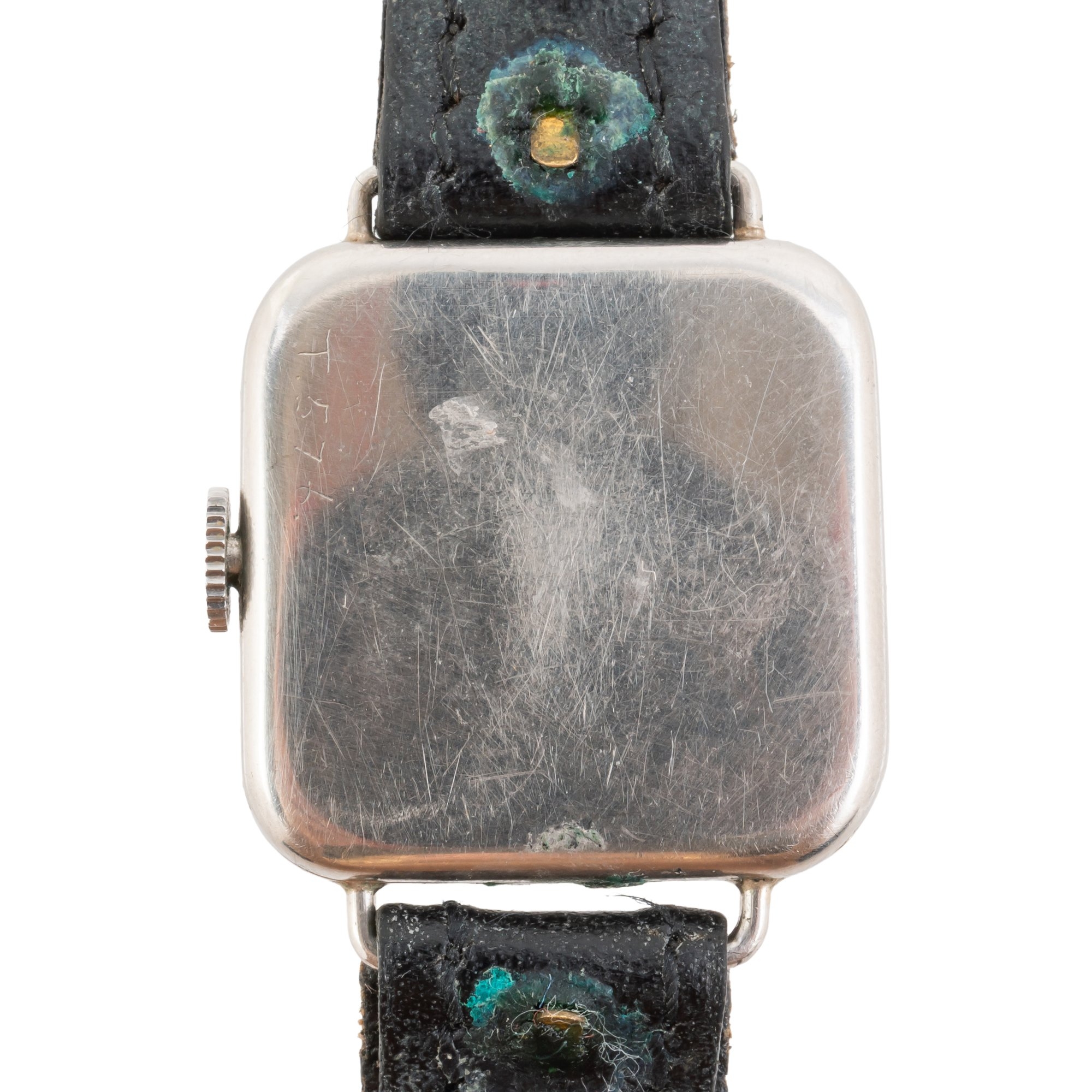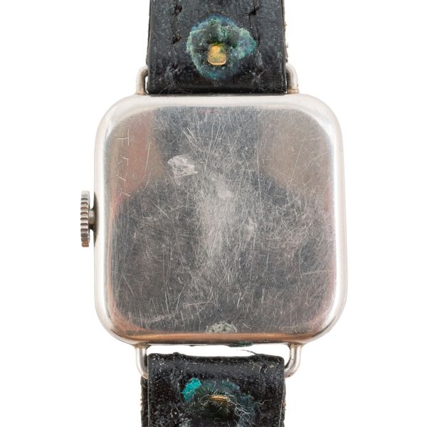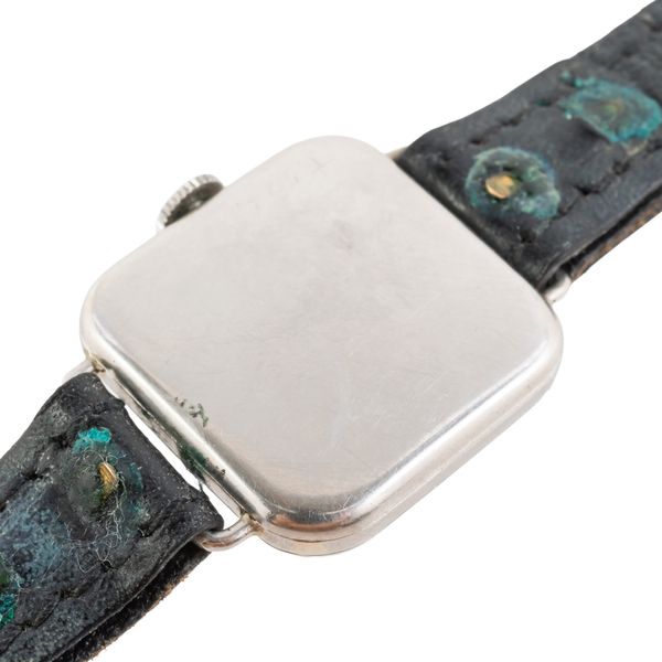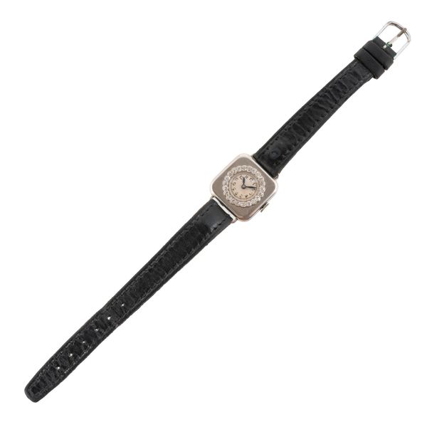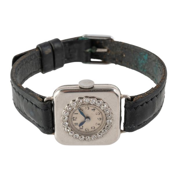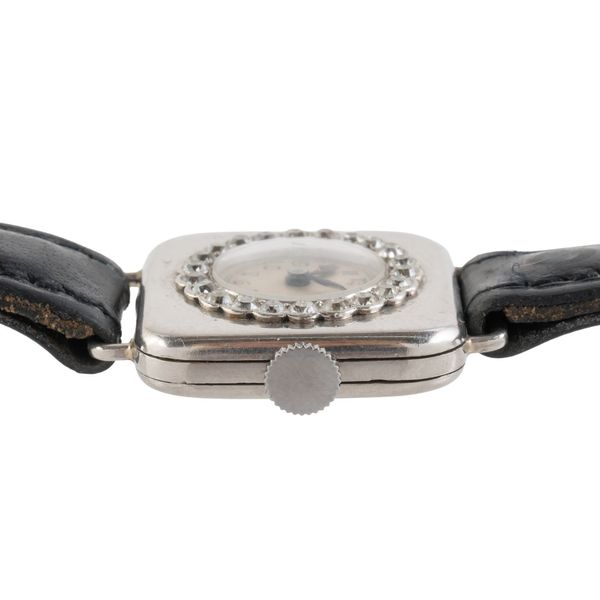 A LADY'S PLATINUM CASED AND DIAMOND SET SQUARE CASED DRESS WRISTWATCH