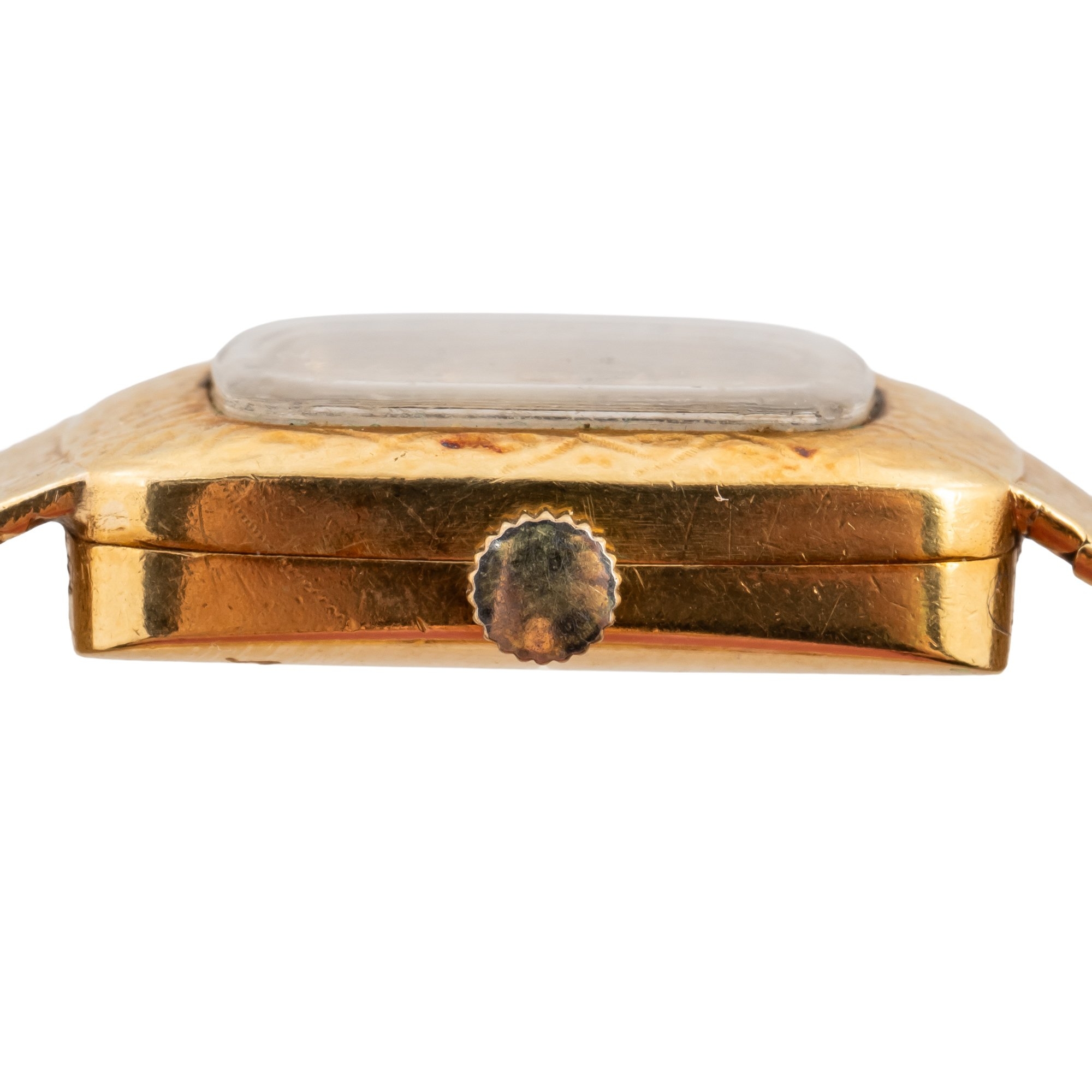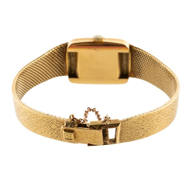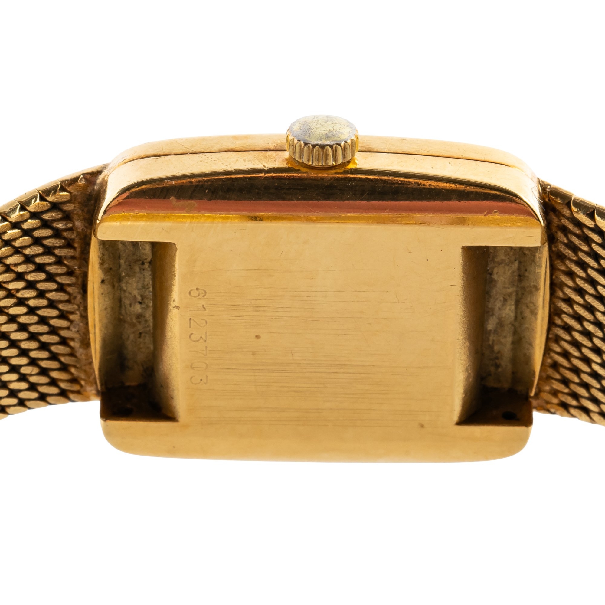 Featuring a Swiss-made handwound movement in a yellow metal case stamped 18kt and measuring 20mm wide with a silver dial, all on an integrated bracelet with a folding clasp. Total weight of item 43.7 grams