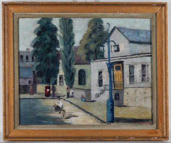 Street scene, France signed 'MURIEL BENDER' (lower right) and dated 'JULY 1955' (verso) oil on canvas 41 x 51cm ARR