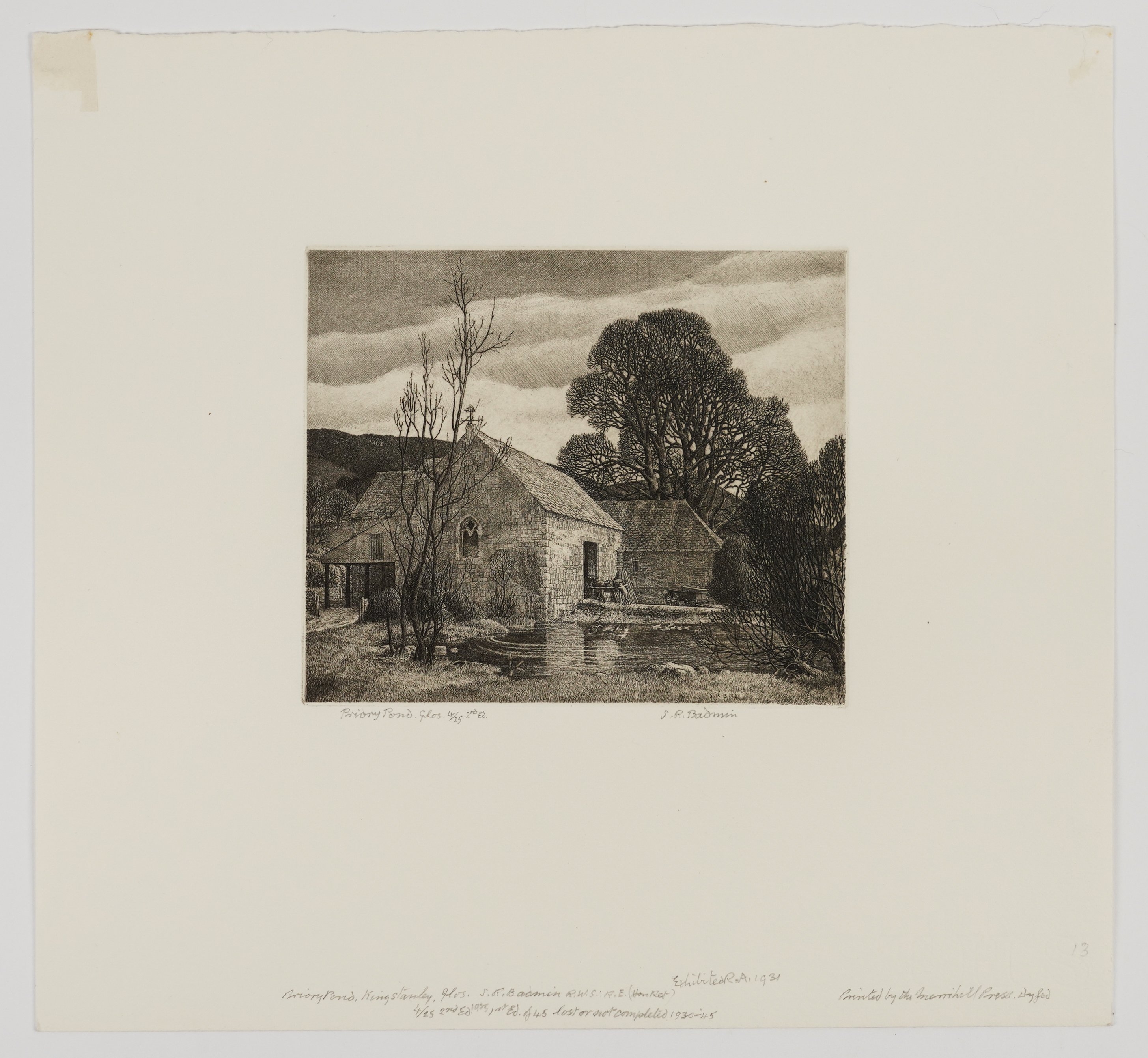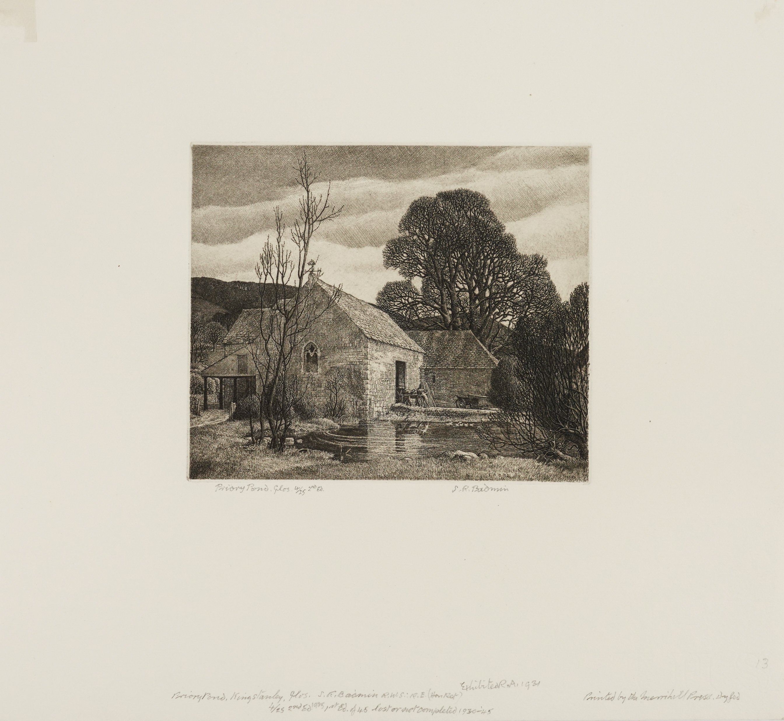 signed, titled, numbered and inscribed 'S.R. Badmin/ Priory Pond. Glos 4/25 2nd Ed./ Exhibited R.A. 1931/ Priory Pond, Kingstanley, Glos. S.R Badmin R.W.S.: R.E. (Hon -)/ 4/25 2nd Ed 1925 1st Ed. of 45 lost or not completed 1930-45/ Printed by the Merrill Press. Dyfed' (lower margin)