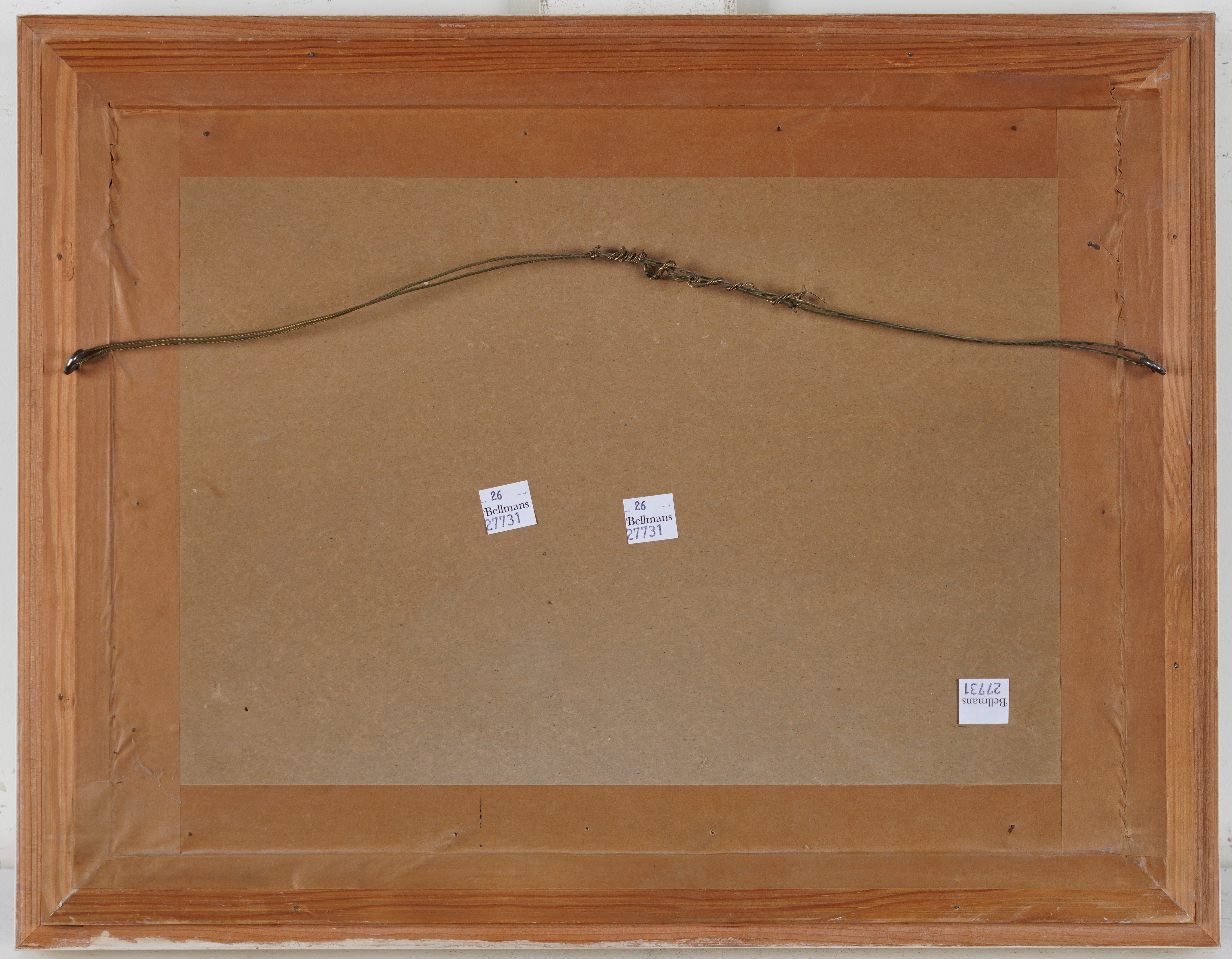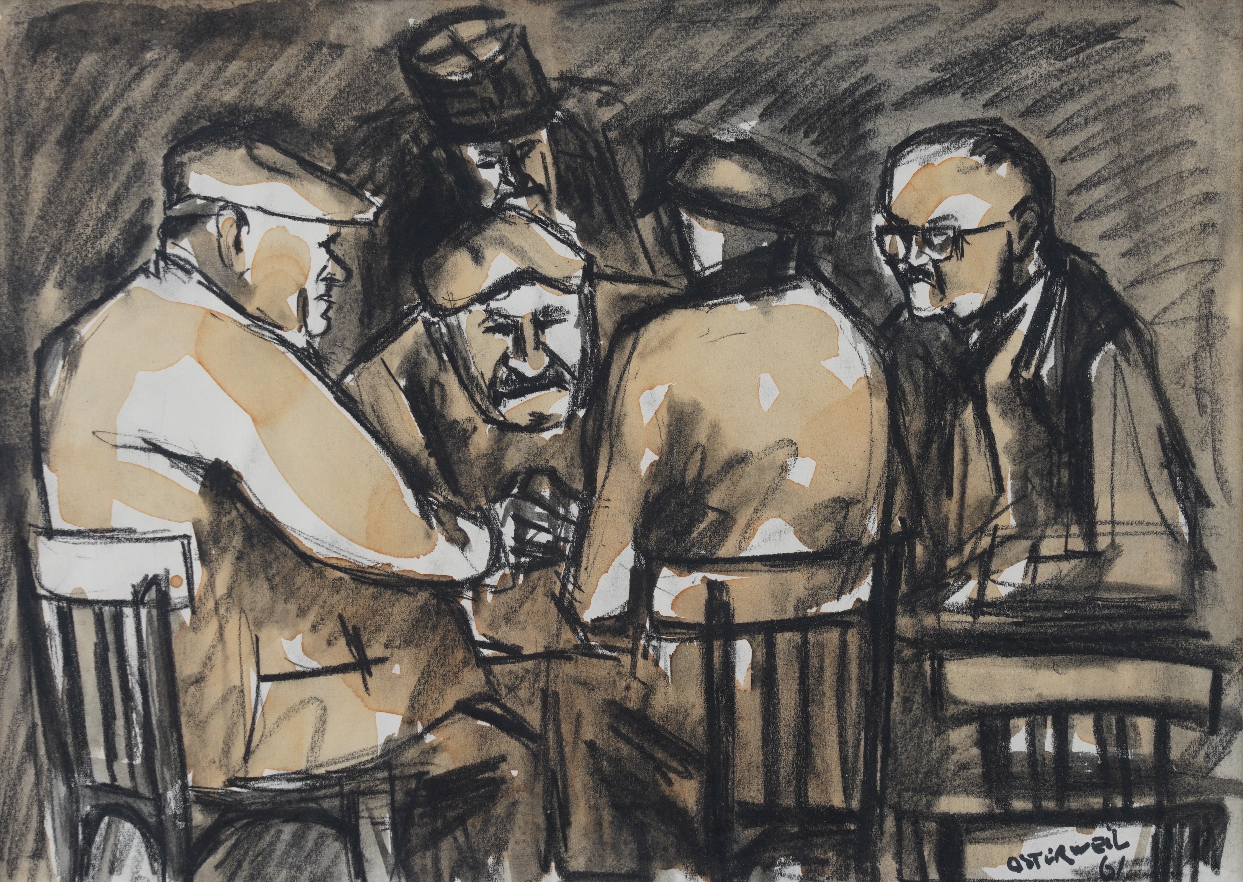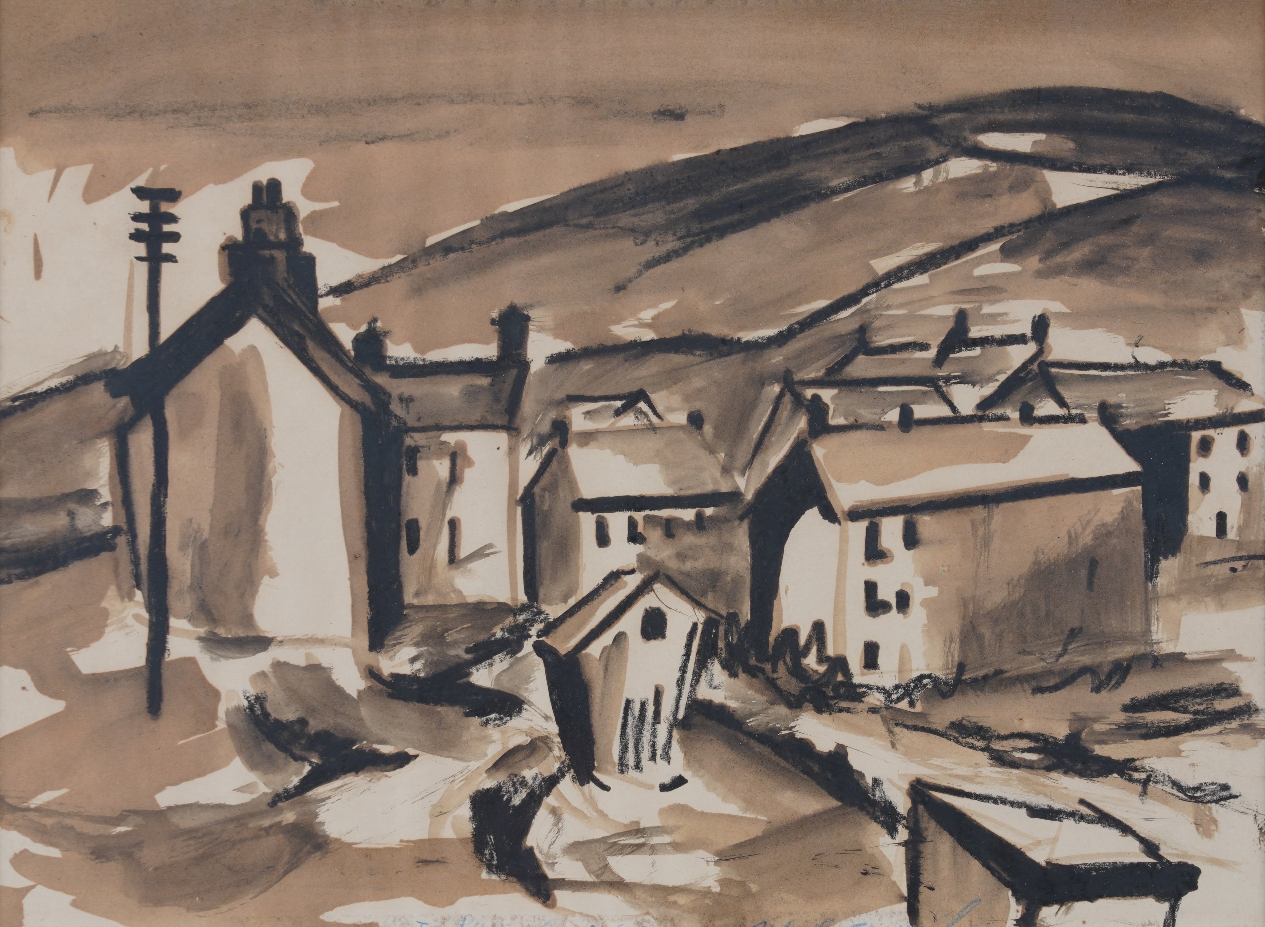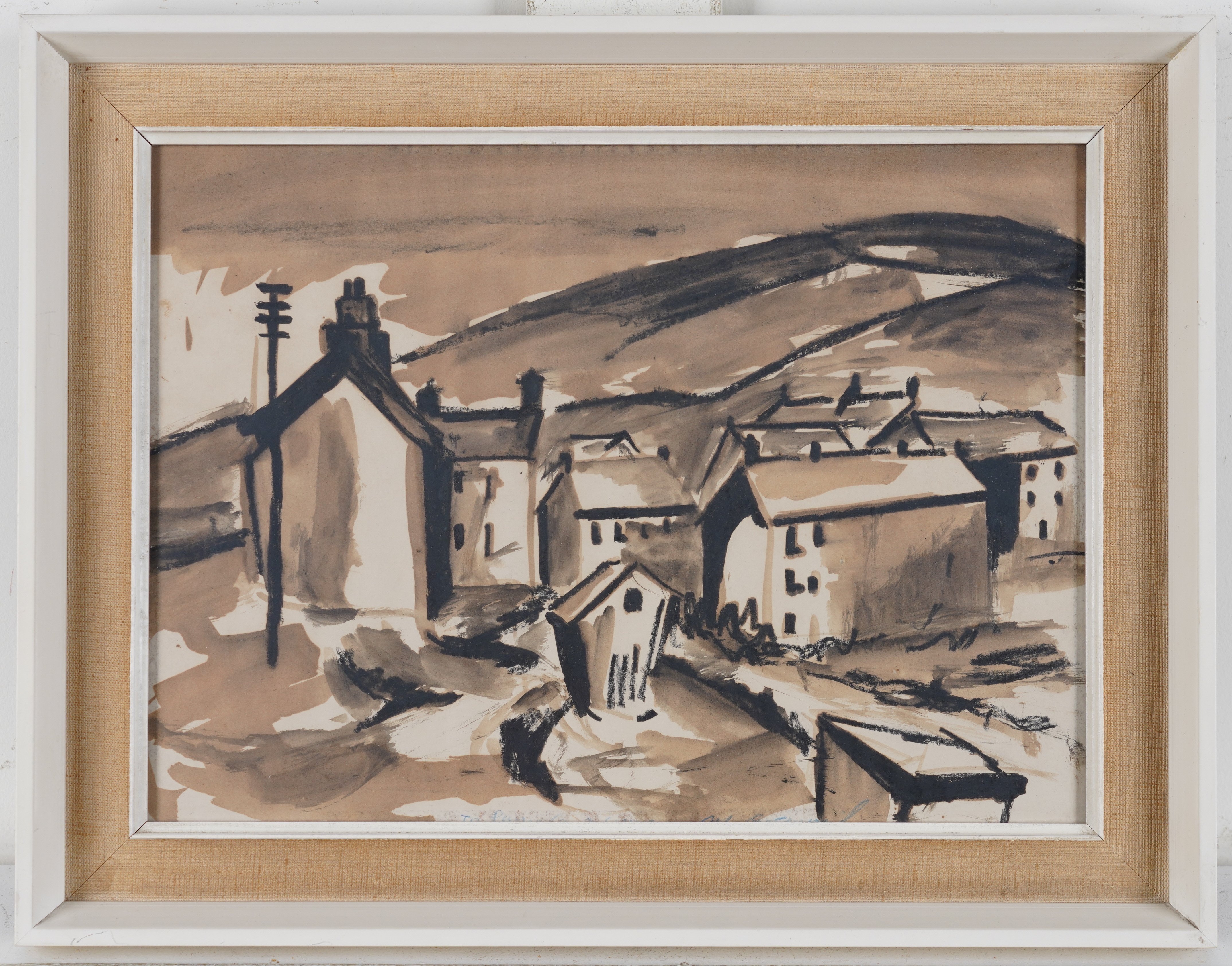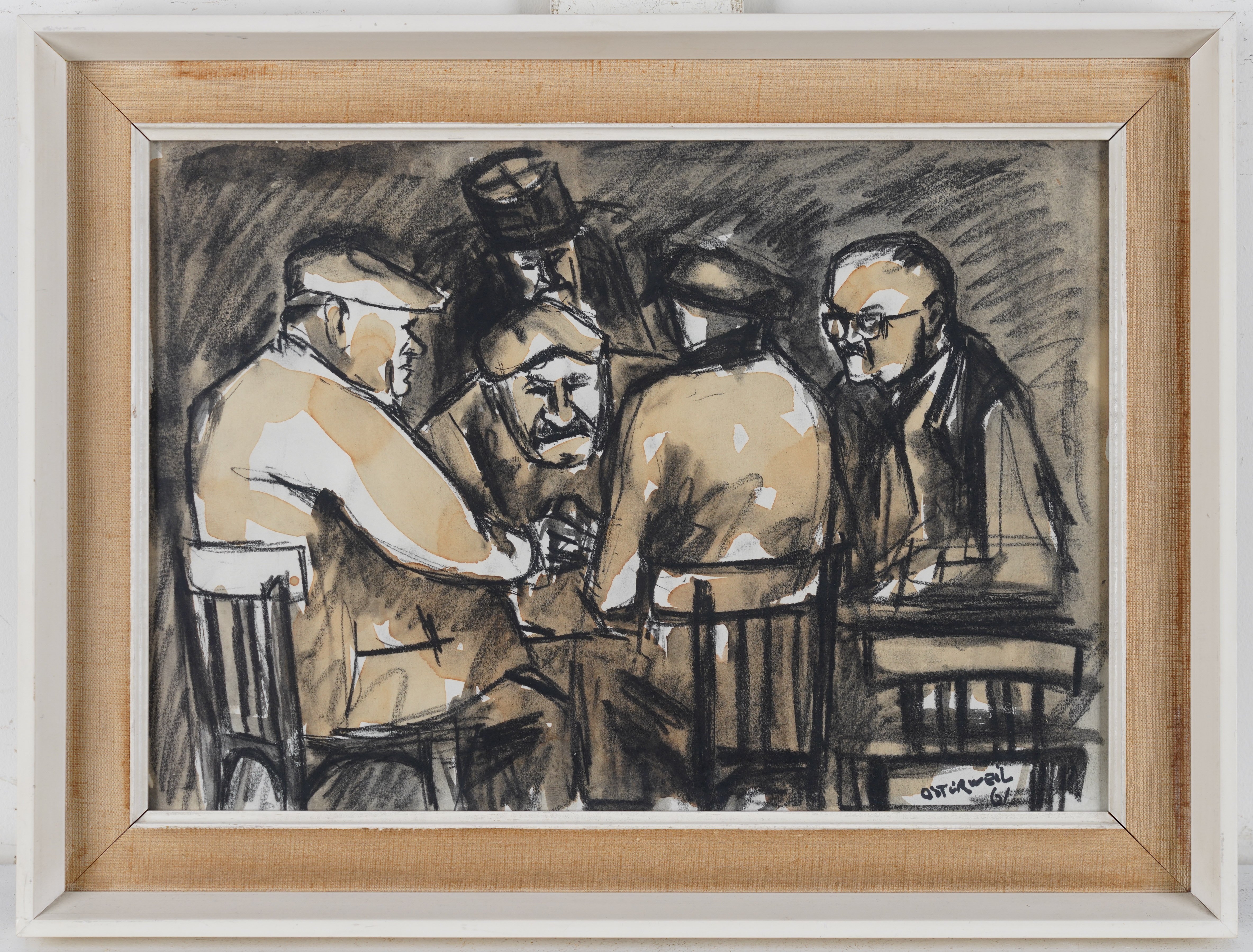 together with two watercolour and charcoals by the same hand, Men gathered around a table, signed and dated '61', 25 x 35cm; and Cottages in a landscape, 25 x 35cm