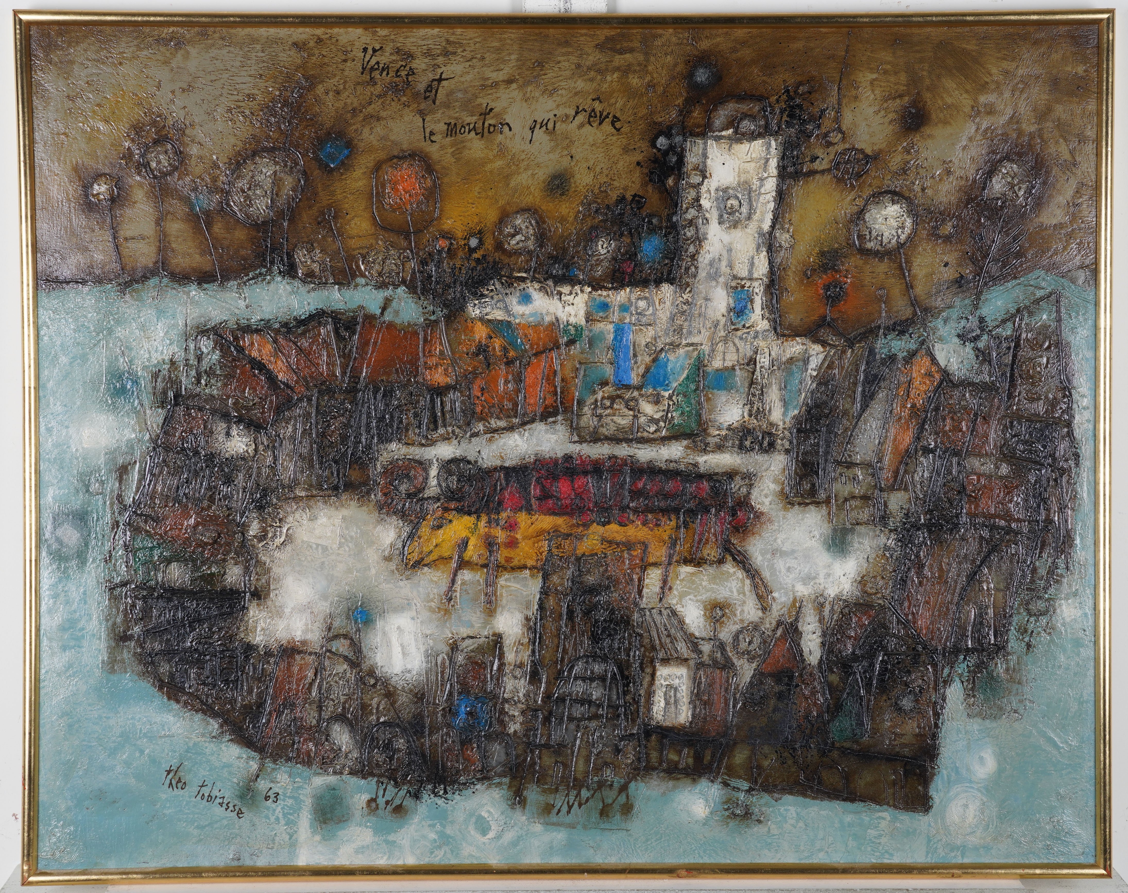 signed 'theo tobiasse' (lower left), titled 'Vence et le mouton qui reve' (upper centre) and further signed 'Theo tobiasse' (verso)