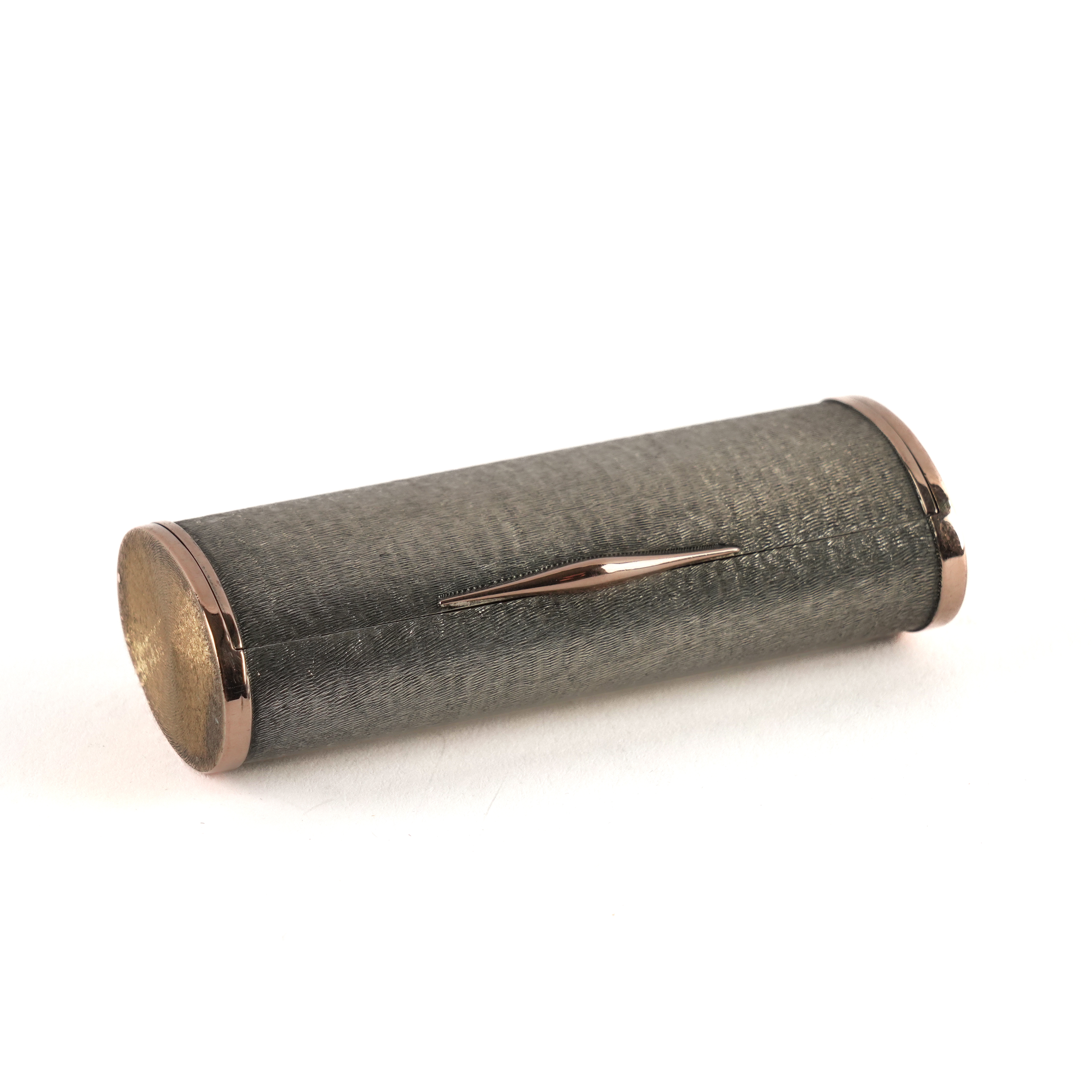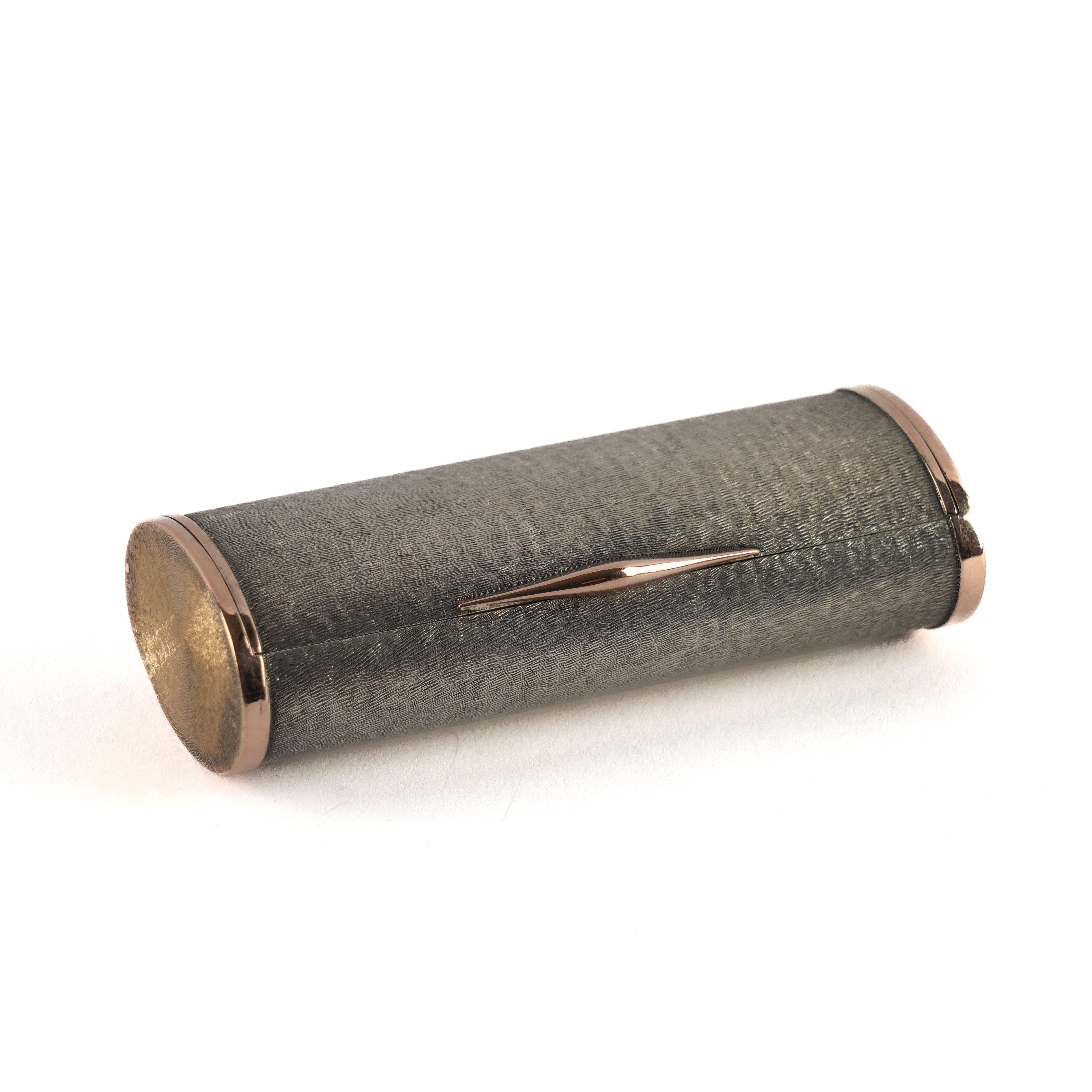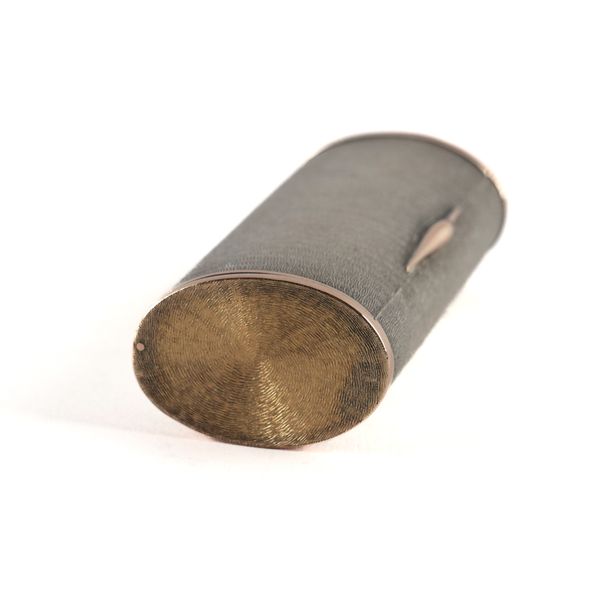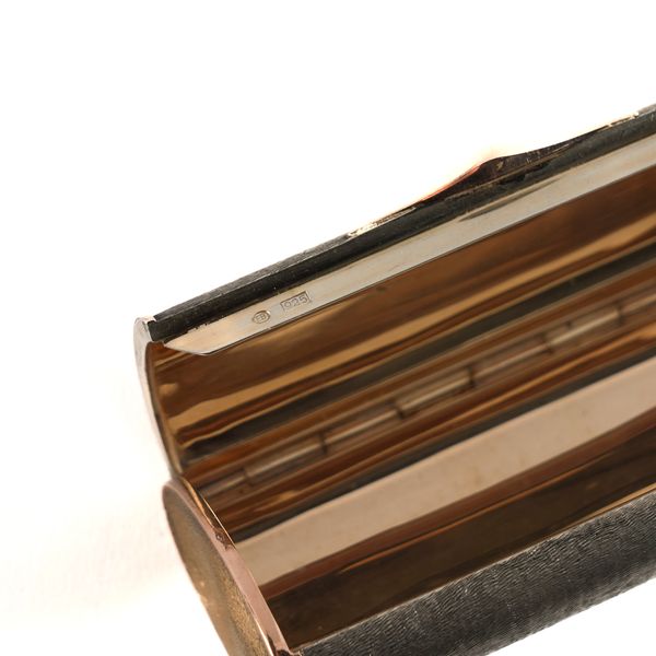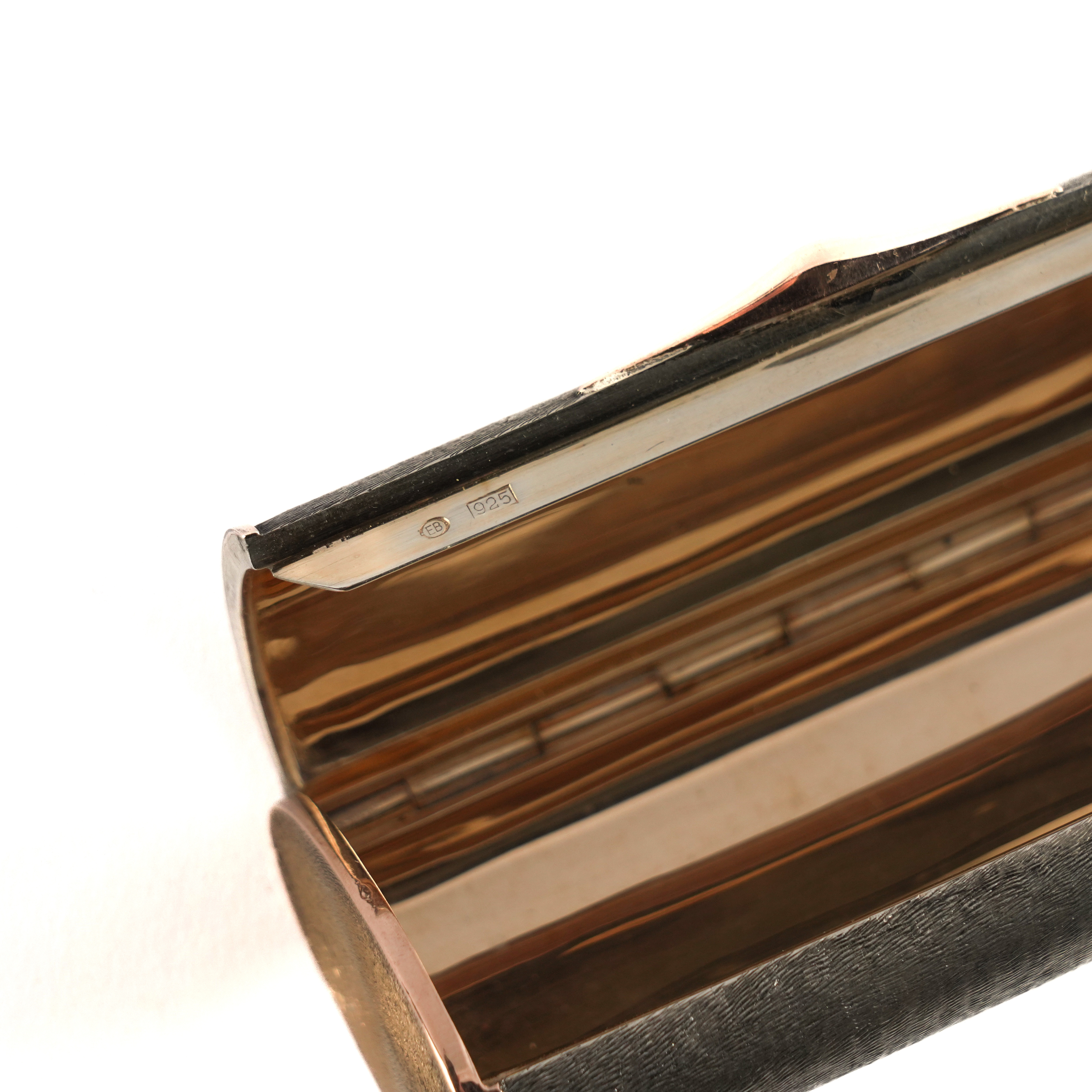Of oval form, gilt within, the exterior with a textured finish, with applied gilt ends and a gilt metal thumbpiece, detailed E B 925, length 9cm 103 grams