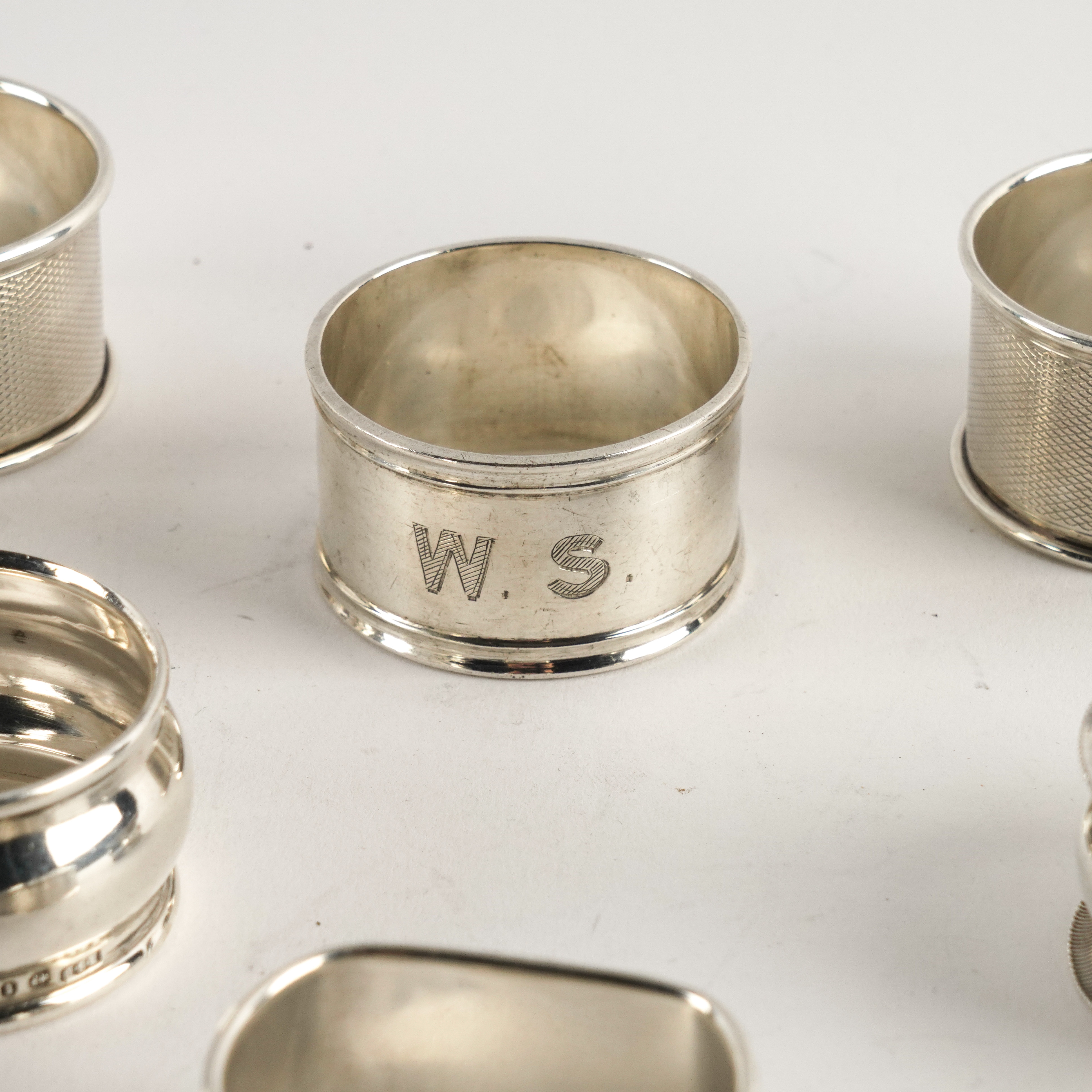 To include; two pairs of napkin rings, both having engine turned decoration, various dates, combined weight 220 grams