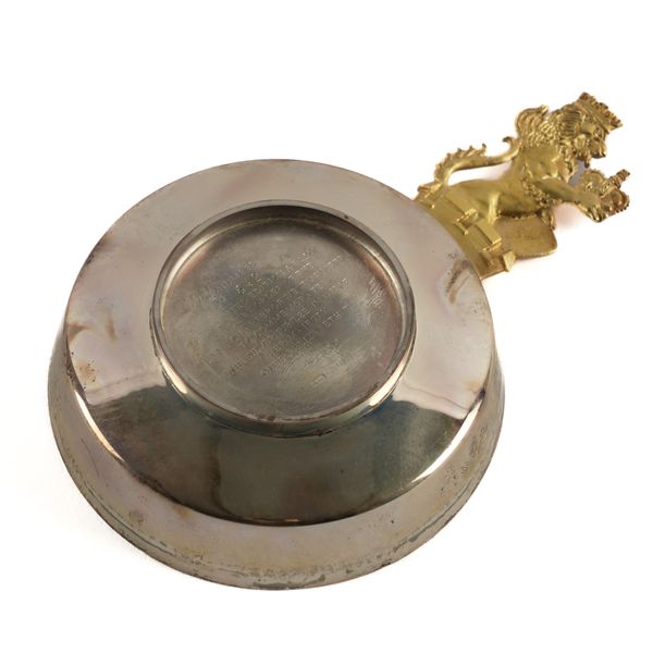 Formed as a circular bowl, the gilt handle cast as a lion wearing a coronet holding a shield and a crown, numbered 642 of a limited edition of 2500, London 1977, diameter excluding handle 11.4cm, weight 261 grams, with the original fitted case