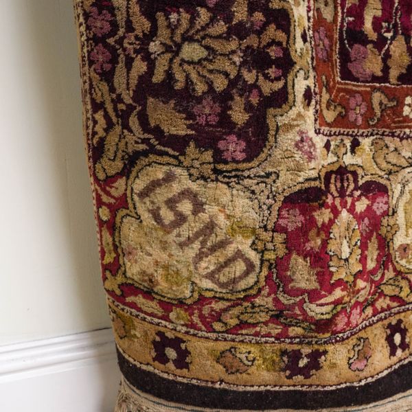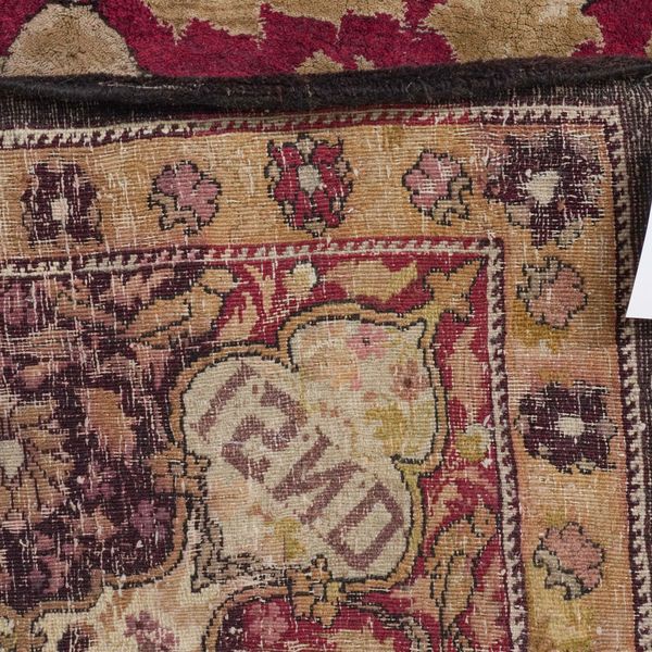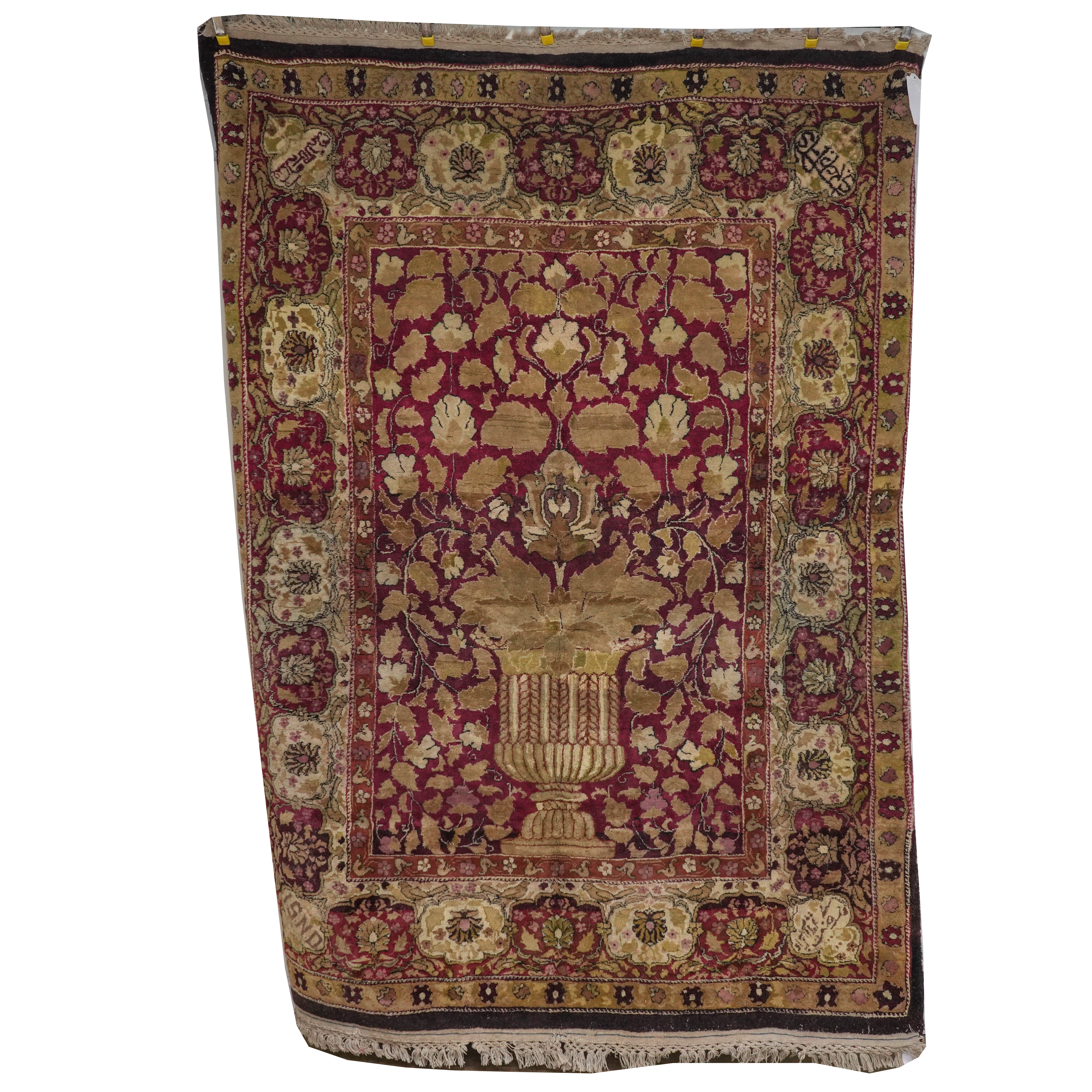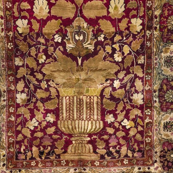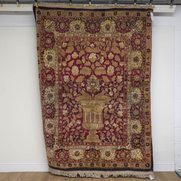 Circa 1880, the burgundy field with a bold urn filled with bold leaves, a large palmette and large, naturalistic floral sprays; a burgundy and ivory shaped border bearing single palmettes, corner inscriptions 262 x 186cm