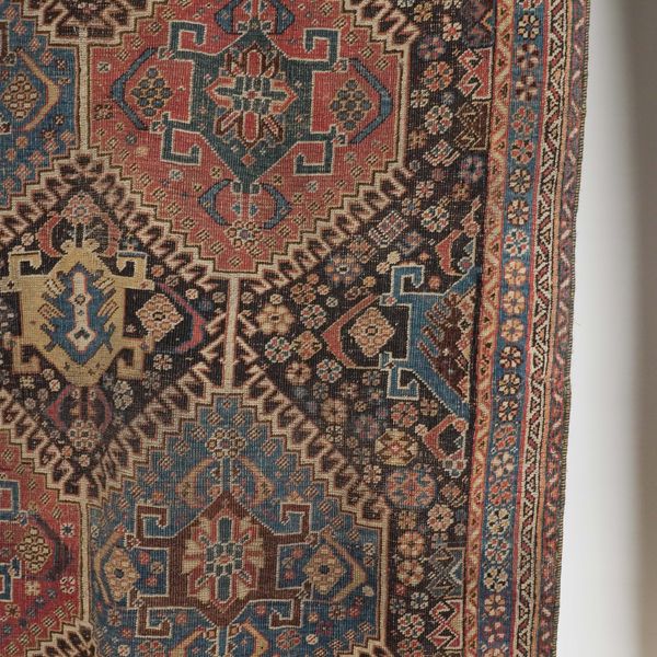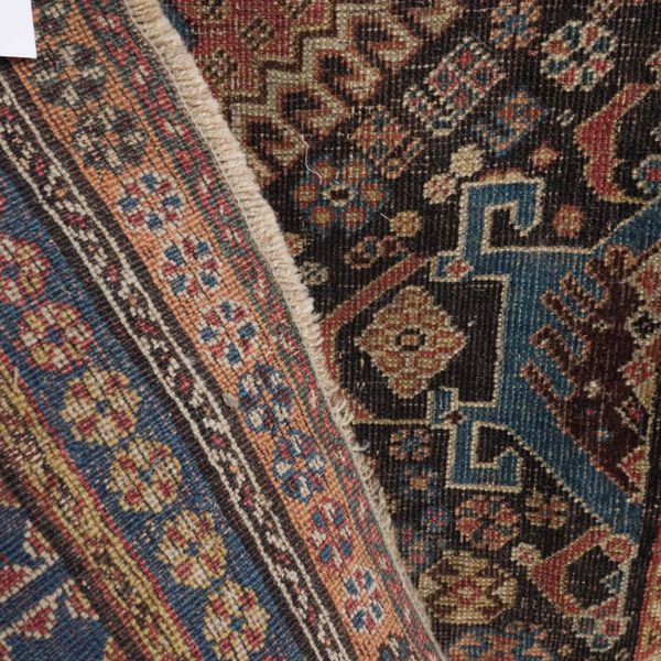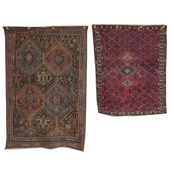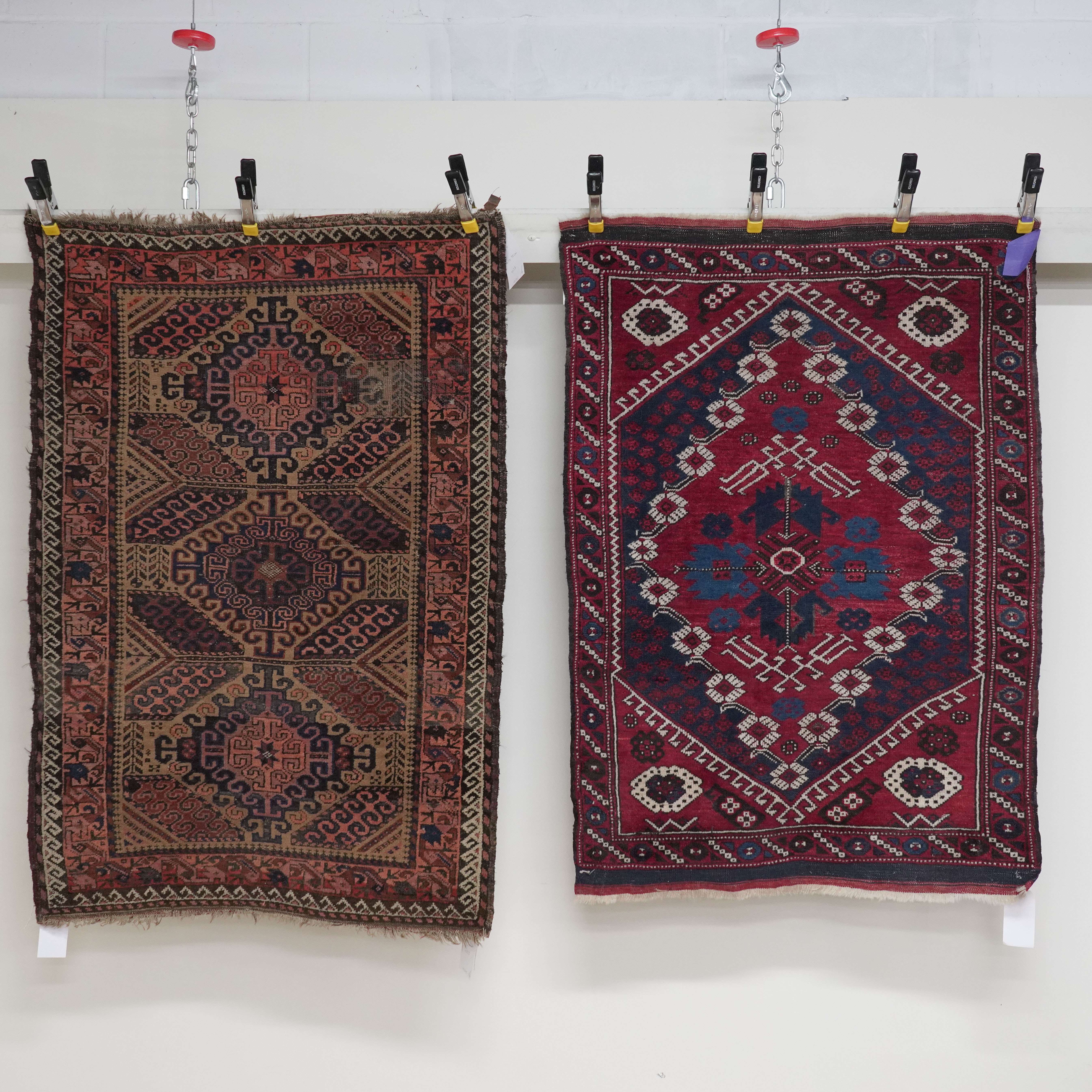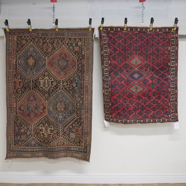 Circa 1940s, the camel field with three hooked medallions; a madder trailing leaf border 147 x 98cm, a Ghashghai rug, Persian, the dark brown field with four joining hooked medallions each with a single "crab" medallion, other minor motifs, 176 x 125cm, circa 1950, a Beluch rug - madder field filled with stylised flowers and three diamonds, 132 x 105cm, circa 1950s and a Turkish rug, the indigo flower field with a large madder diamond with central motif and madder spandrels, 137 x 95cm, circa 1960s