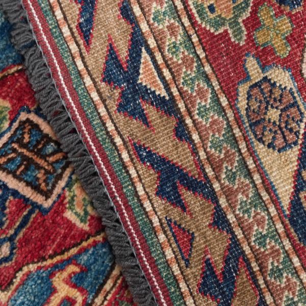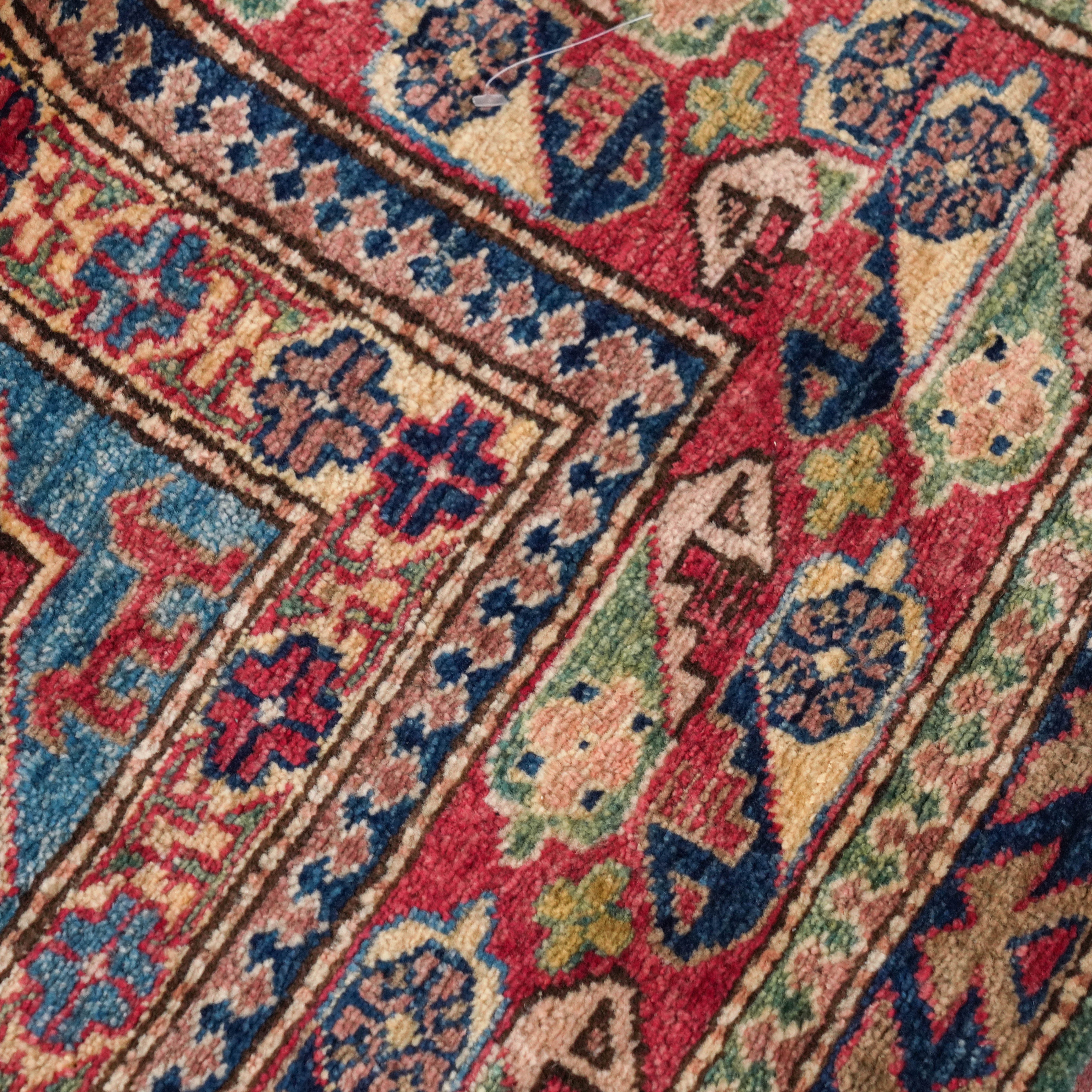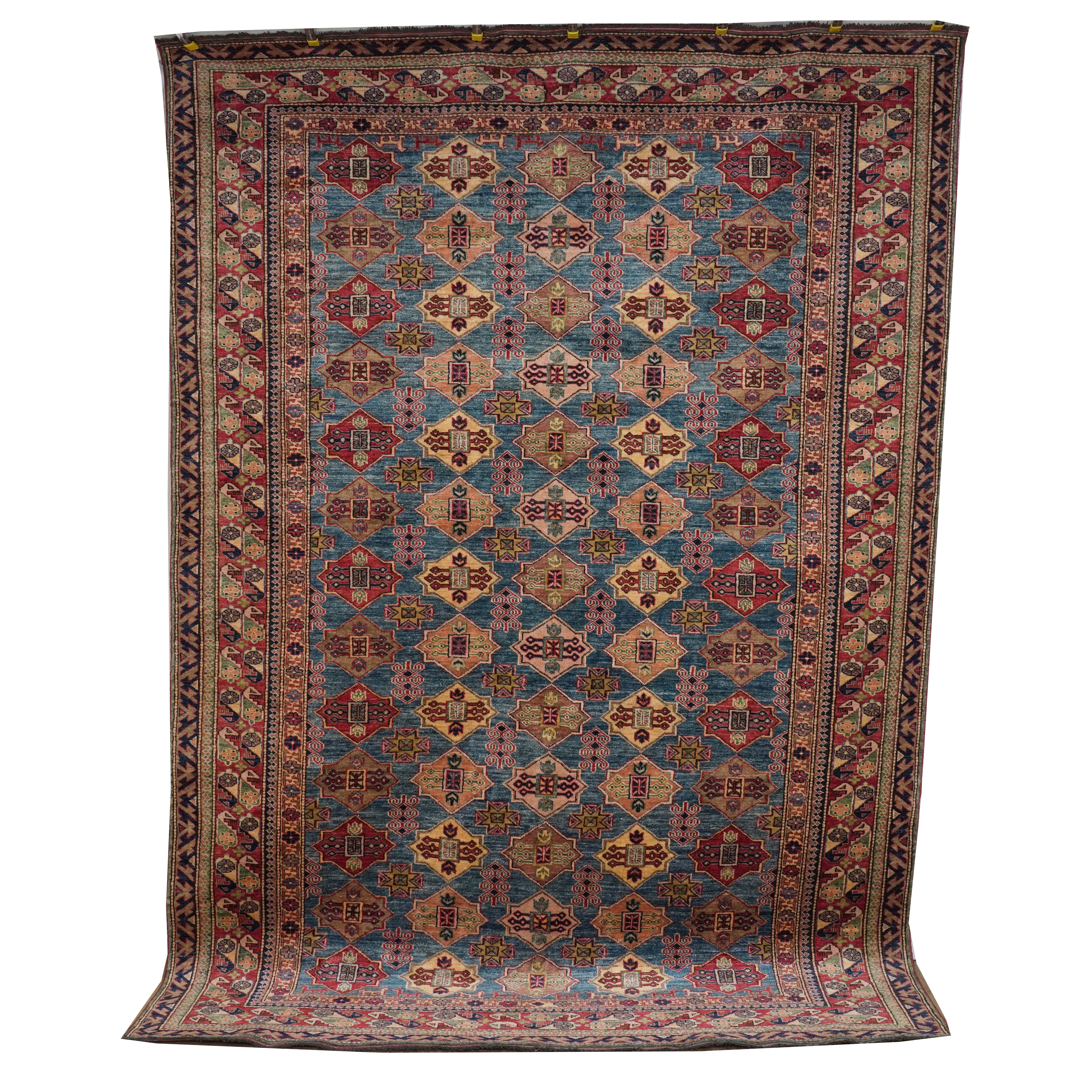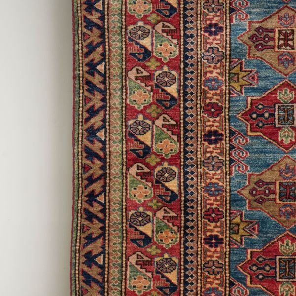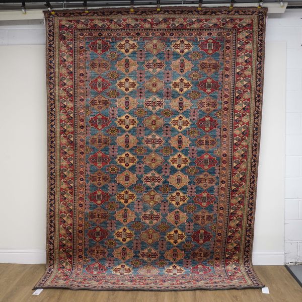 Modern, the pale indigo field with five columns of star medallions in various colours supported by single motifs; an ivory boteh border. 310 x 220 cm